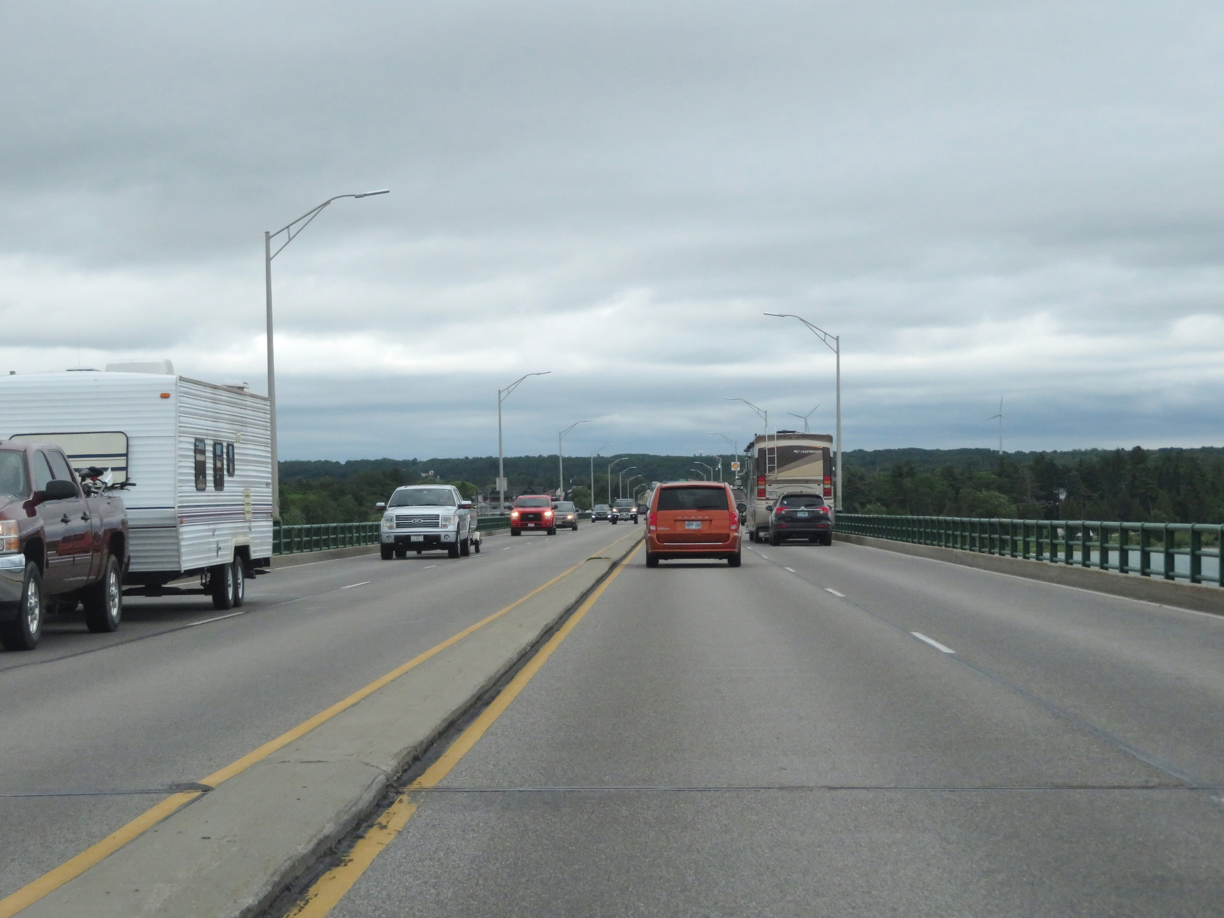 Interstate 75 South as the southern end of the Mackinac Bridge comes into view at Mackinaw City. (Photo taken 7/16/17).  |