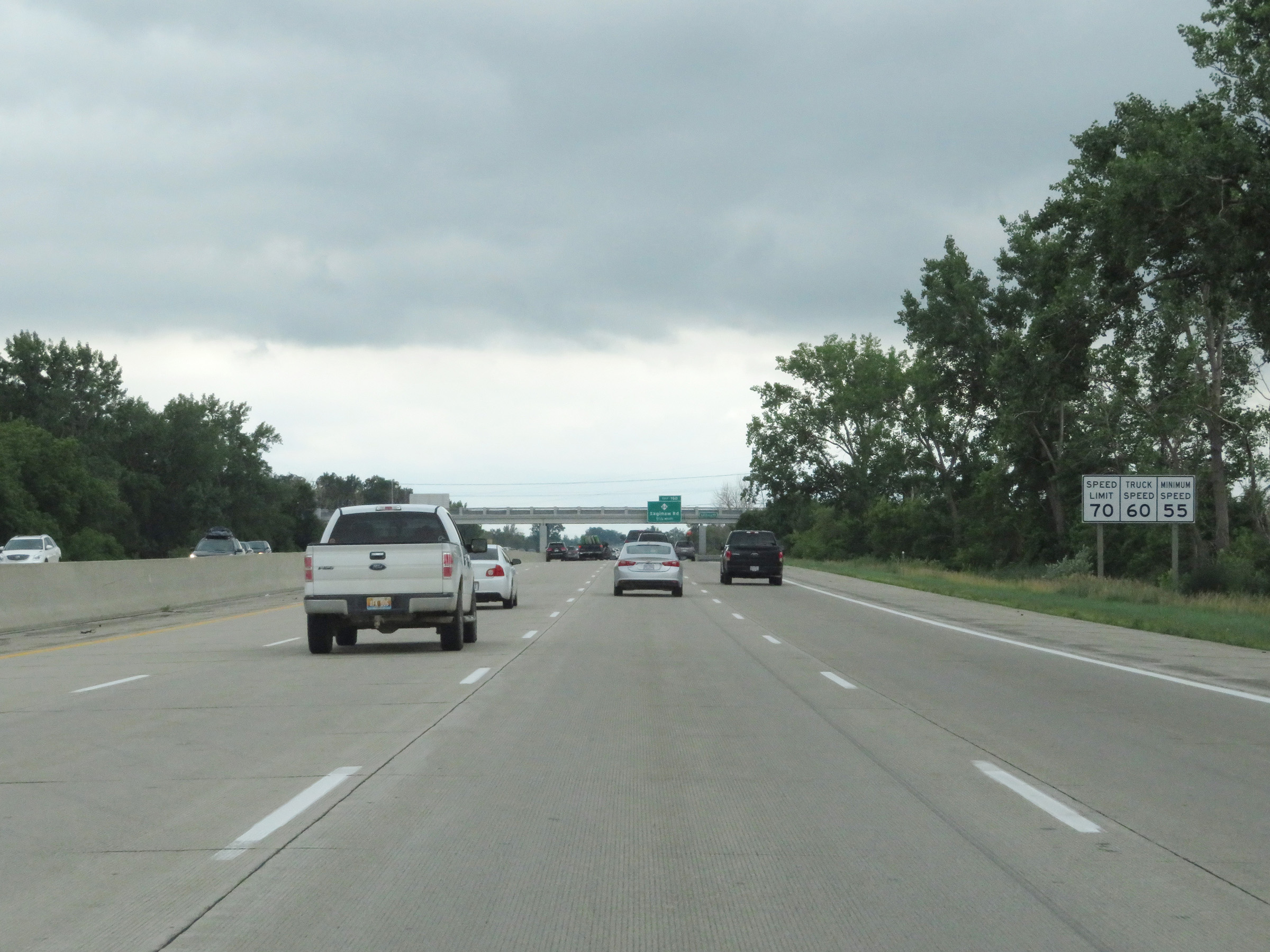 At mile marker 338, the maximum speed limits increase once again to 75 mph for automobiles and 65 mph for trucks. The minimum speed limit for all traffic is 55 mph. (Photo taken 7/16/17).  |