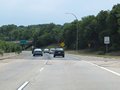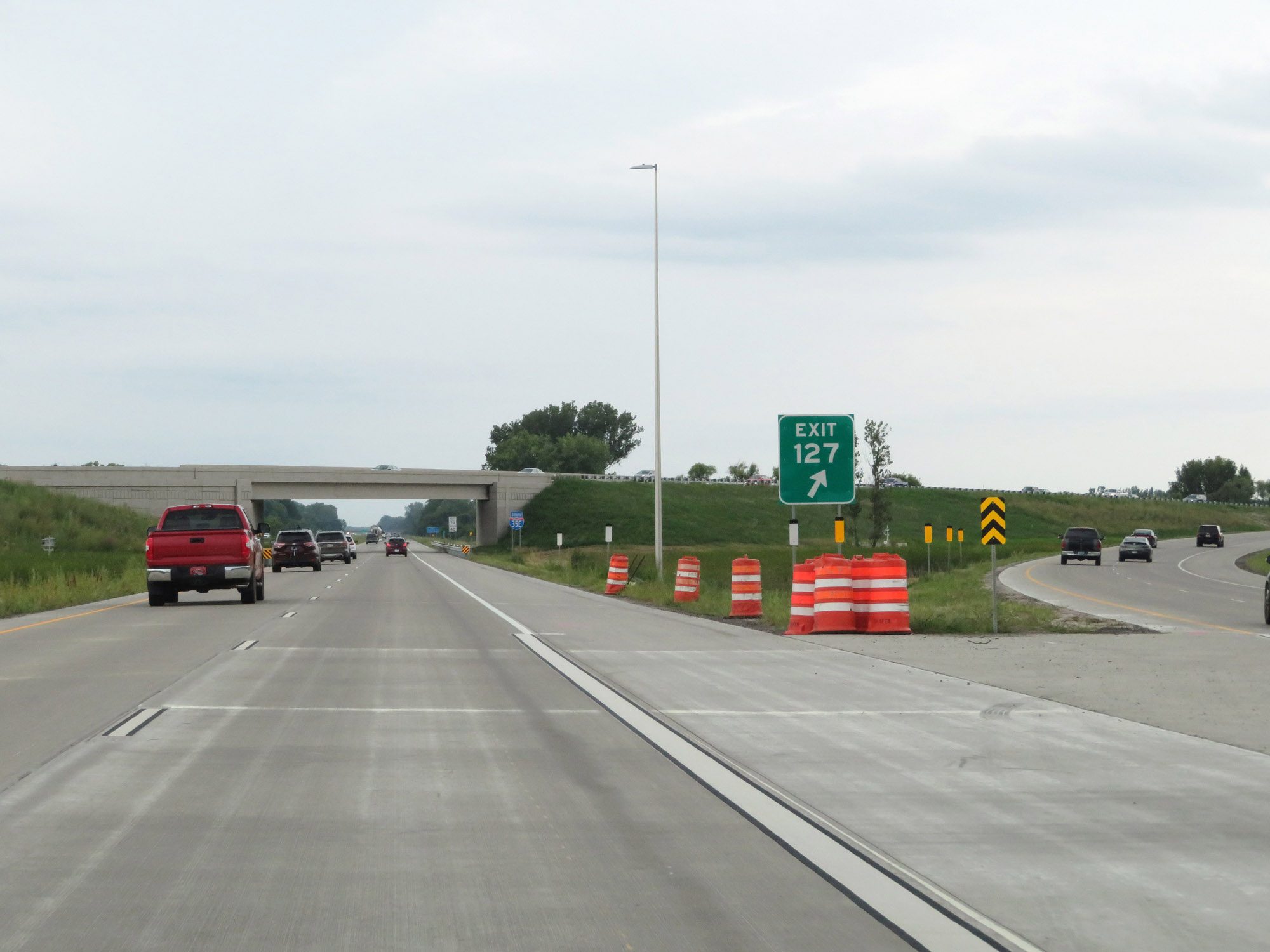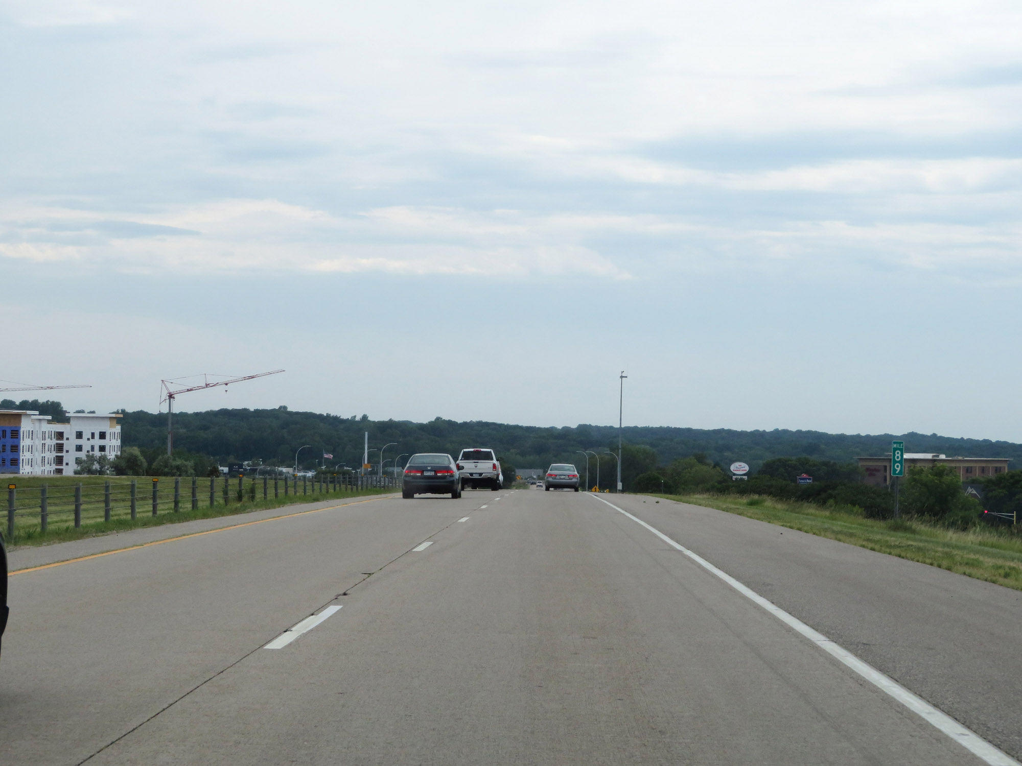 Interstate 35E as it begins at Exit 127 on Interstate 35 South in Columbus. At this point, I-35 South splits into I-35E and I-35 W. You can see the southbound lanes of I-35W to the right. During the 39.5-mile length of I-35E, its mileage and exit numbers are a continuation of those from Interstate 35, since between it and I-35W, I-35E is shorter and a slightly more direct route south. (Photo taken 8/7/20). |