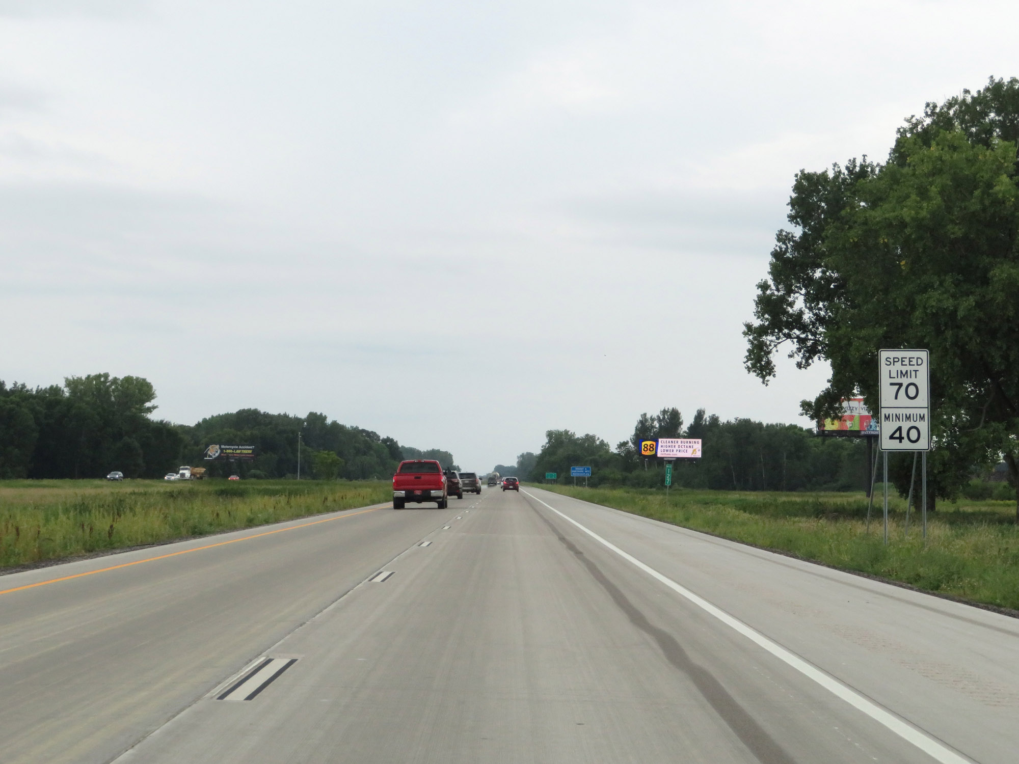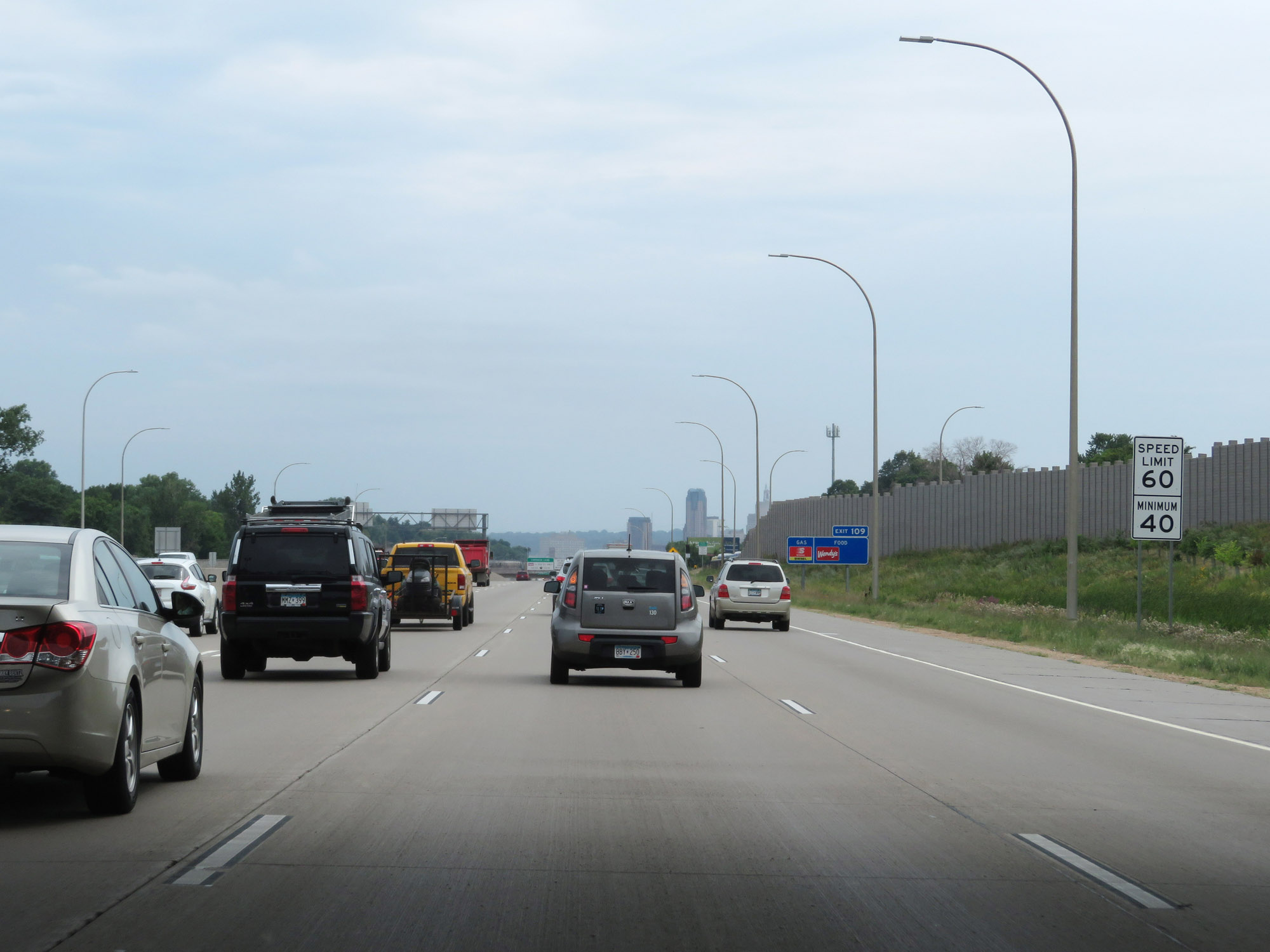 South of Exit 109, the maximum speed limit decreases to 55 mph approaching downtown. The minimum speed limit remains 40 mph. (Photo taken 8/7/20). |