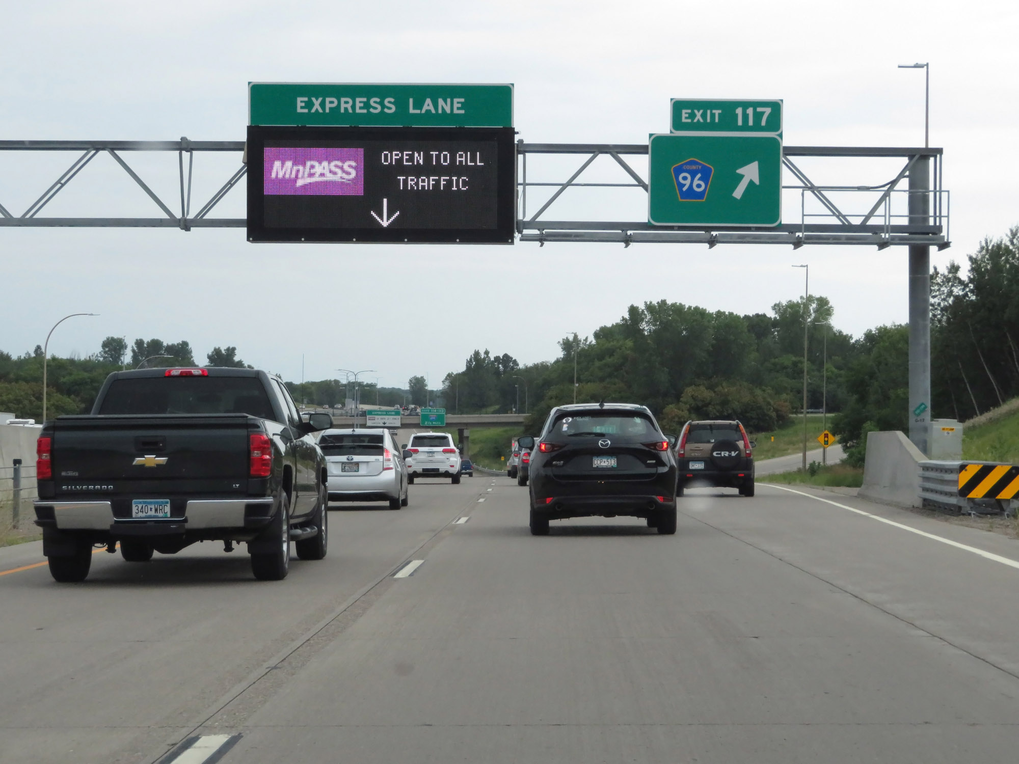 The tolled express lane on Interstate 35E South requires MnPass for electronic toll payment. High occupancy vehicles of 2 or more are exempt from the toll. The tolls and restricted use of this lane are in effect Monday thru Friday from 6AM to 10AM. (Photo taken 8/7/20). |
