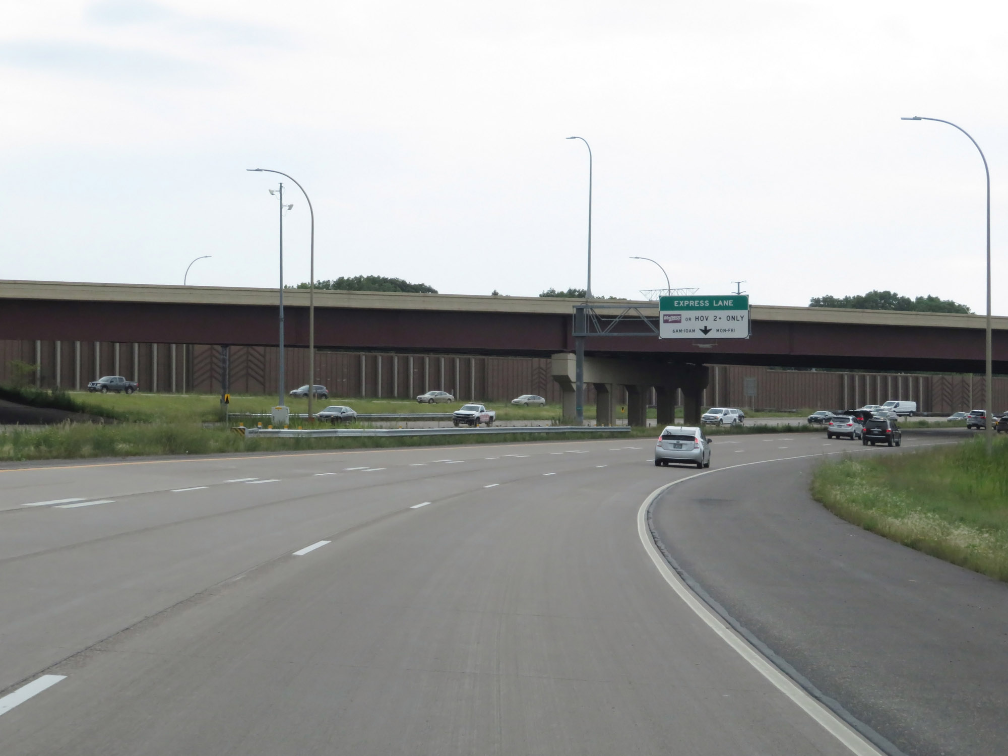 Like other Interstates in the Twin Cities area, Interstate 35E also has a tolled express / HOV lane which starts 1 mile ahead. (Photo taken 8/7/20). |
