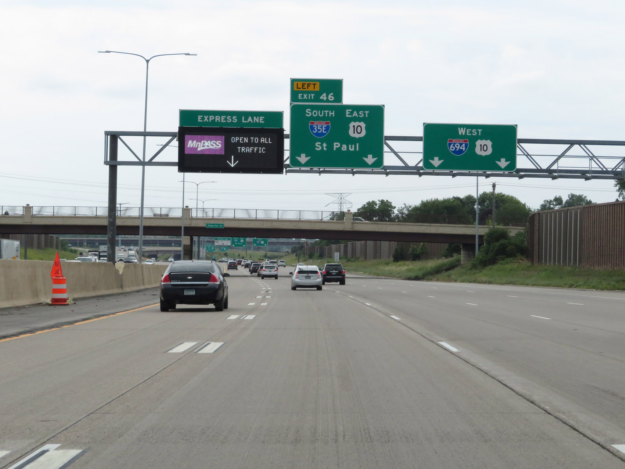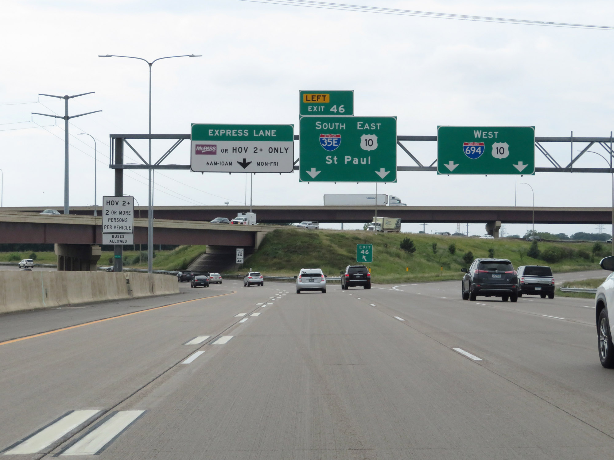 Interstate 35E South / Interstate 694 West at Exit 46: Interstate 35E South - St Paul (Photo taken 8/7/20). |