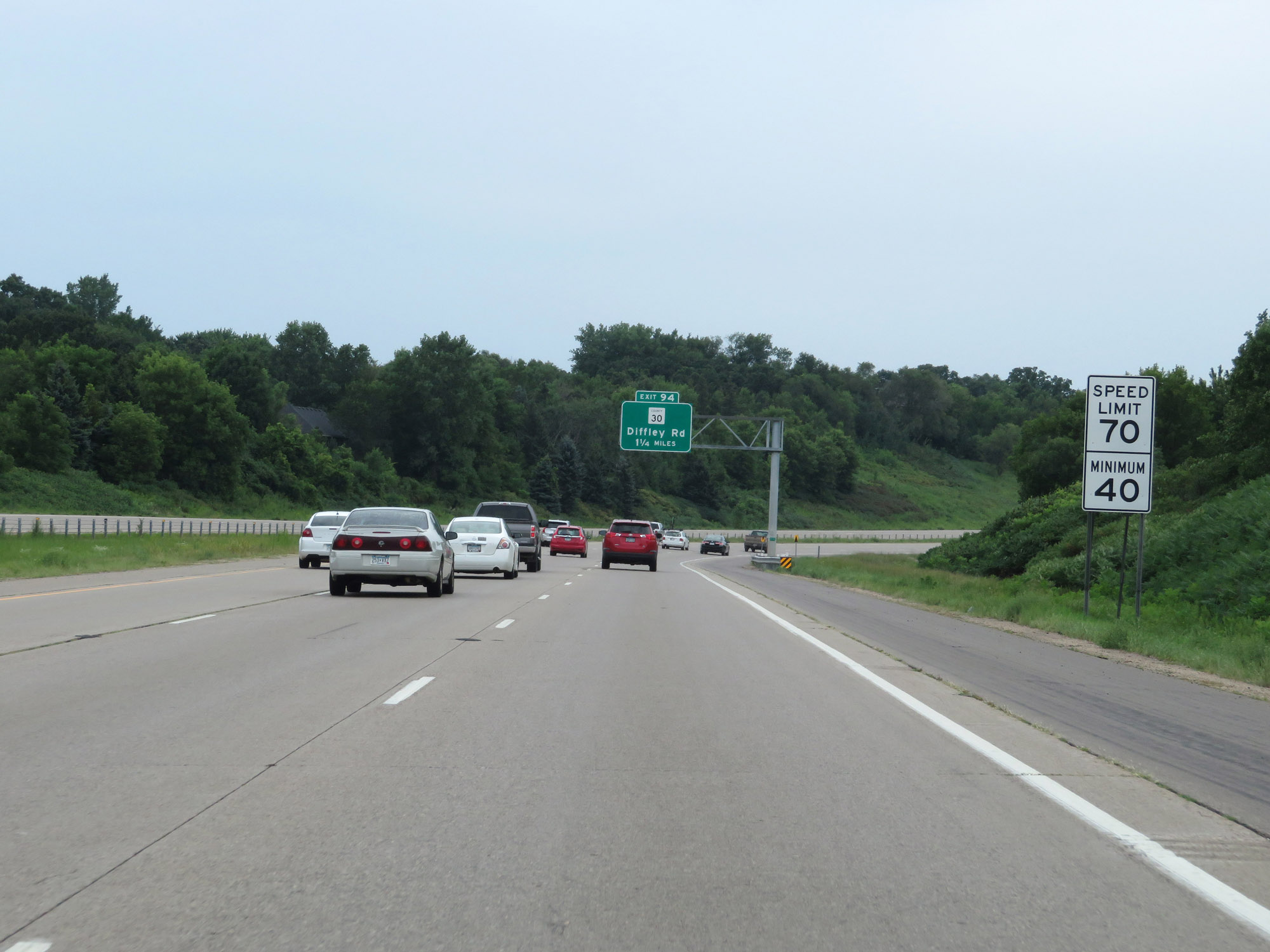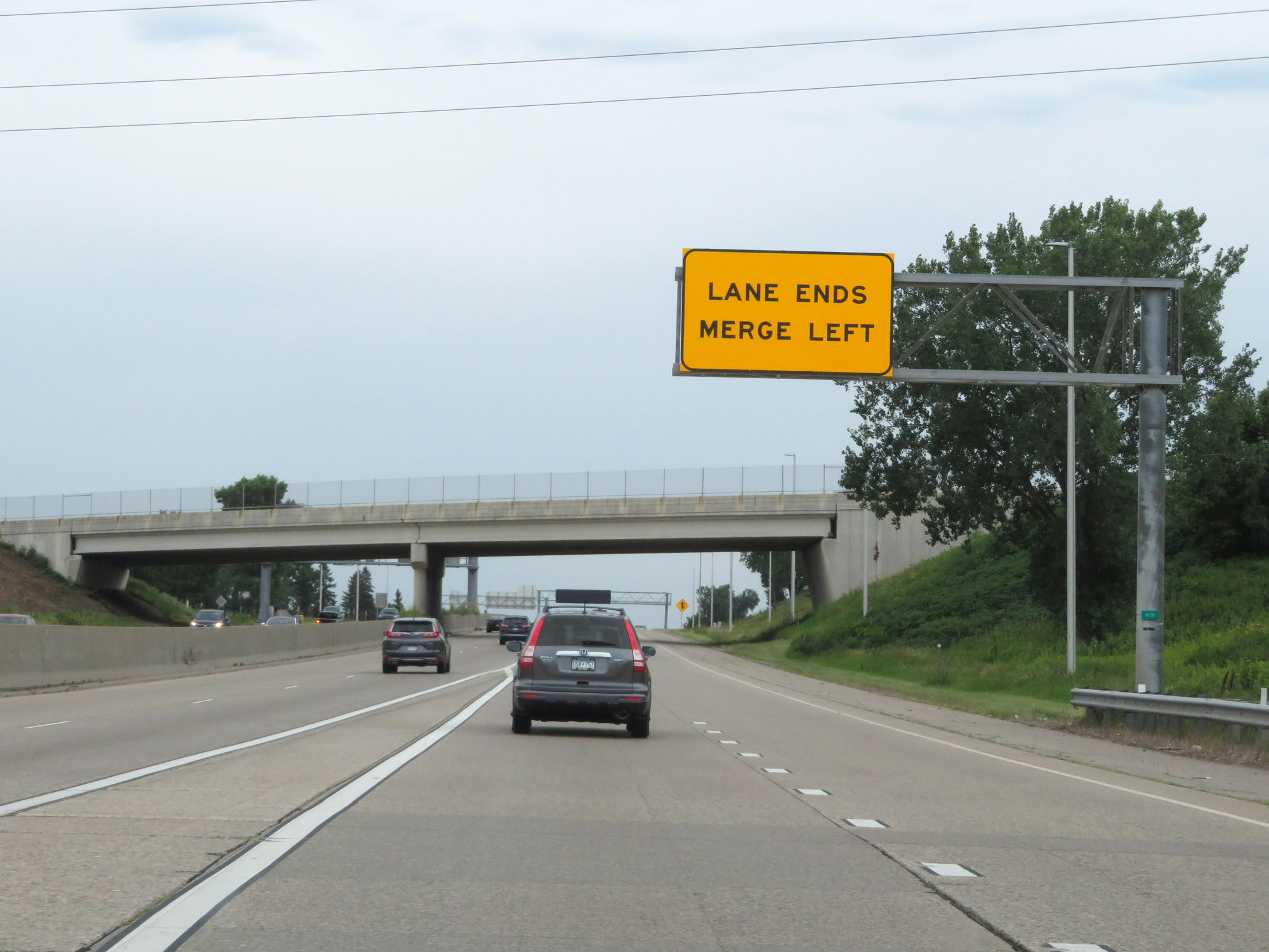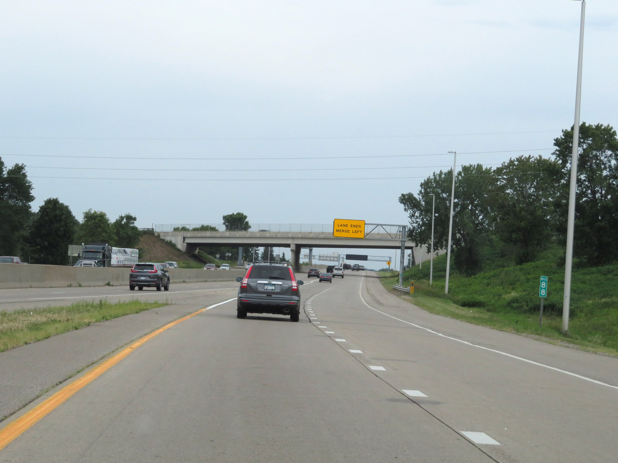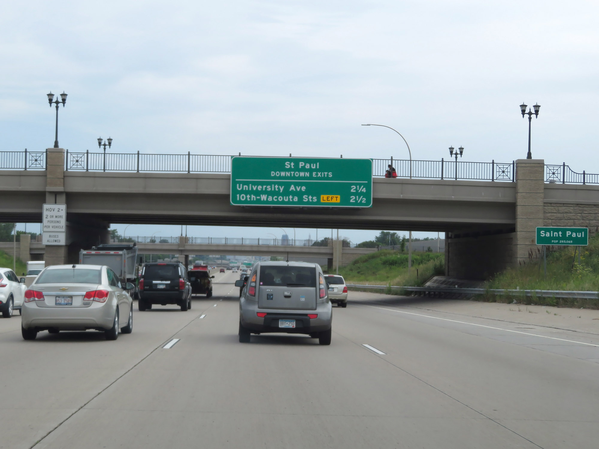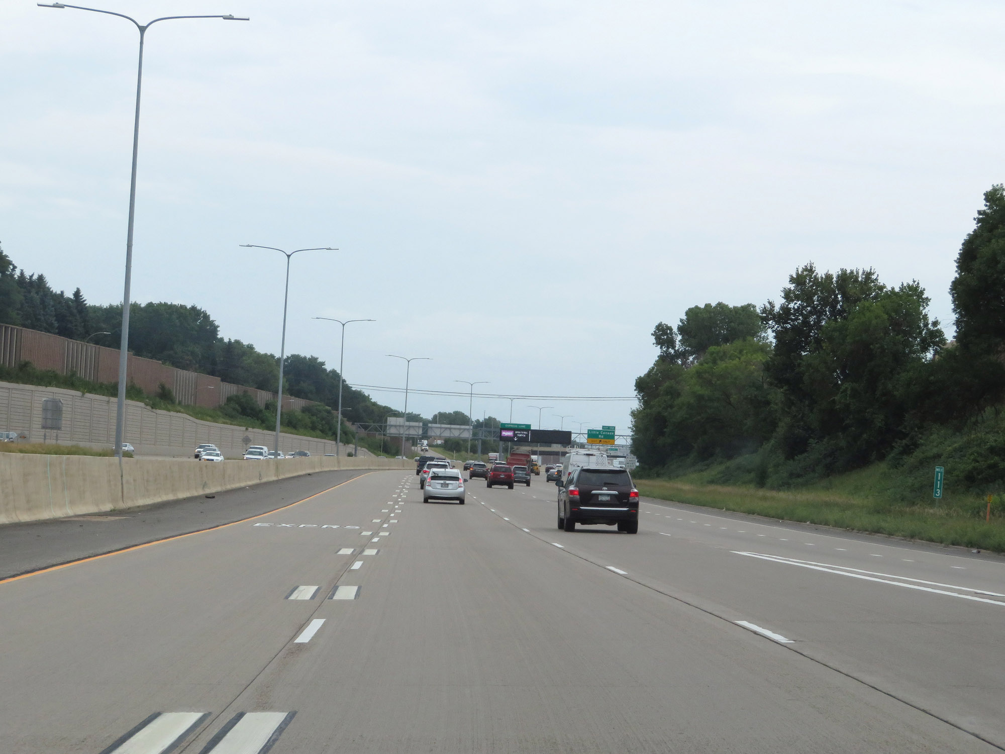 Interstate 35E South thru traffic should keep to the left (in the two leftmost lanes) during this brief concurrency with Interstate 94 West. During the concurrency, the mileage and exit numbers are based on the mileage of I-94. (Photo taken 8/7/20). |