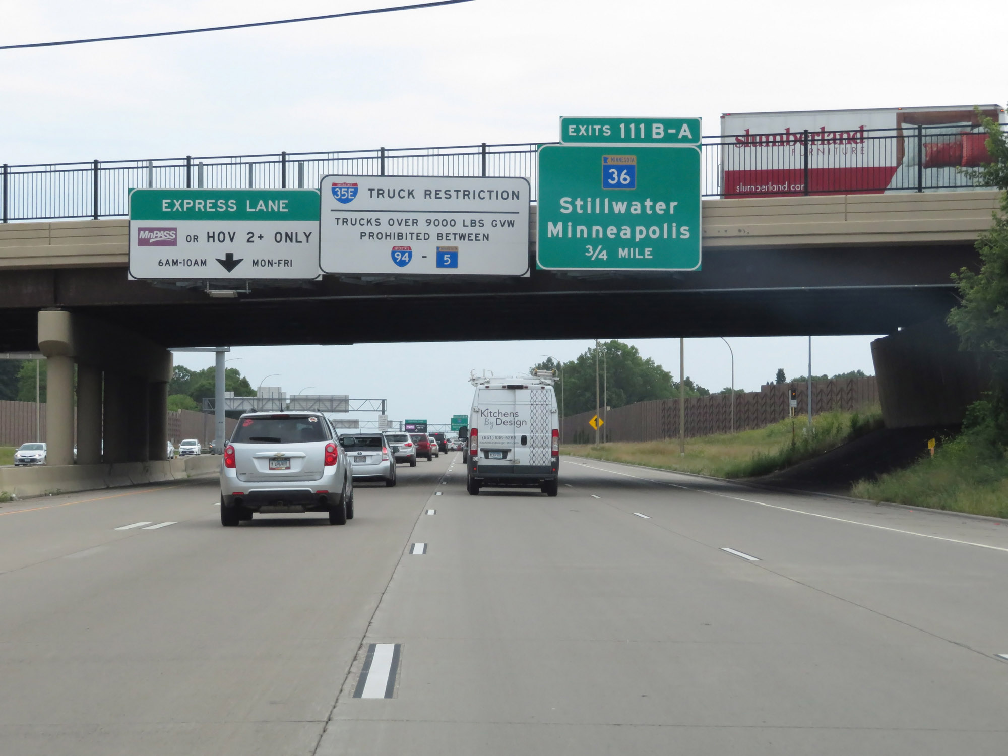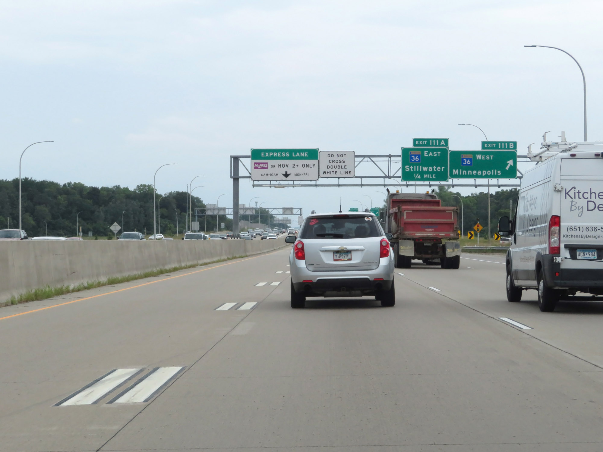 Interstate 35E South at Exit 111A: MN 36 East - Stillwater (Photo taken 8/7/20). |