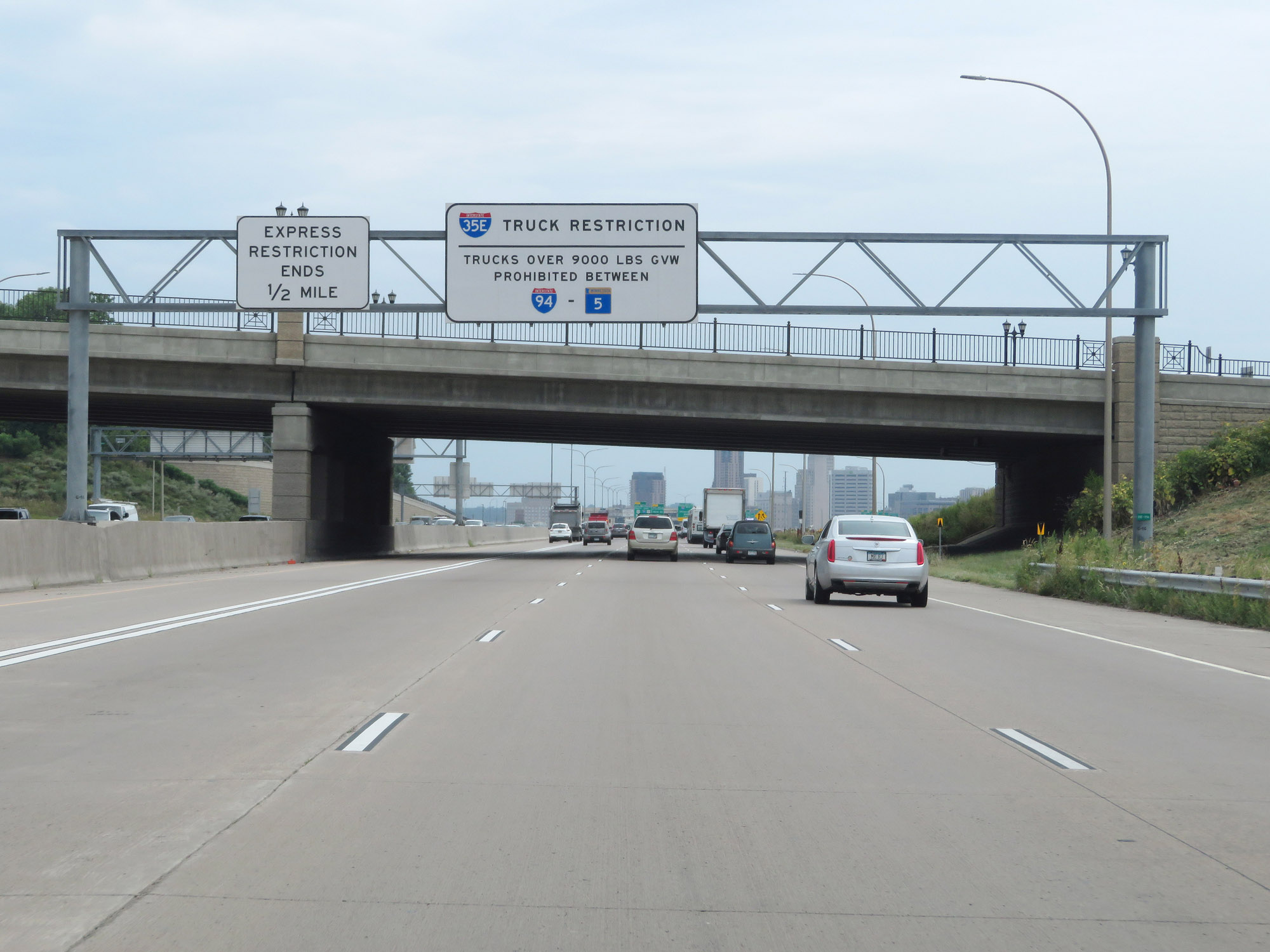 As Interstate 35E South curves to the west in preparation for a brief concurrency with Interstate 94 West (similar to its previous concurrency with Interstate 694 West), we get another warning that trucks over 9,000 GVW are prohibited on I-35E South beyond this point. Trucks over this weight (which includes almost all of them) should remain on Interstate 94 West to Interstate 35W South. (Photo taken 8/7/20). |