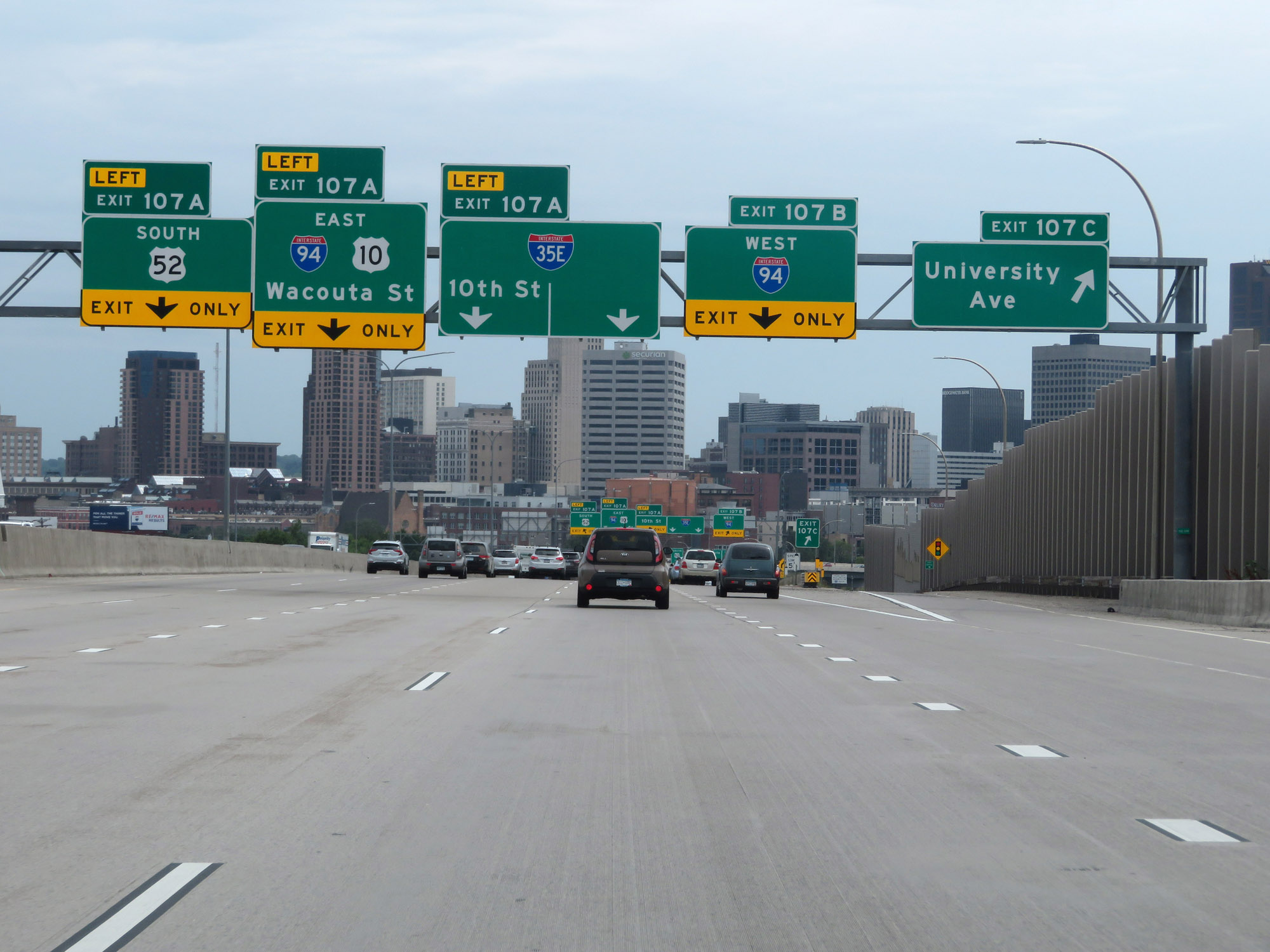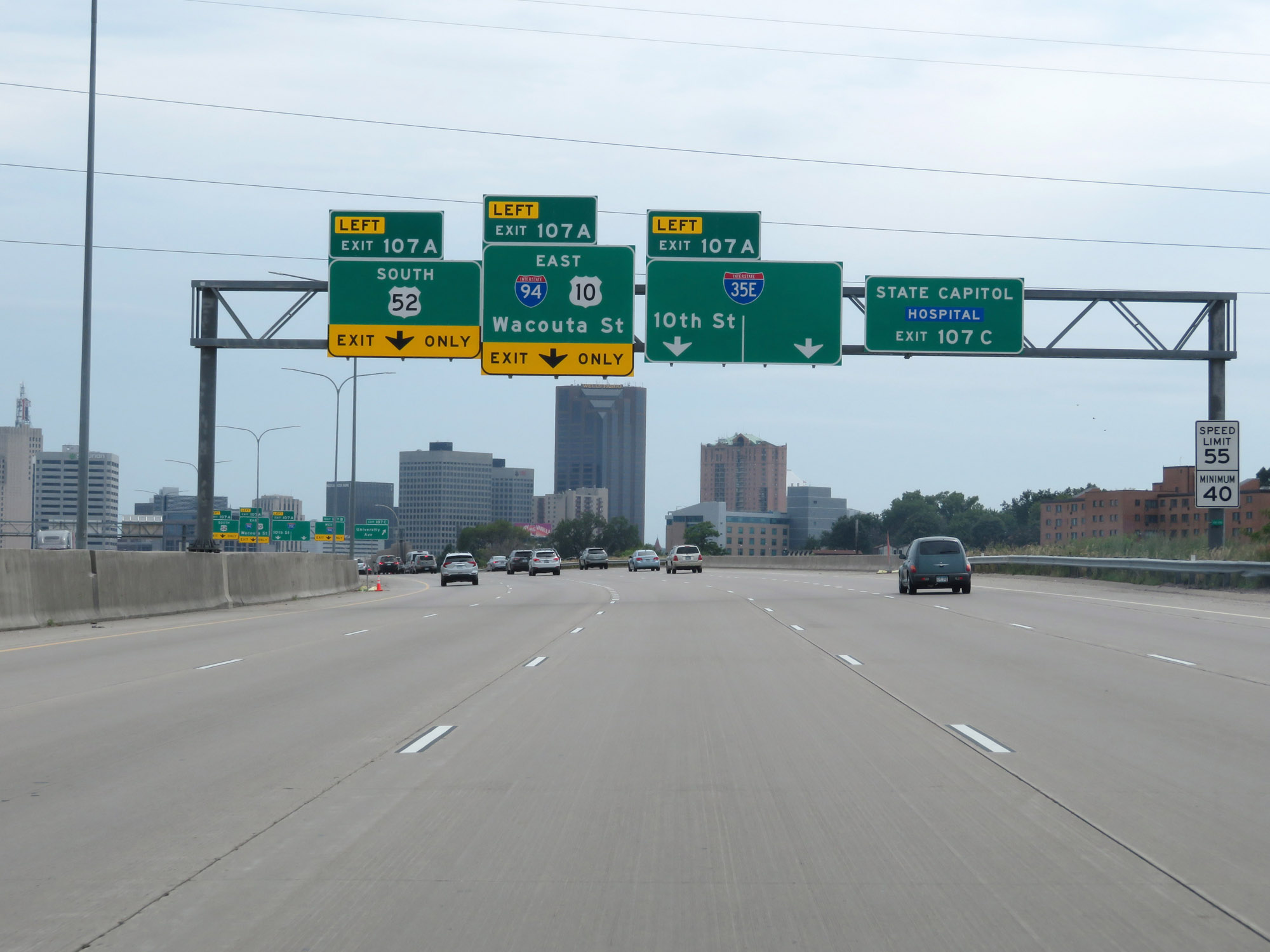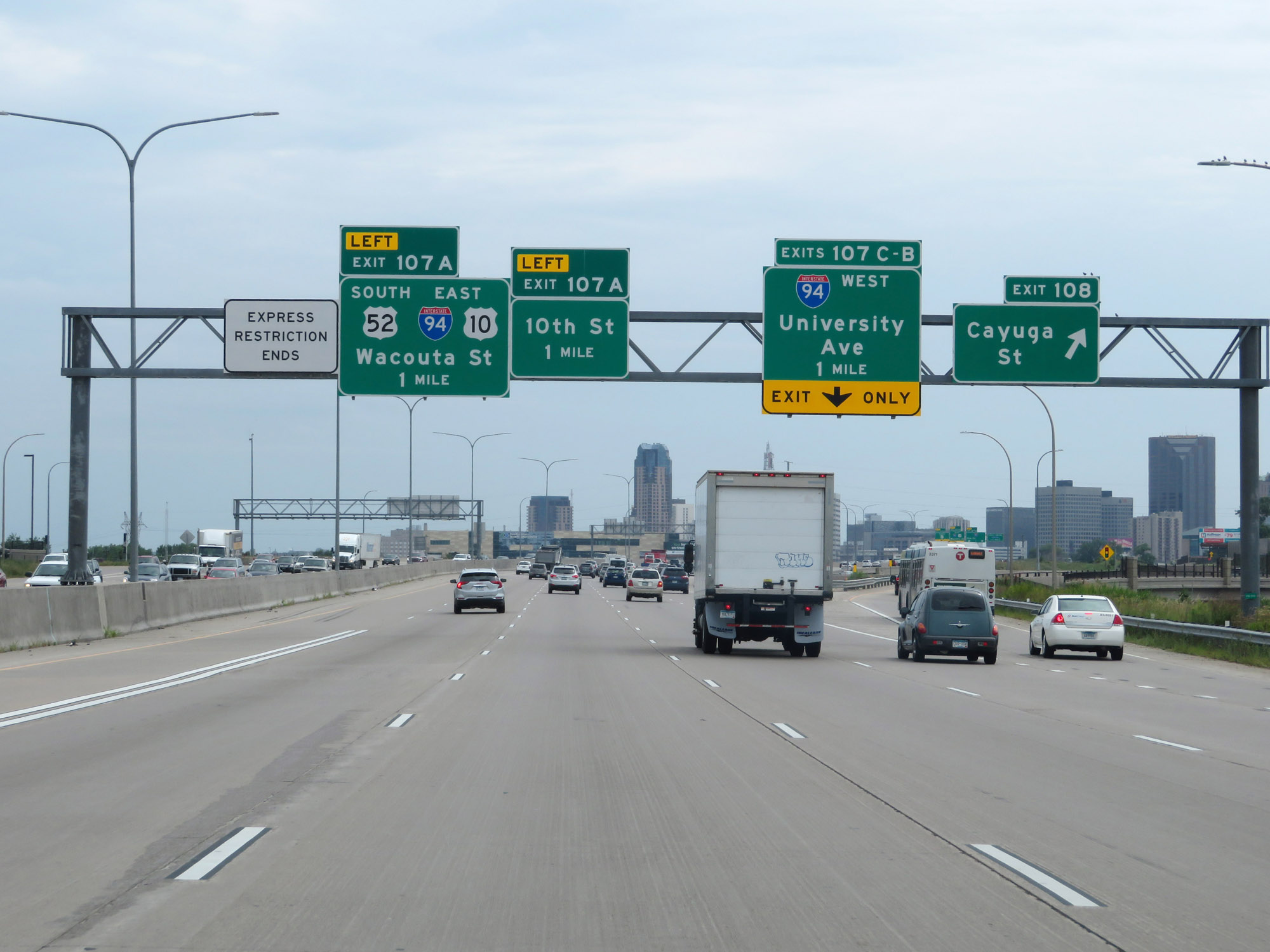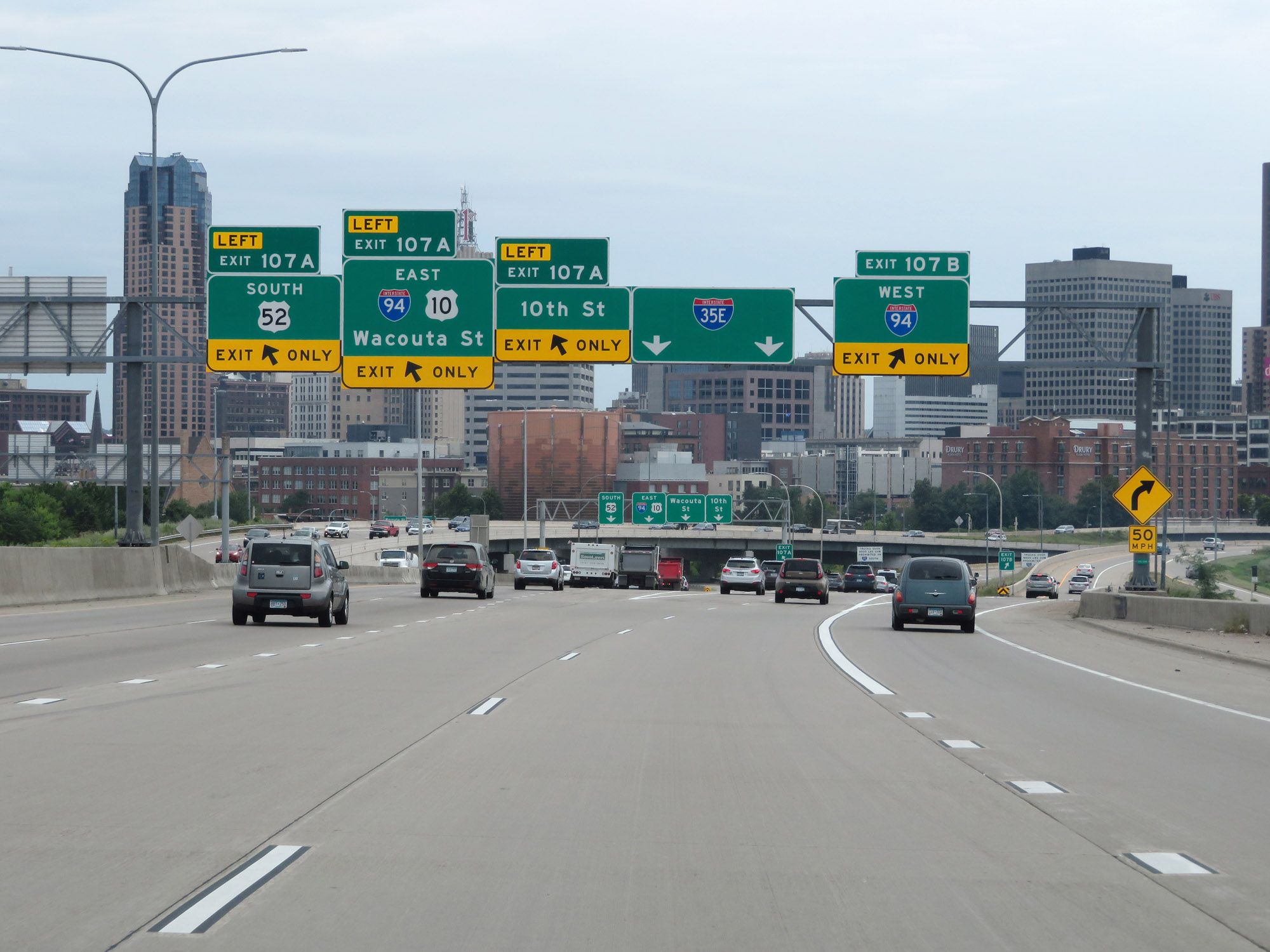 Interstate 35E South at Exit 107B: Interstate 94 West; Exit 107A: Interstate 94 East / US 10 East / US 52 South - Wacouta St / 10th St (Photo taken 8/7/20). |