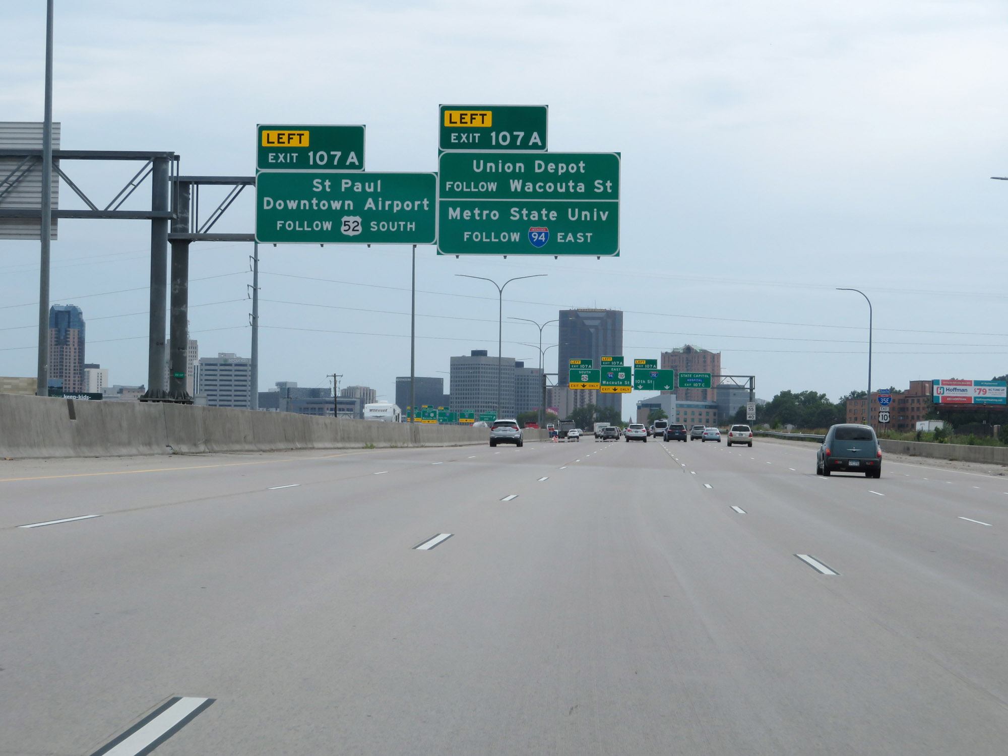 Take Exit 107A and follow US 52 South to St Paul Downtown Airport. Take Exit 107A and follow Interstate 94 East to Union Depot via Wacouta St and to Metro State University. (Photo taken 8/7/20). |