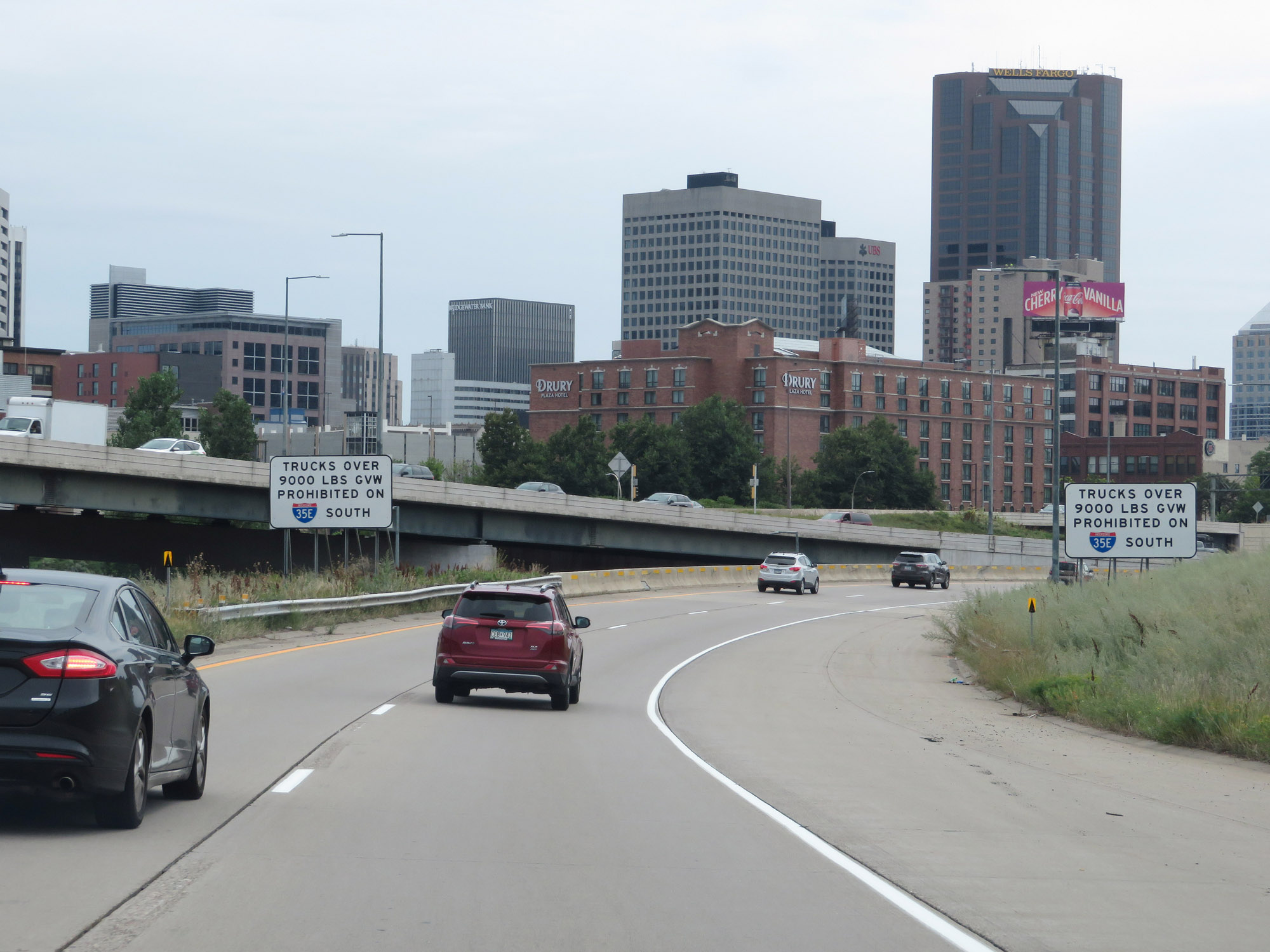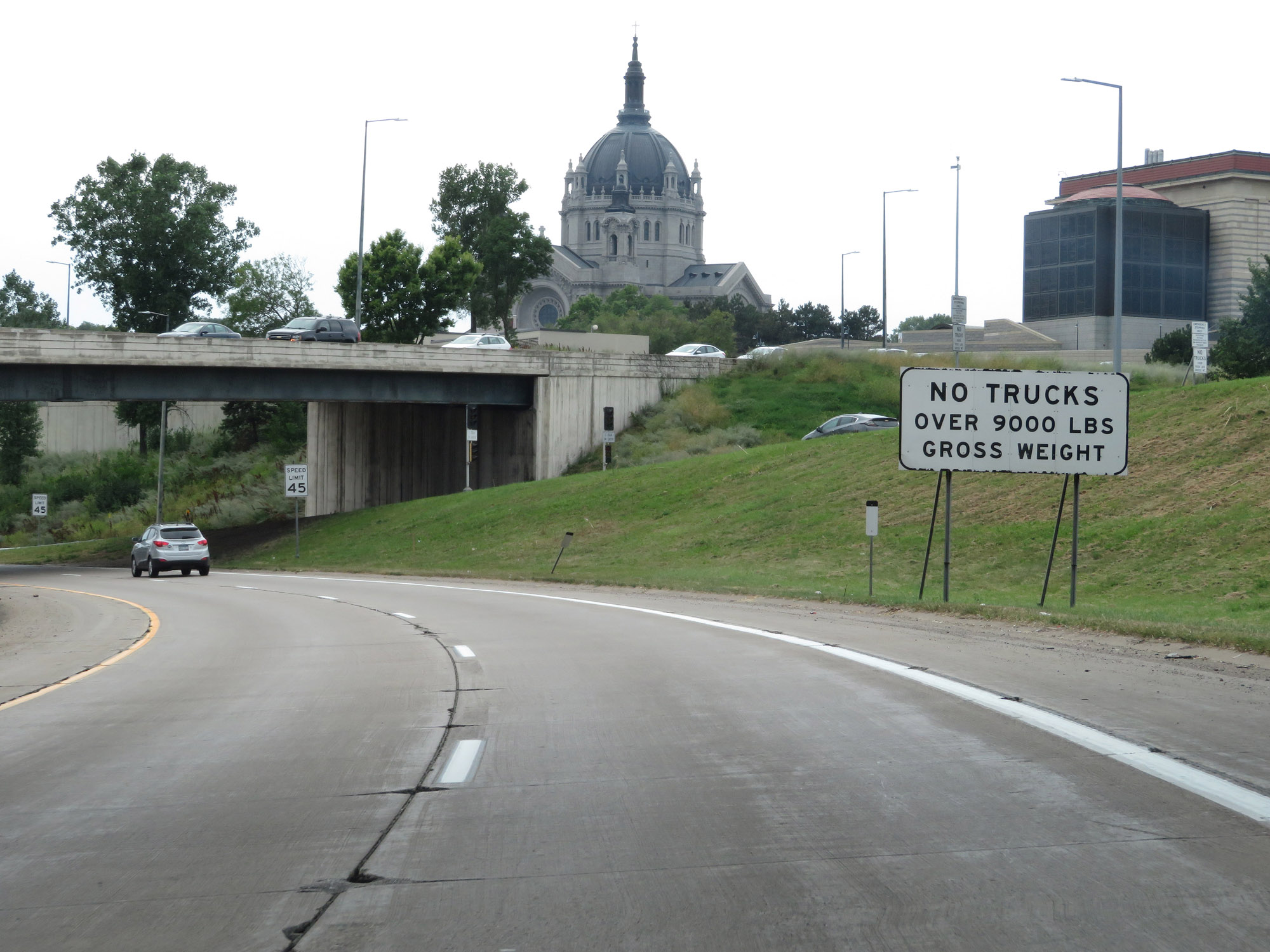 As Interstate 35E South begins to curve to the south once again after departing Interstate 94, we get a nice view of the Cathedral of Saint Paul as well as another sign warning trucks that if they're over 9,000 lbs GVW, they are prohibited from proceeding on I-35E South. (Photo taken 8/7/20). |
