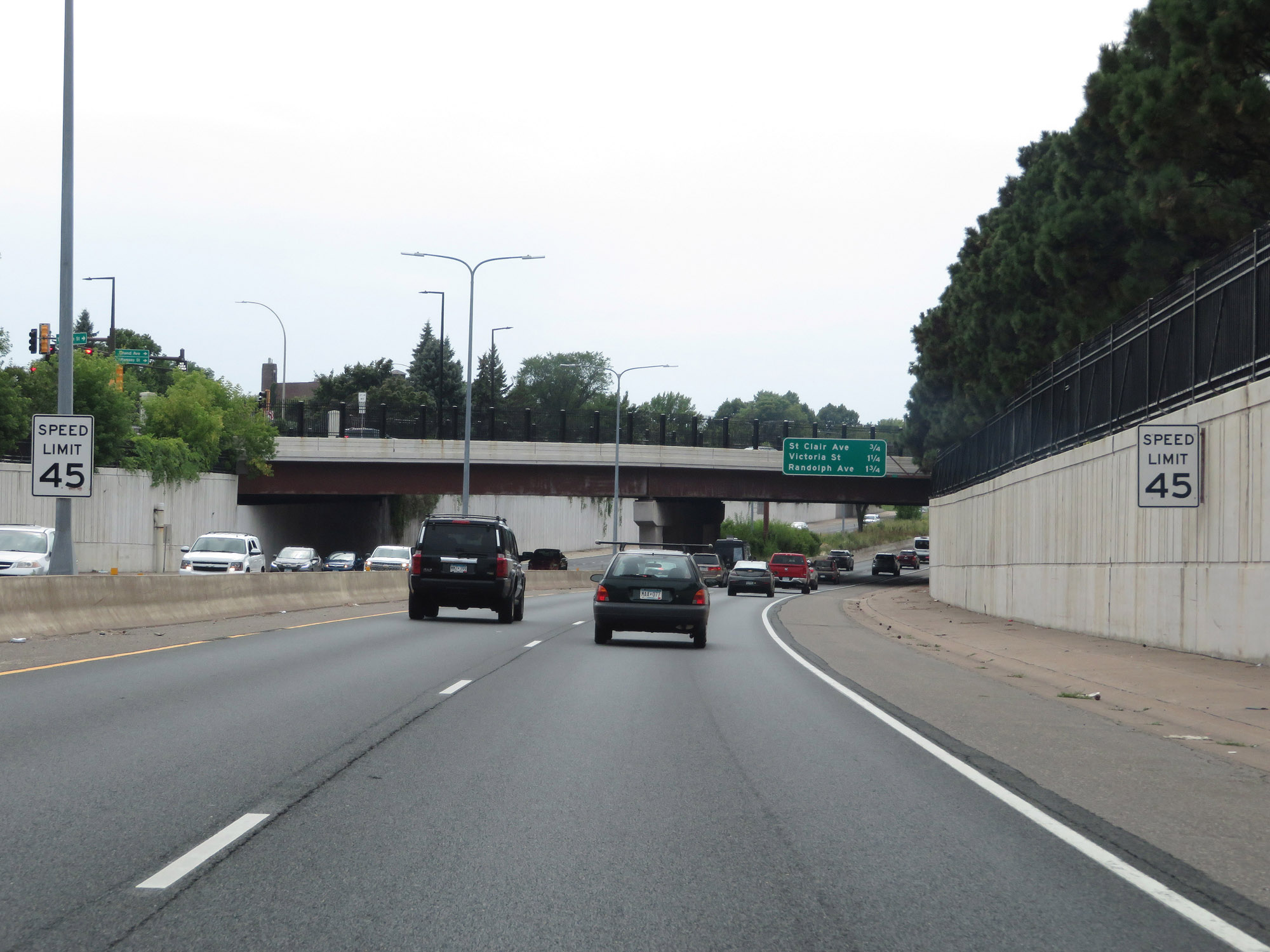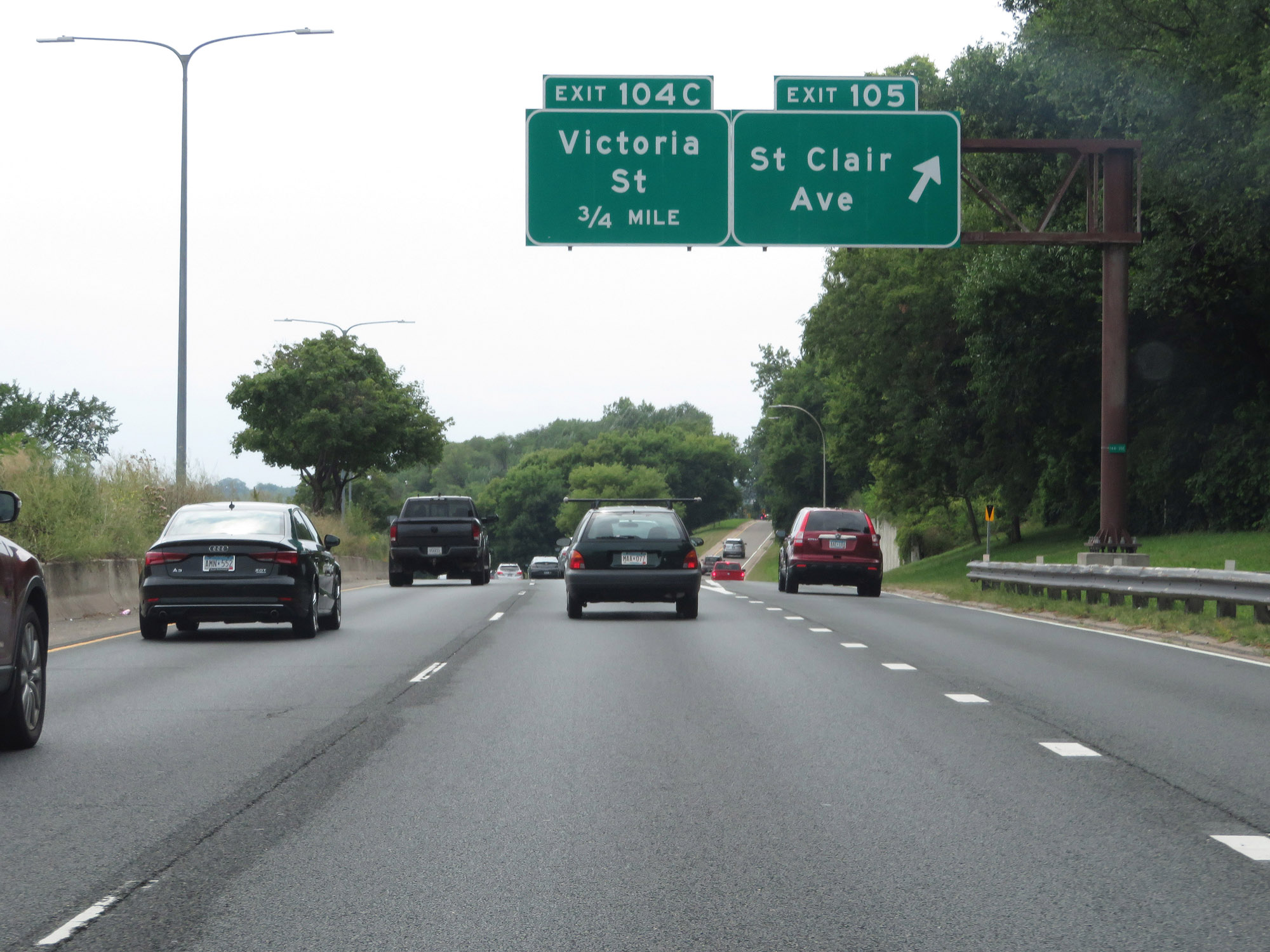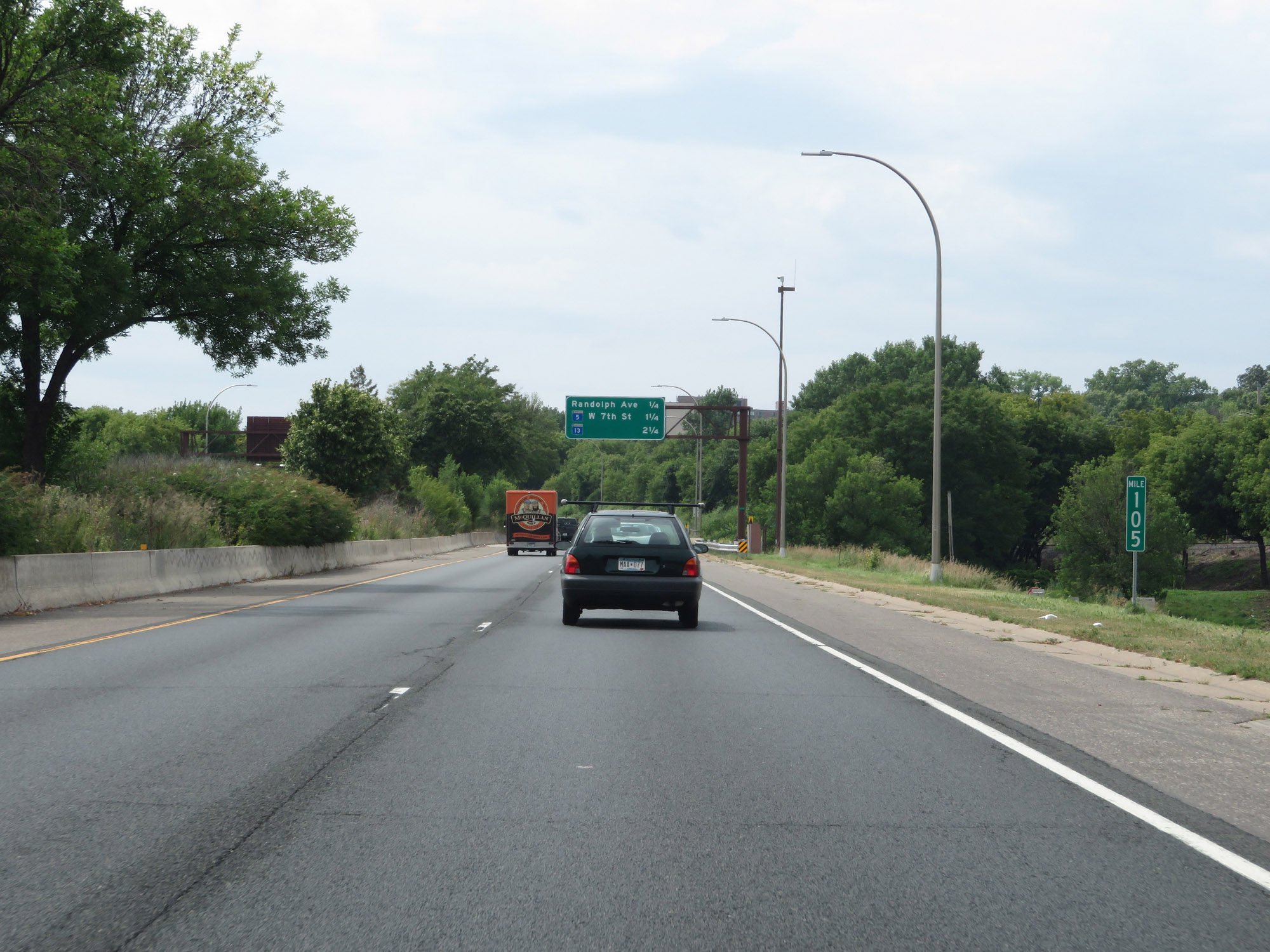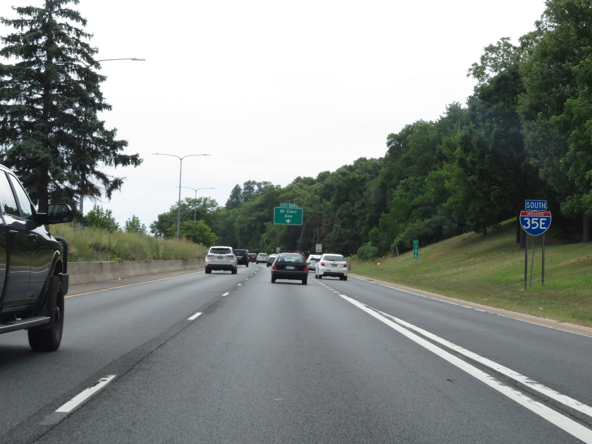 Interstate 35E South at Exit 105: St Clair Ave (Photo taken 8/7/20). |