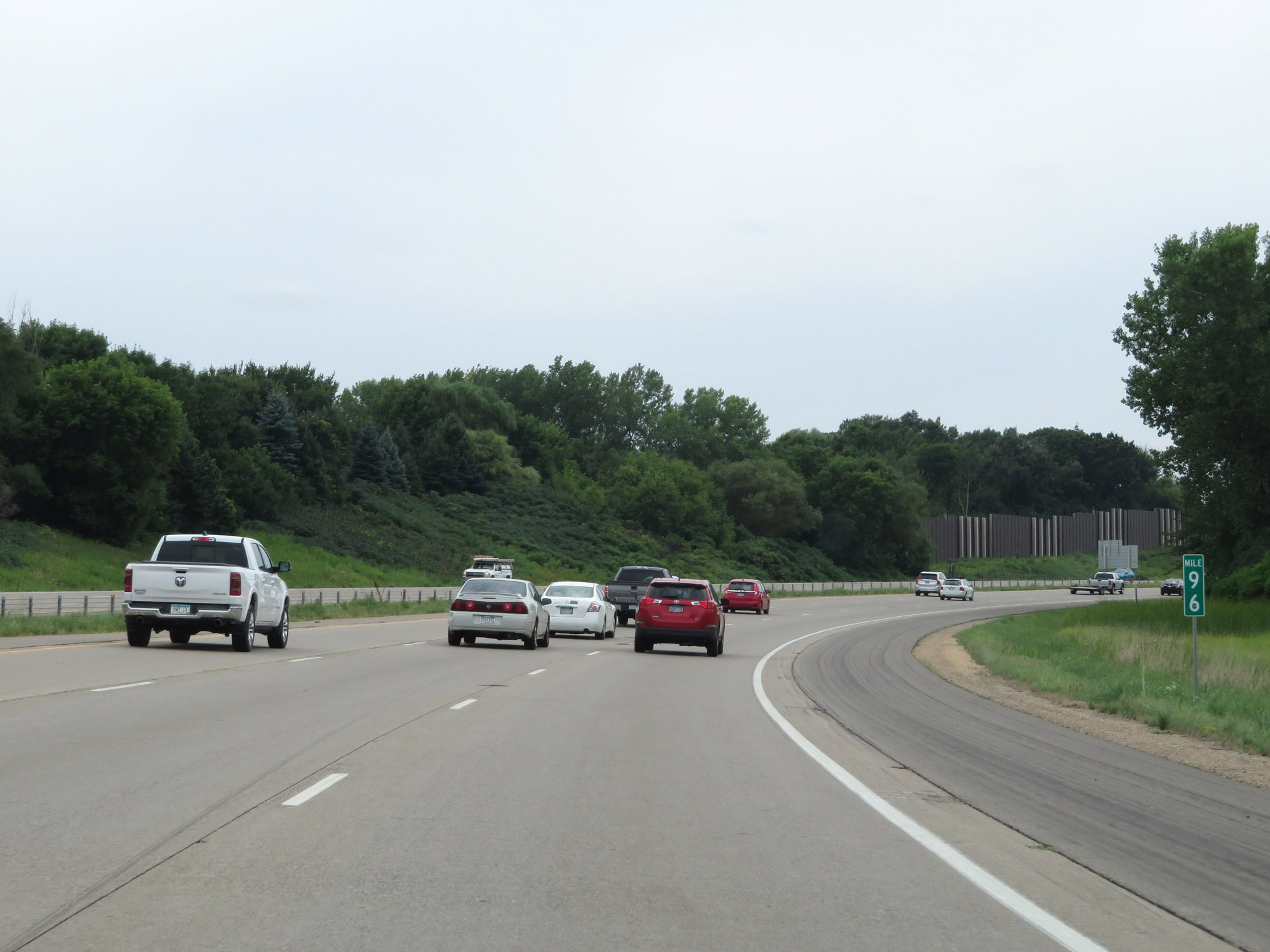 View on Interstate 35E South, now facing westbound, as it prepares to join up with the westbound lanes of Interstate 694 on the right. (Photo taken 8/7/20). |