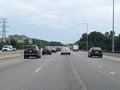 View on Interstate 35E South, now facing westward, as it prepares to briefly merge with the westbound lanes of Interstate 94, seen here on the right. (Photo taken 8/7/20). |