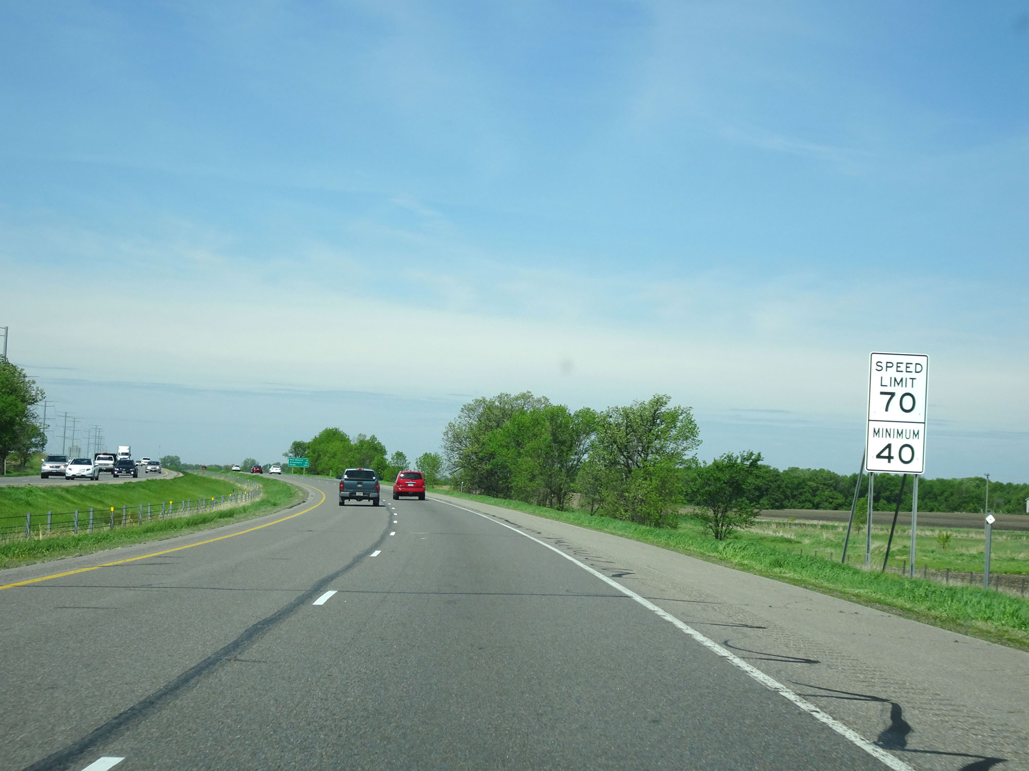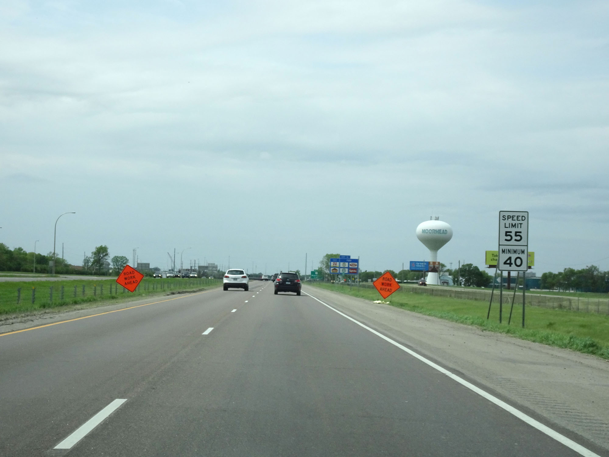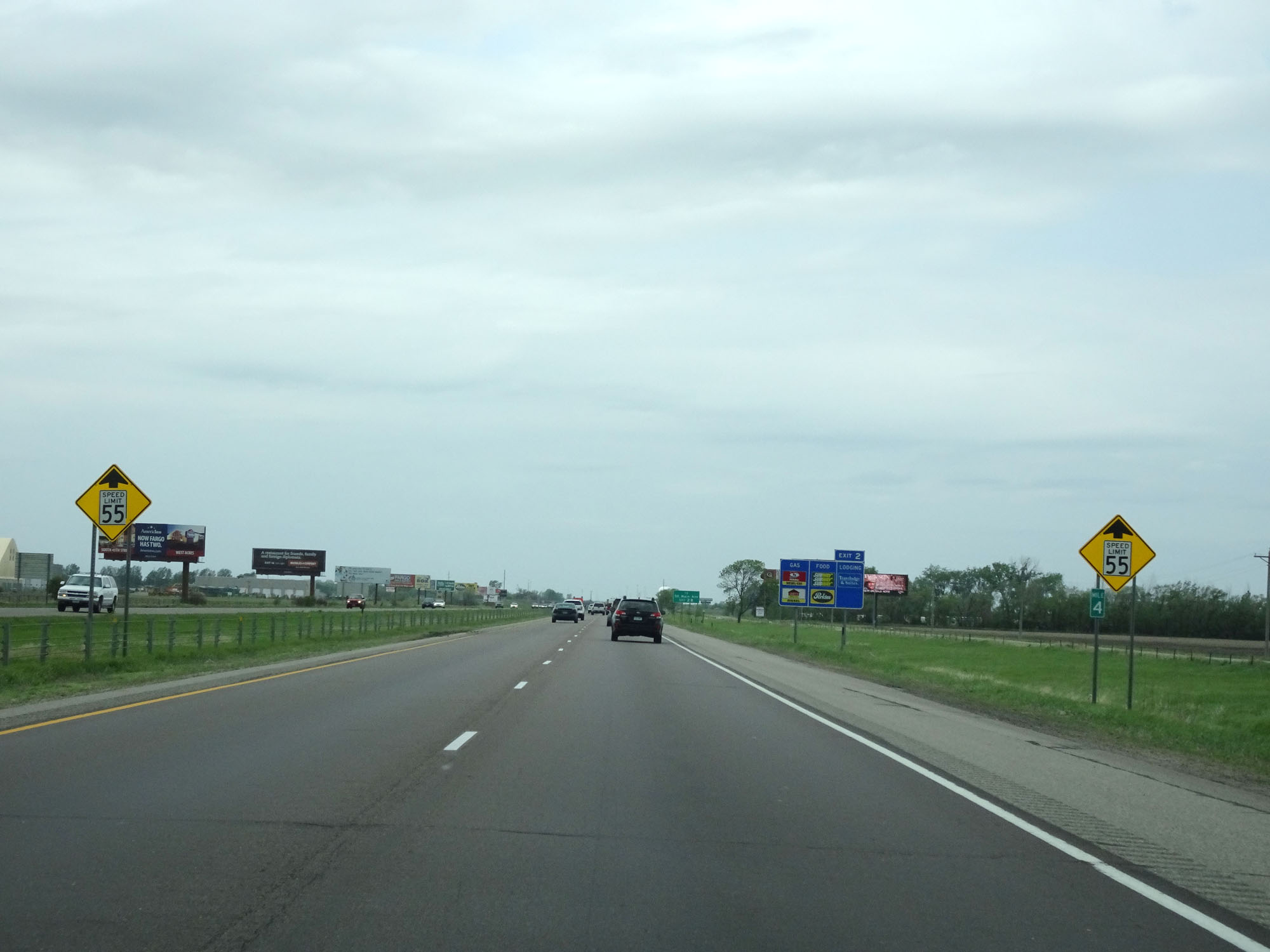 Approaching Moorhead, the speed limit decreases to 55 mph. The 40 mph minimum speed limit remains in effect as always. (Photo taken 5/22/16). |
