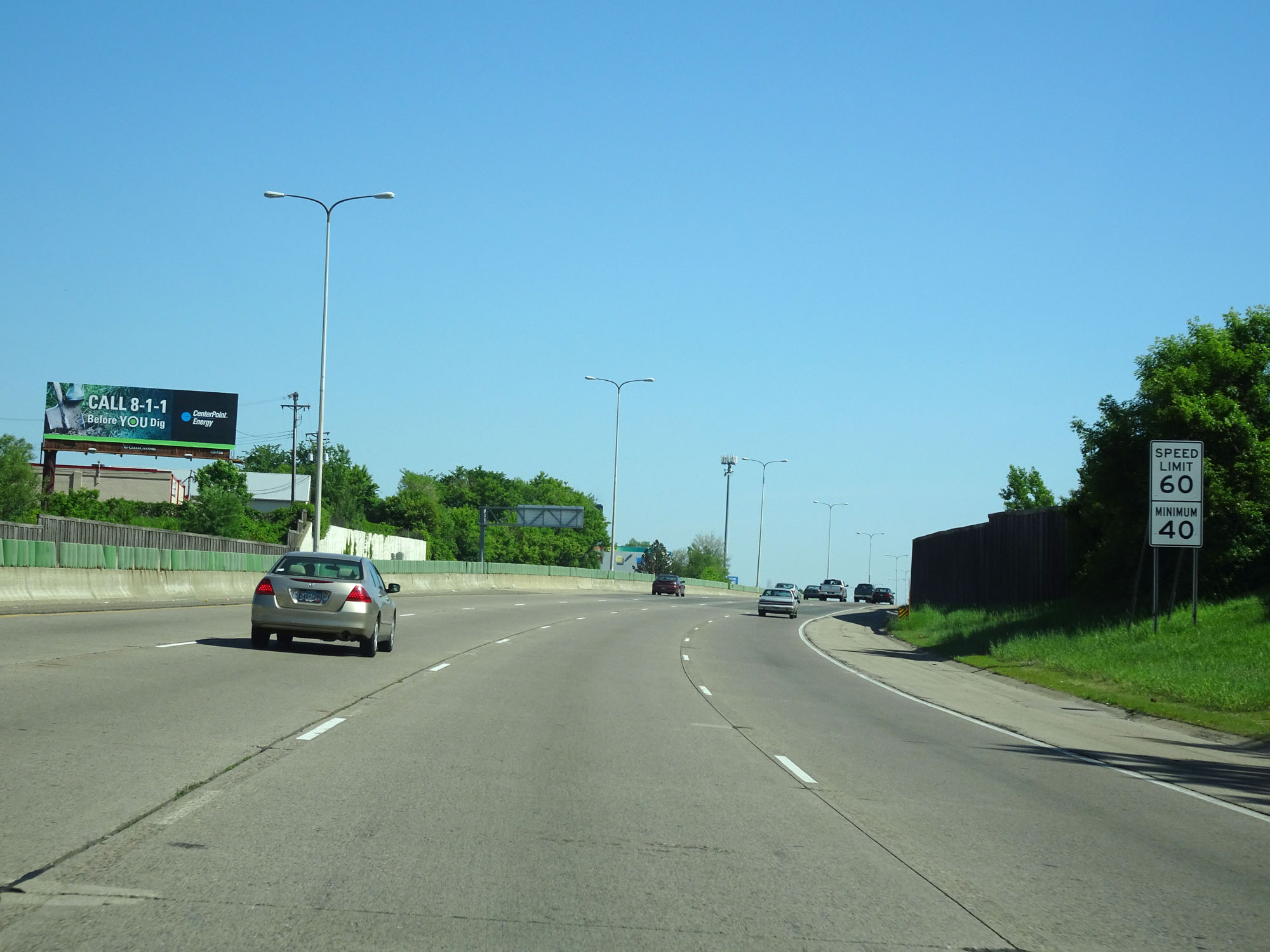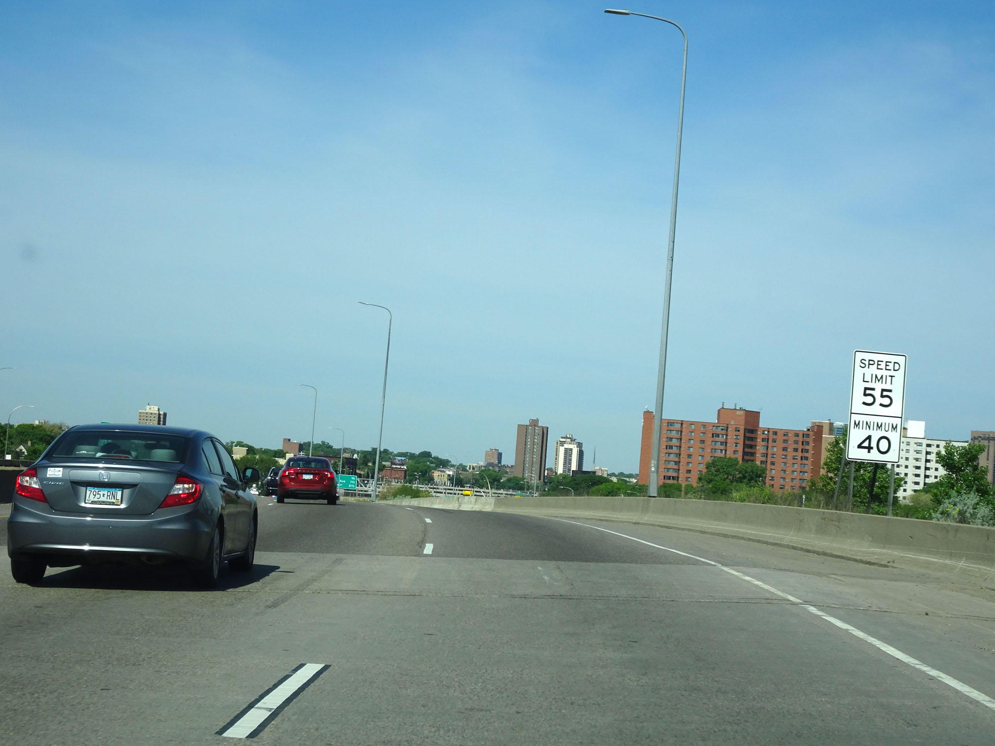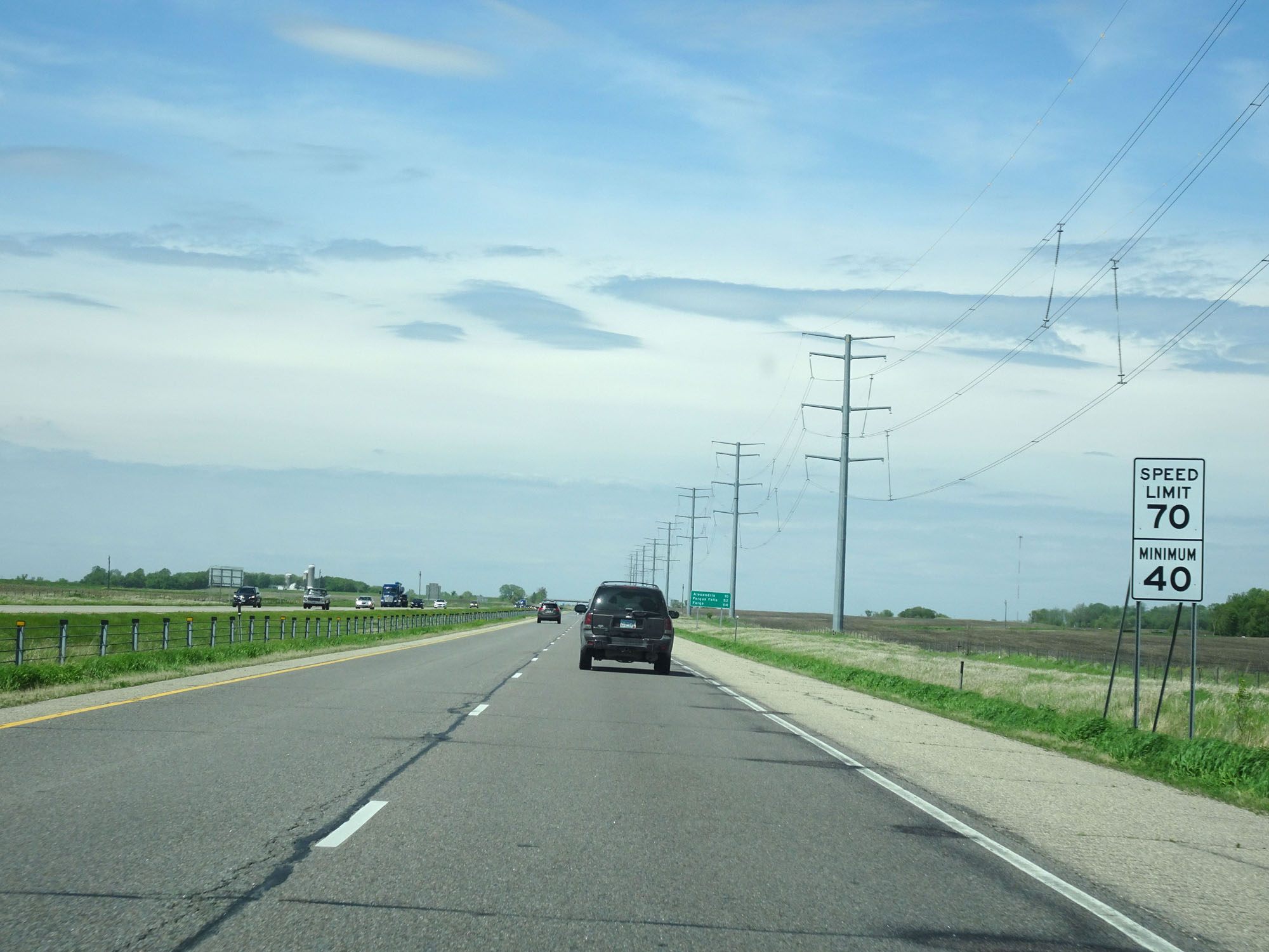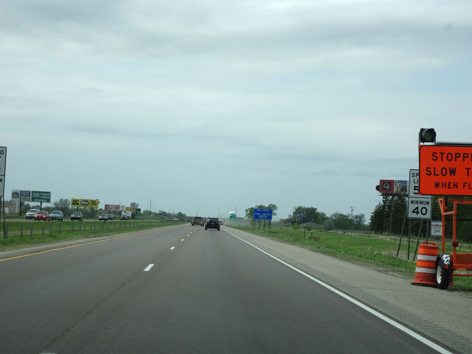 Approaching Moorhead, the speed limit decreases to 55 mph. The 40 mph minimum speed limit remains in effect as always. (Photo taken 5/22/16). |