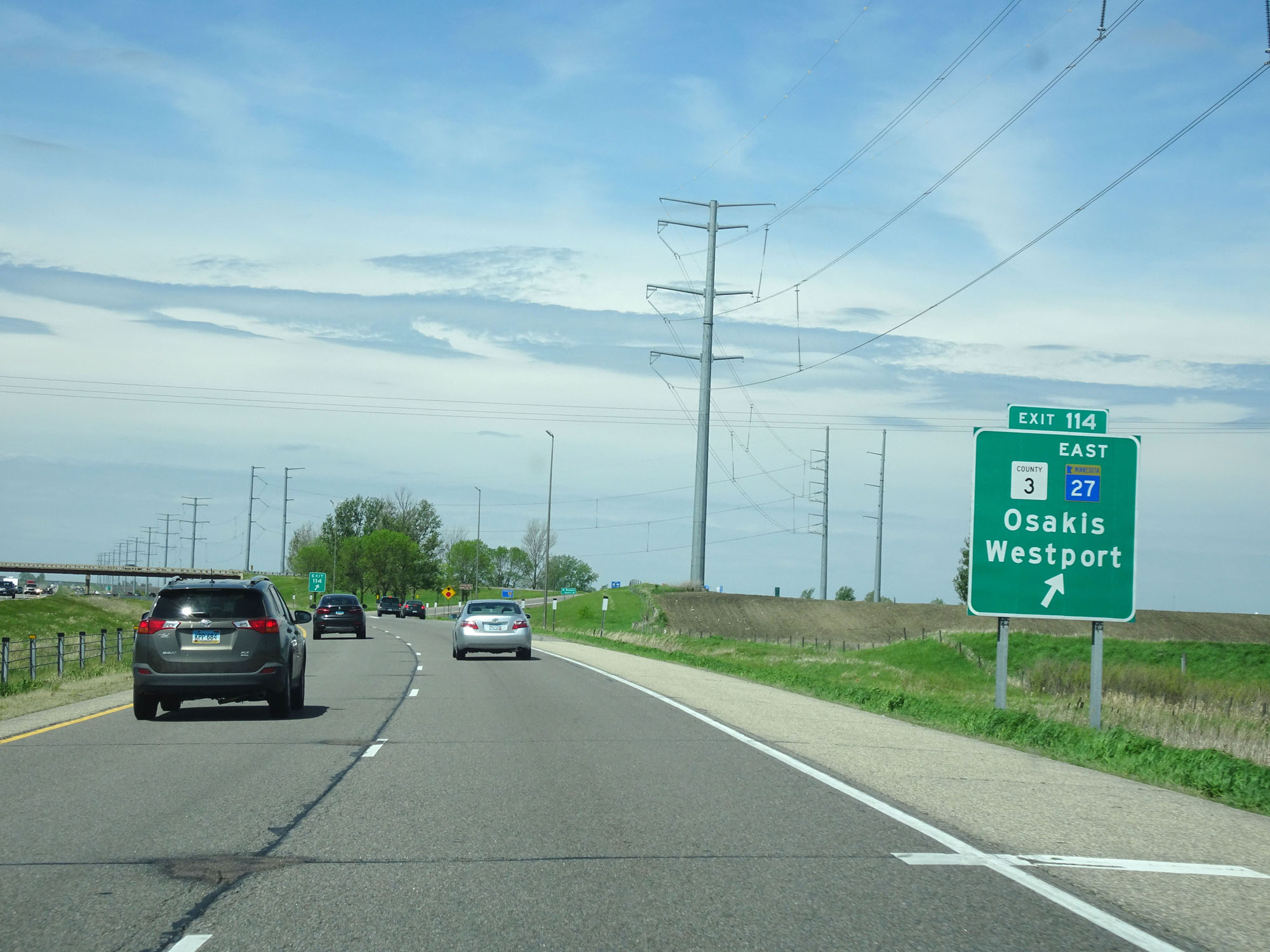 Interstate 94 West at Exit 114: CR 3 / MN 27 East - Osakis / Westport (Photo taken 5/22/16). |