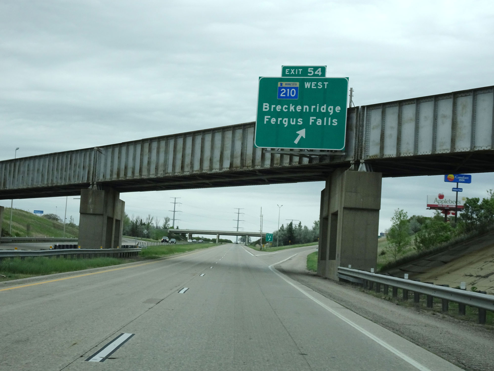 Interstate 94 West at Exit 54: MN 210 West - Breckenridge / Fergus Falls (Photo taken 5/22/16). |