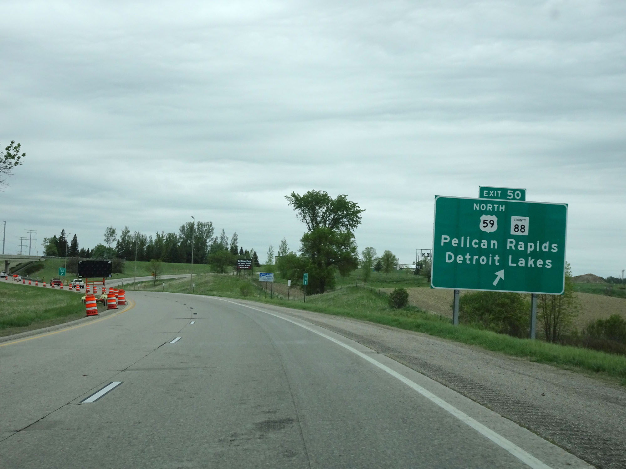 Interstate 94 West at Exit 50: US 59 North / CR 88 - Pelican Rapids / Detroit Lakes (Photo taken 5/22/16). |
