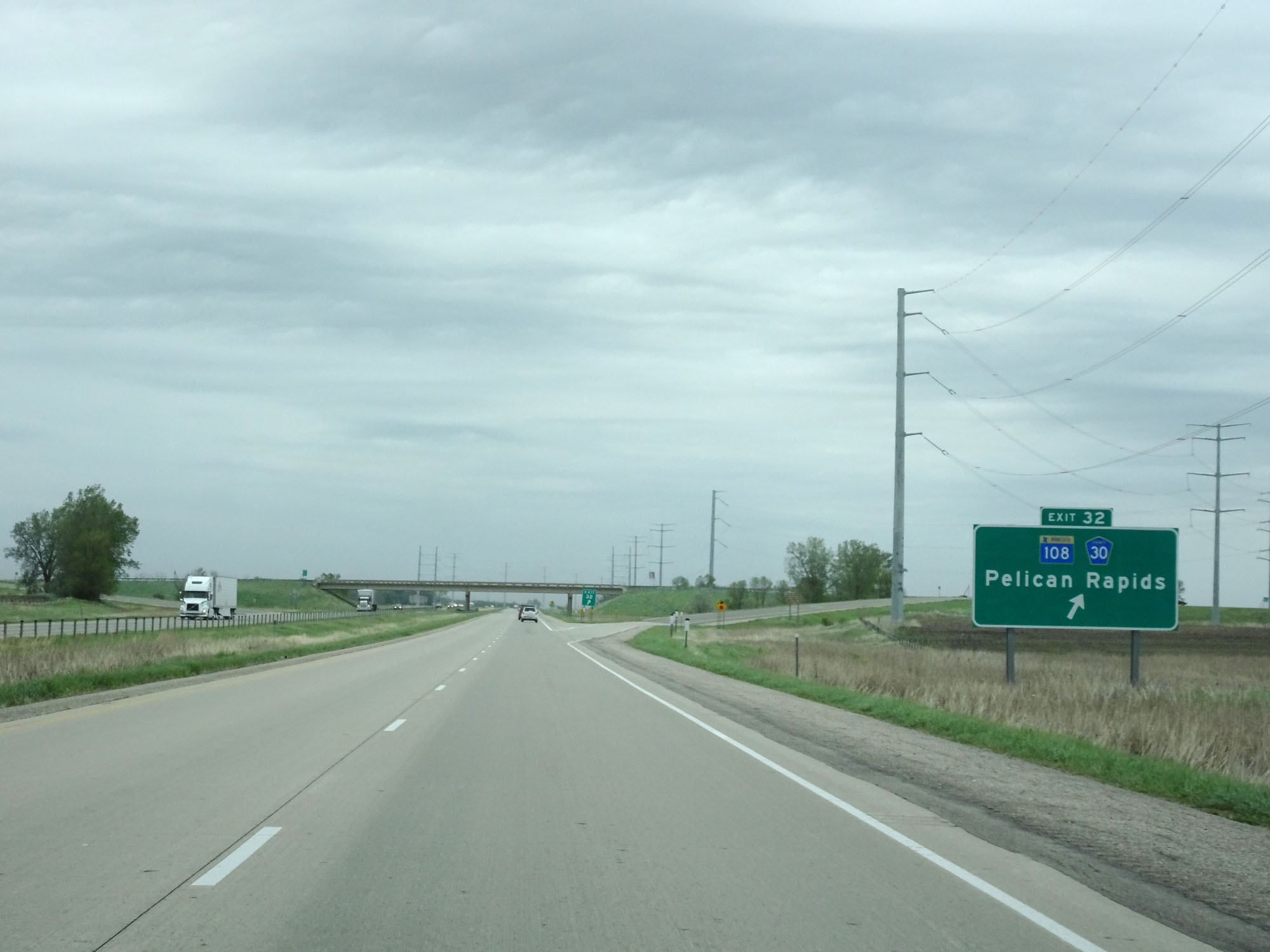 Interstate 94 West at Exit 32: MN 108 / CR 30 - Pelican Rapids (Photo taken 5/22/16). |