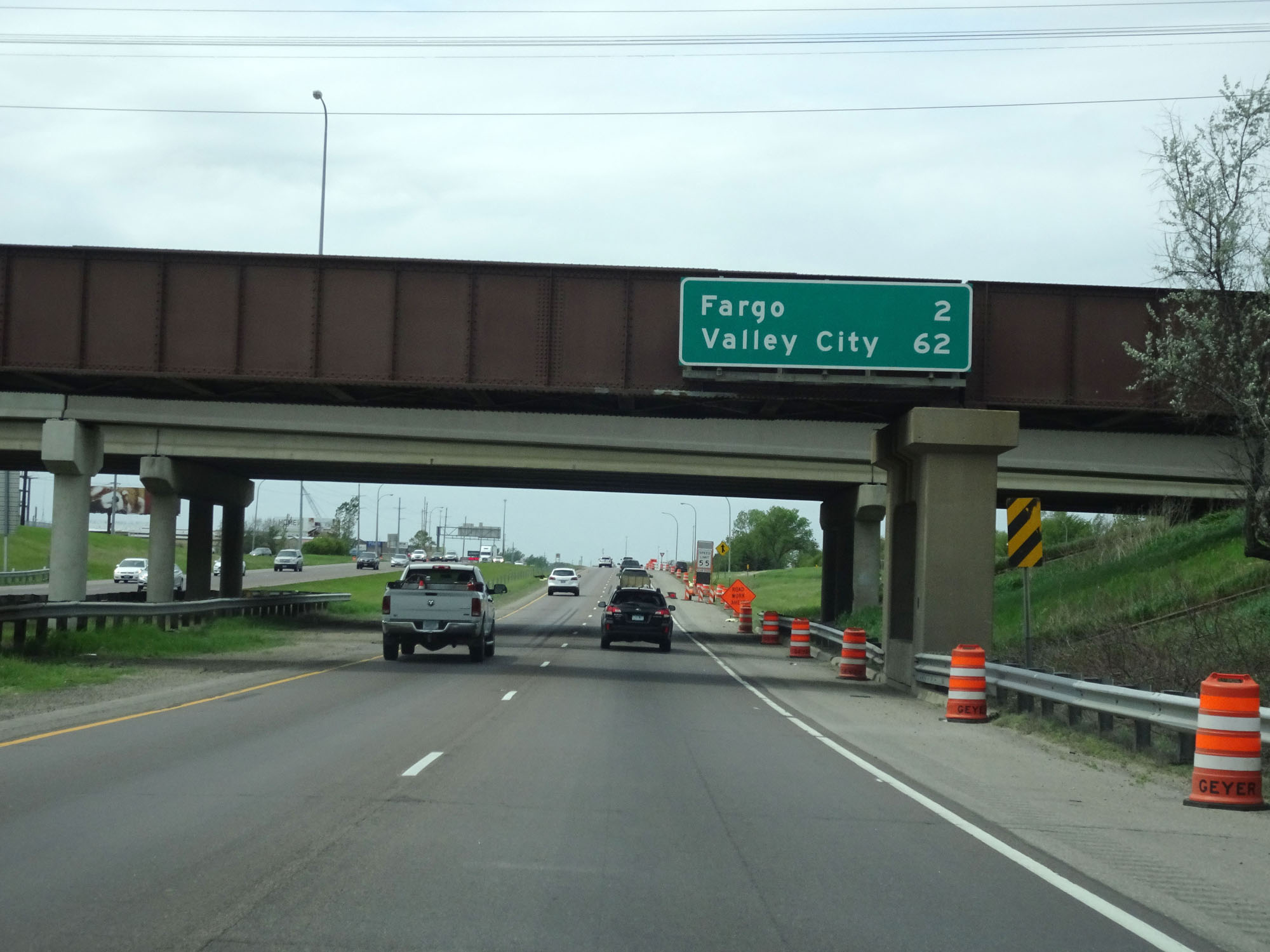 Overhead mileage sign on Interstate 94 West. It's 2 miles to Fargo and 62 miles to Valley City. (Photo taken 5/22/16). |