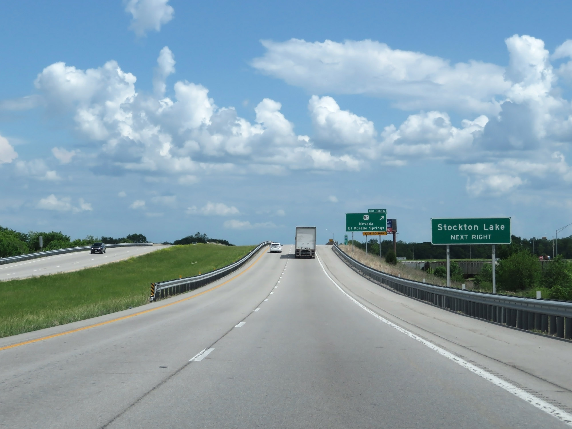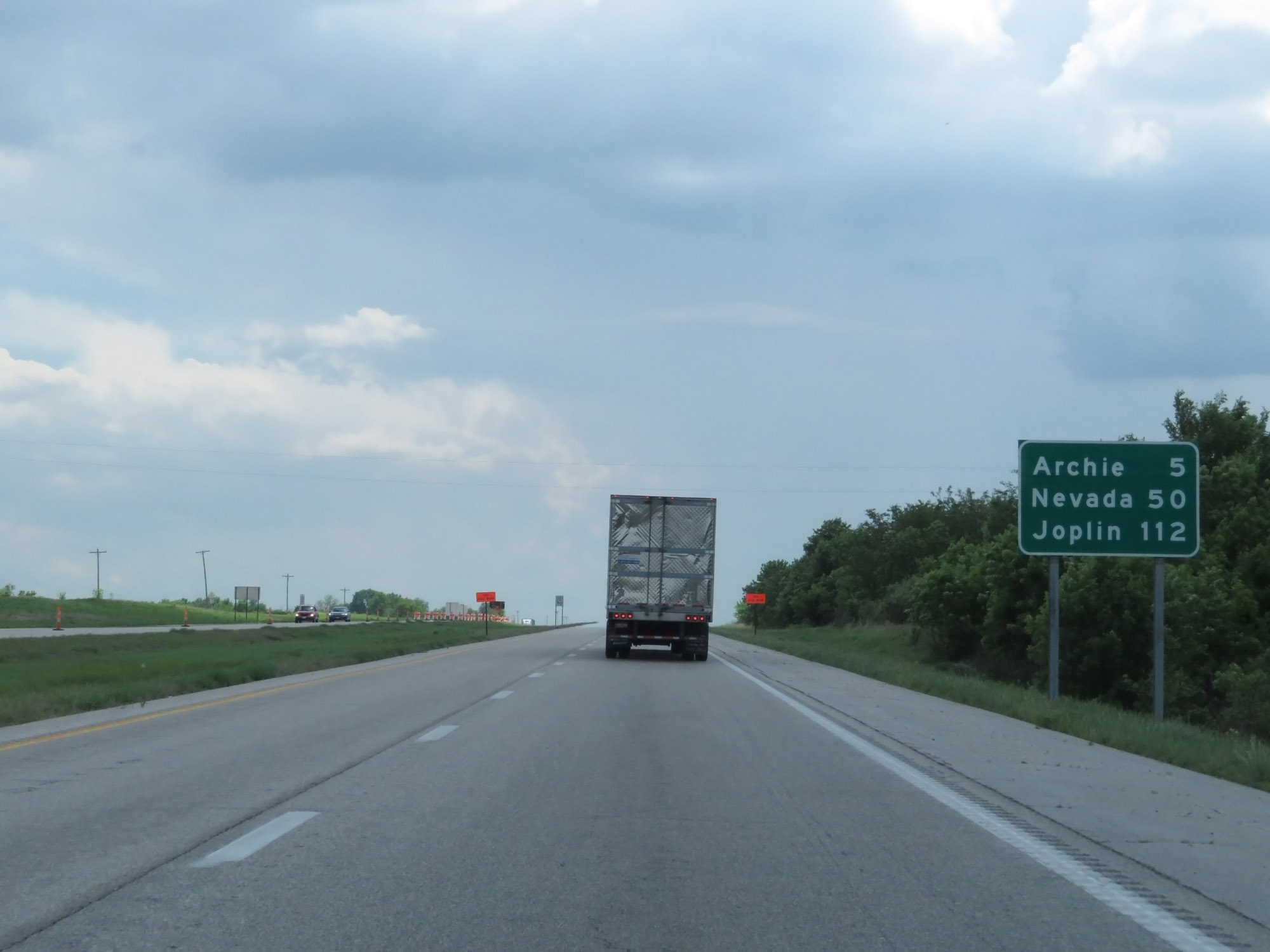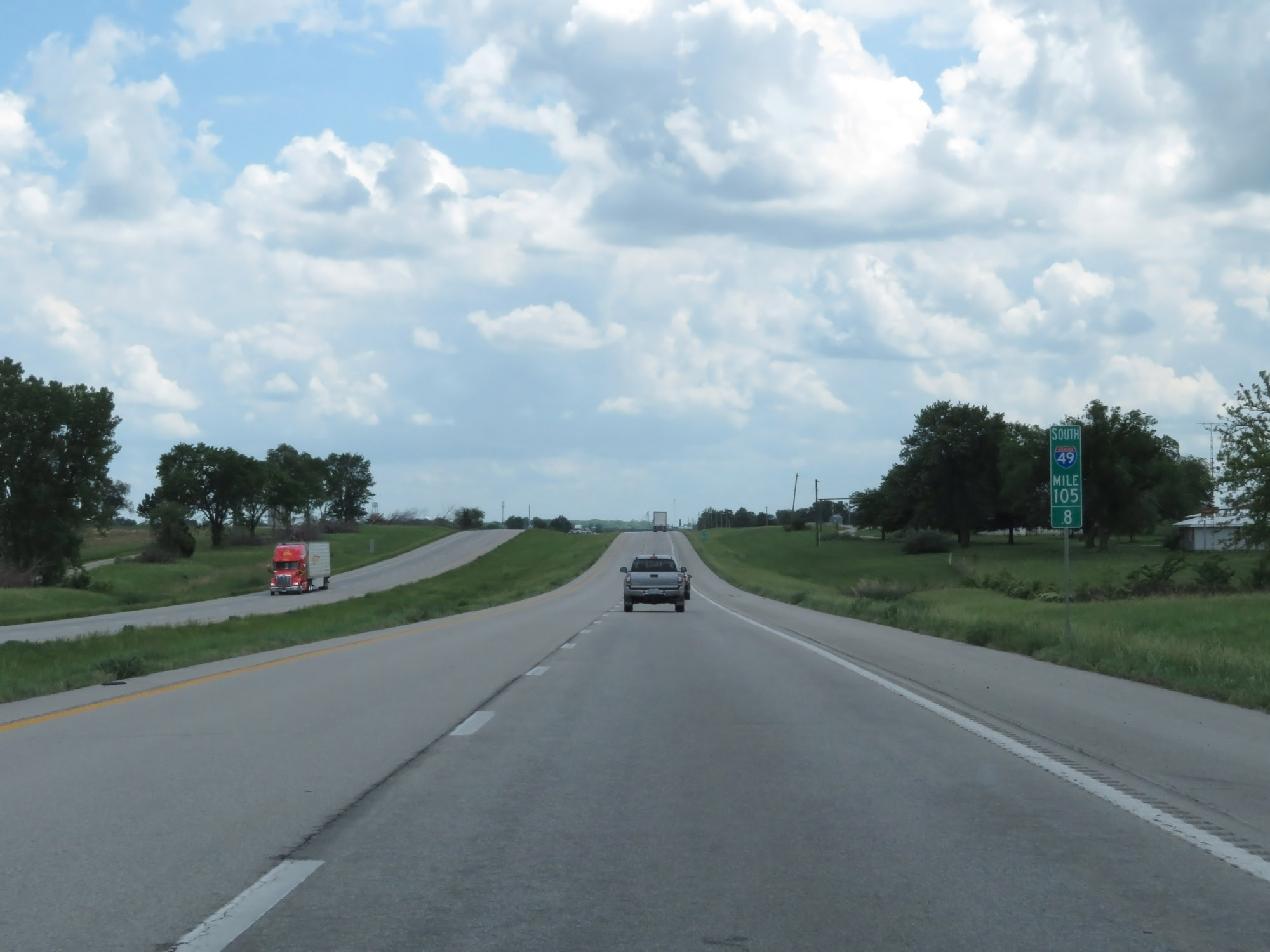 Interstate 49 South at mile marker 5.2, approaching its current southern terminus in Missouri. (Photo taken 5/17/18). |