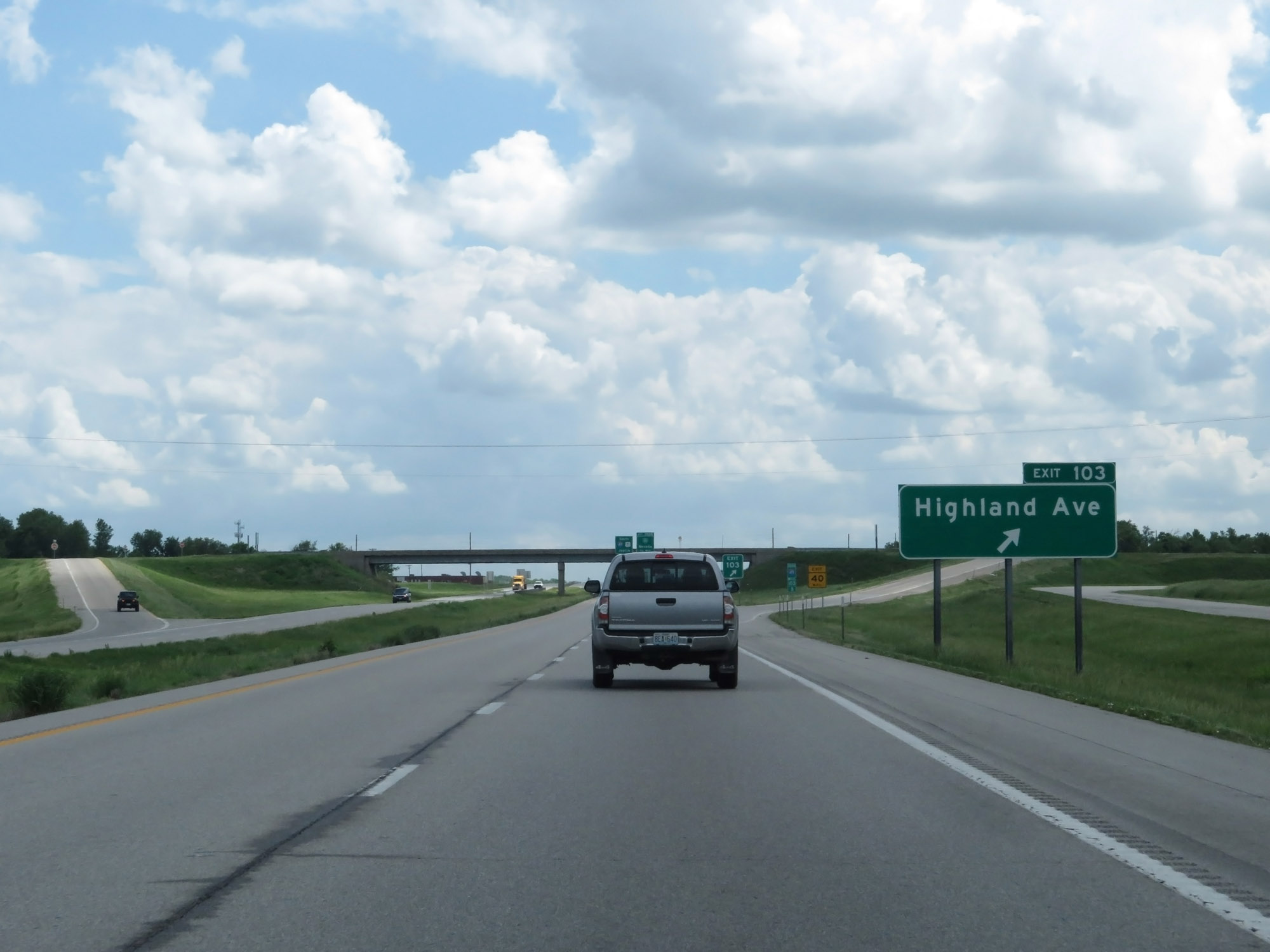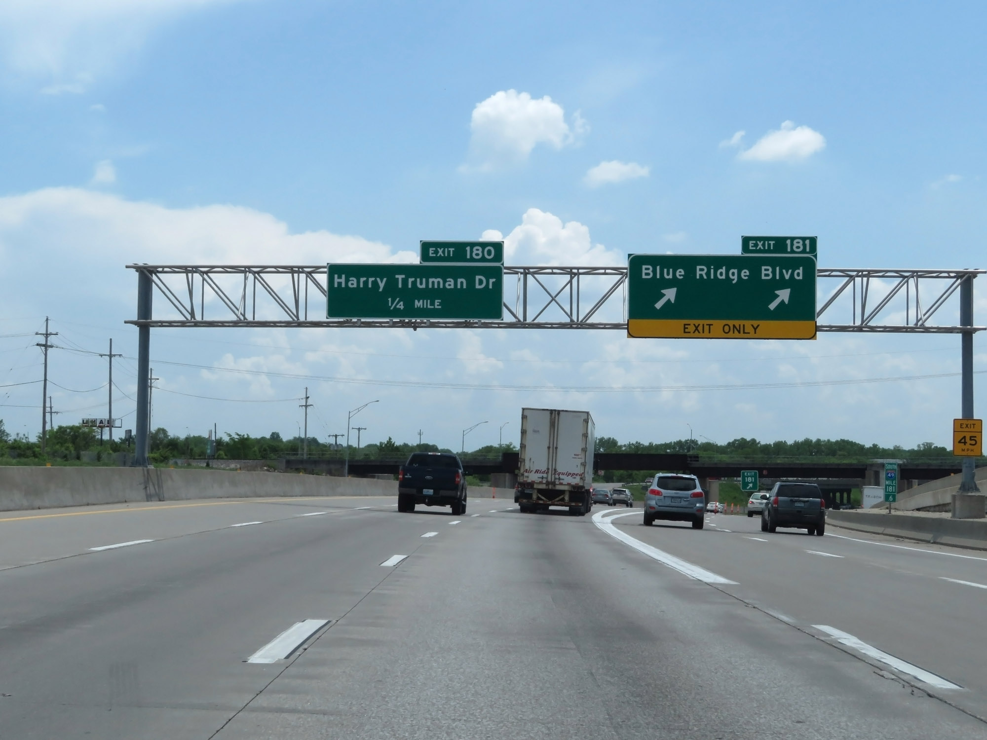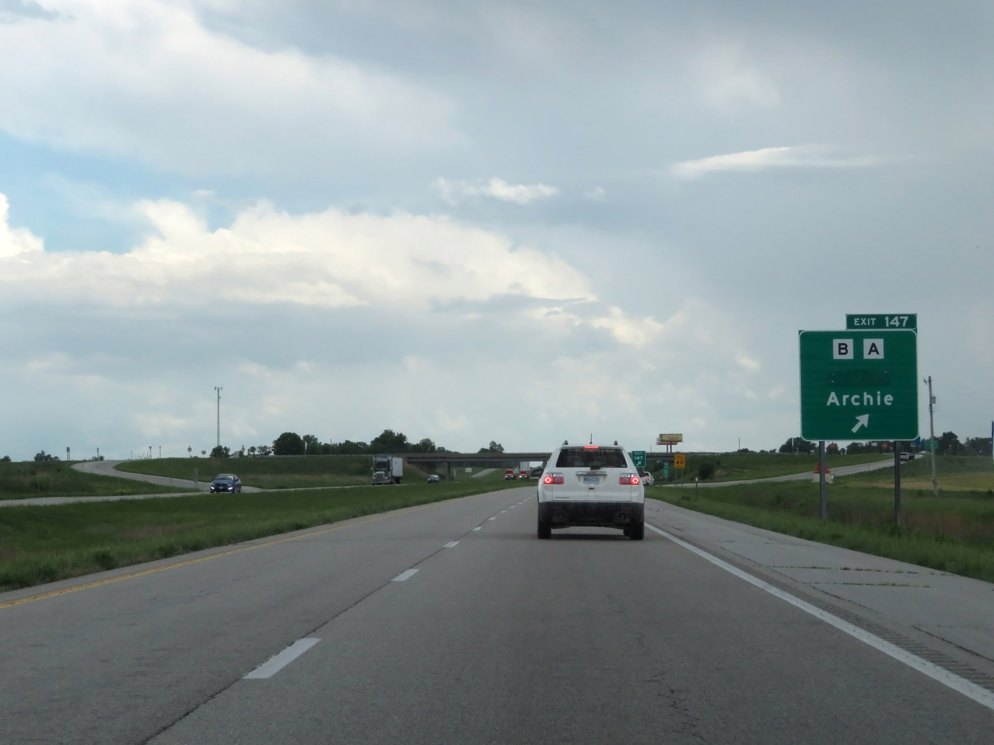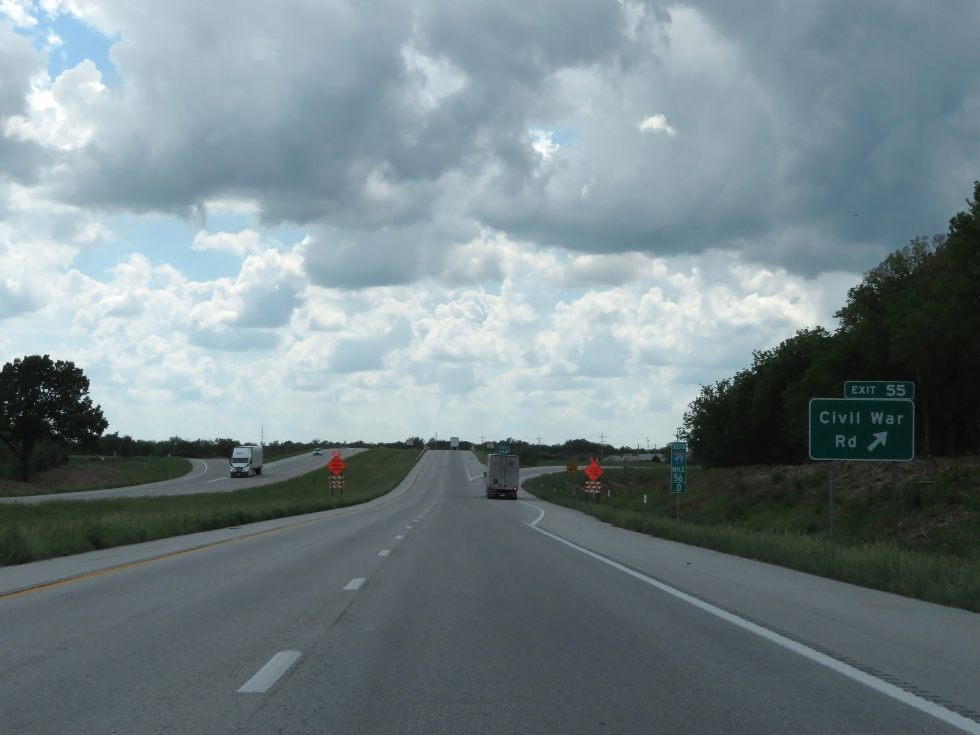 Interstate 49 South at mile marker 5.2, approaching its current southern terminus in Missouri. (Photo taken 5/17/18). |