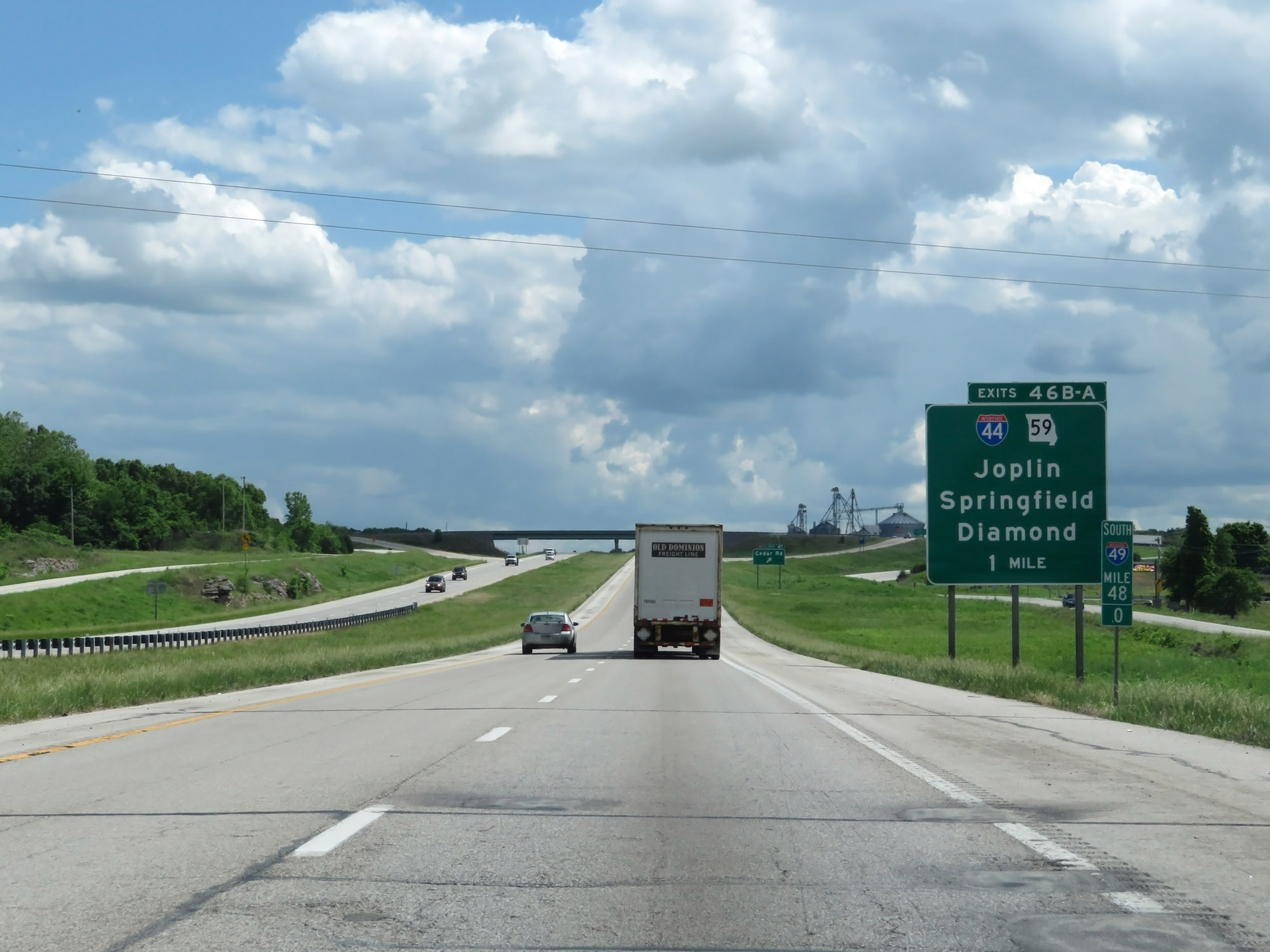 Interstate 49 South at Exit 46A: MO 59 South - Diamond; Exit 46B: Interstate 44 East - Springfield (Photo taken 5/17/18). |