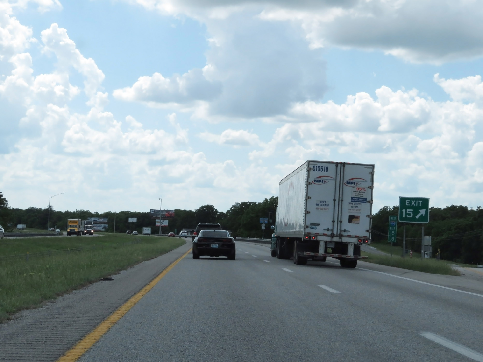 Interstate 49 South / Interstate 44 West approaching Exit 15 - 1 mile. During this concurrency, the mileage and exit numbers are based on the mileage of I-44. (Photo taken 5/17/18). |