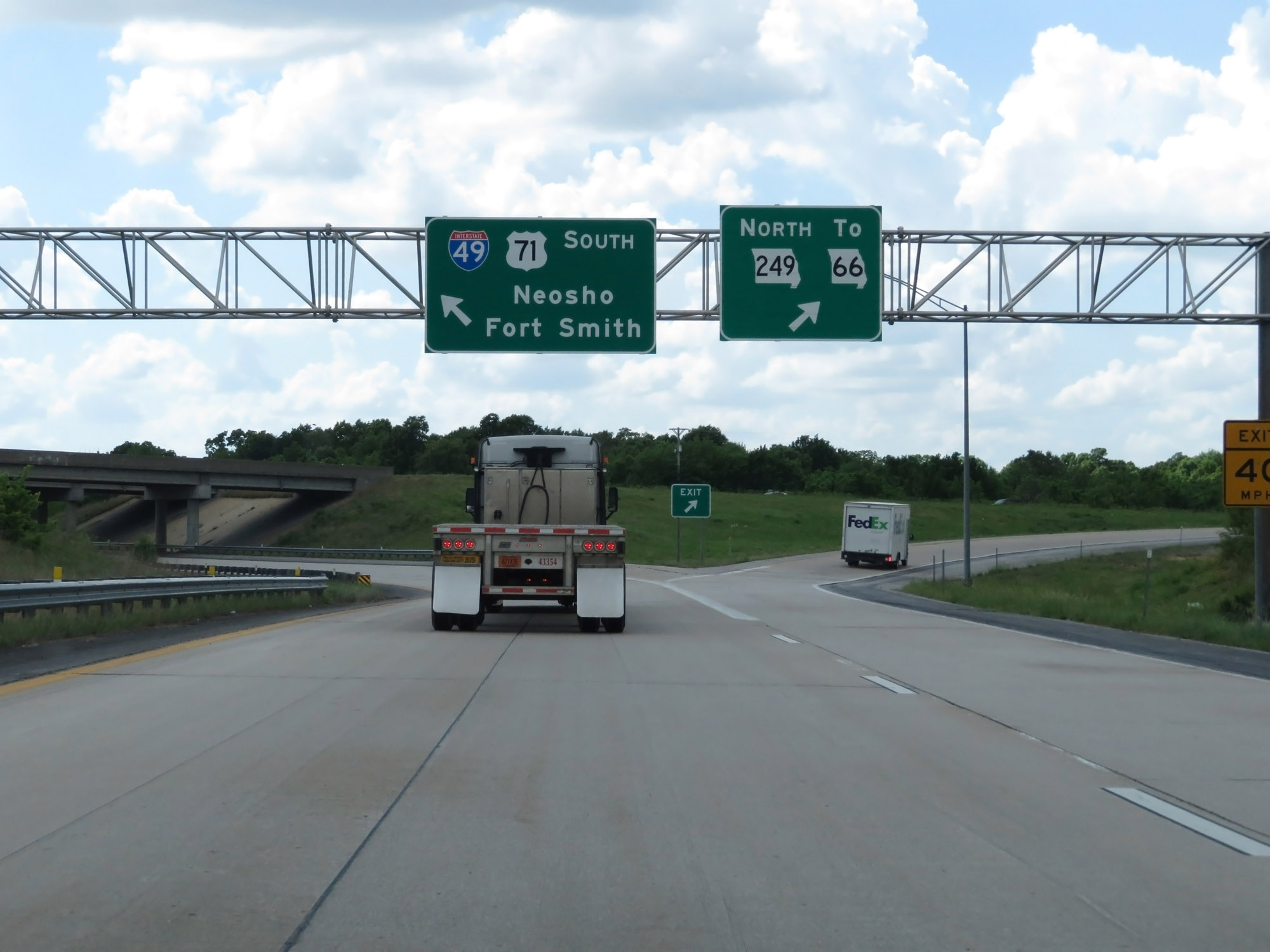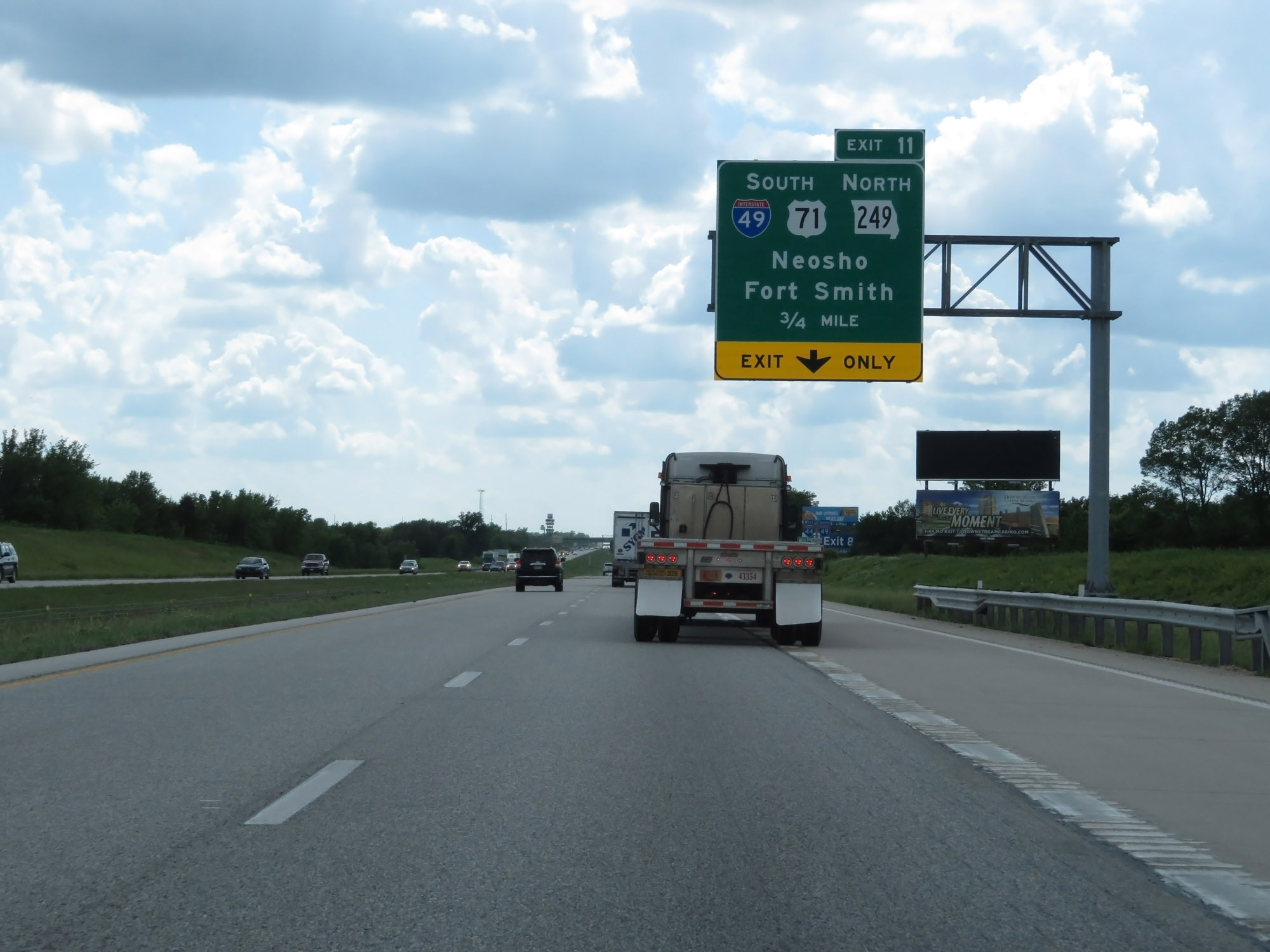 Interstate 49 South / Interstate 44 West at Exit 11: Interstate 49 South / US 71 South / MO 249 North - Neosho / Fort Smith (Photo taken 5/17/18). |