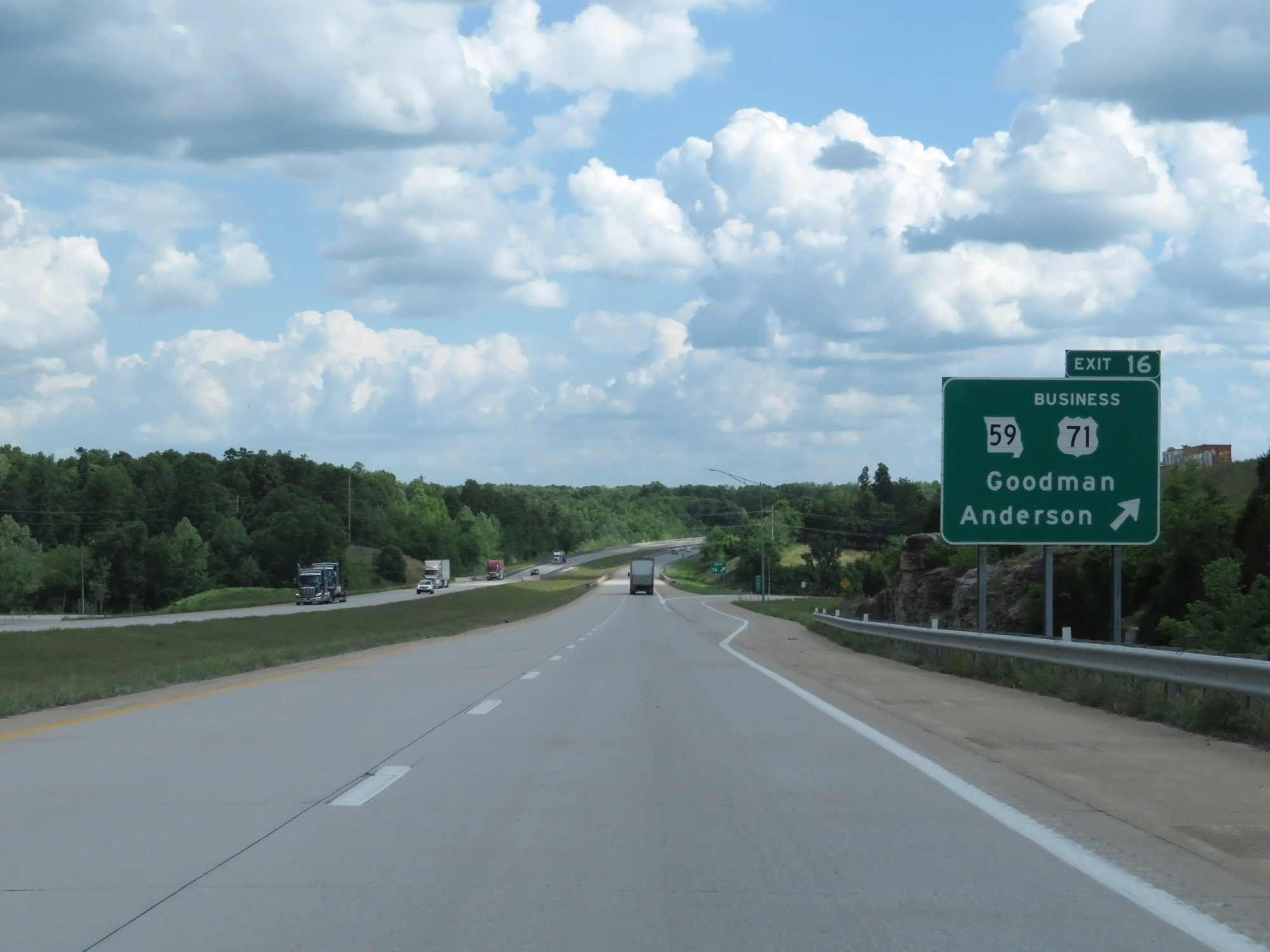 Interstate 49 South at Exit 16: MO 59 / US 71 Business - Goodman / Anderson (Photo taken 5/17/18). |