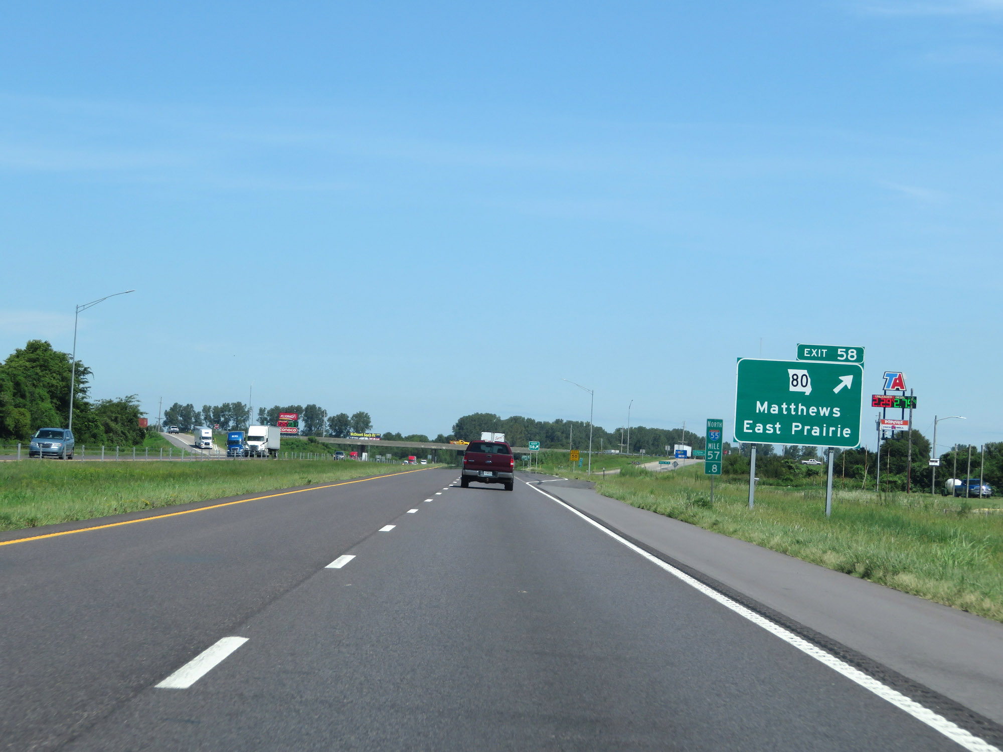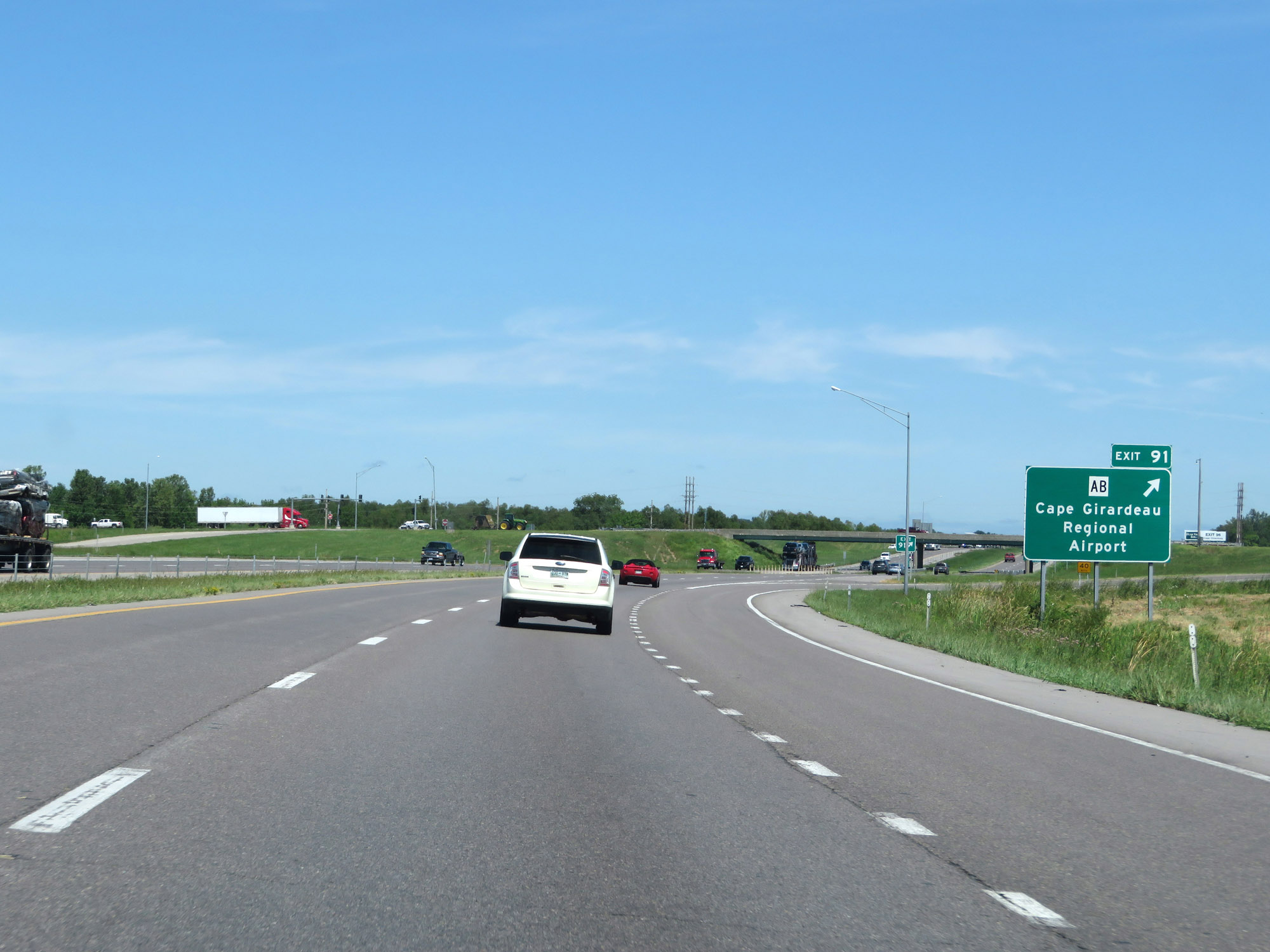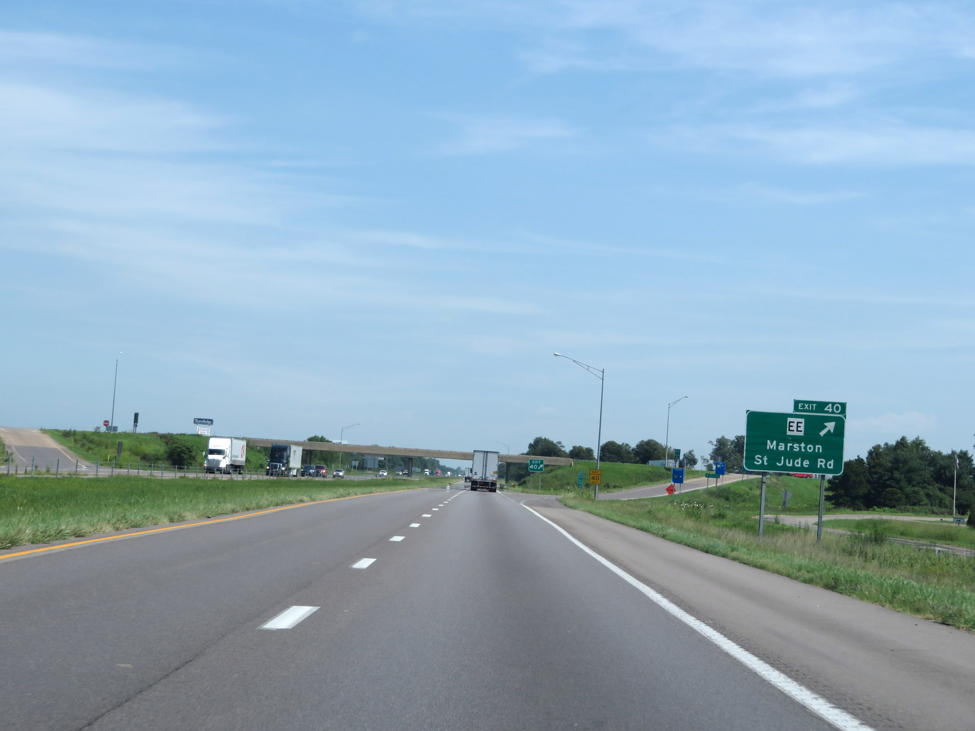 View on the ramp for Exit 291A, to remain on Interstate 55 North. Ahead, I-55 North will curve to the east to join Interstate 64 East, at which point the duplex will cross the Mississippi River into Illinois. (Photo taken 8/13/19). |