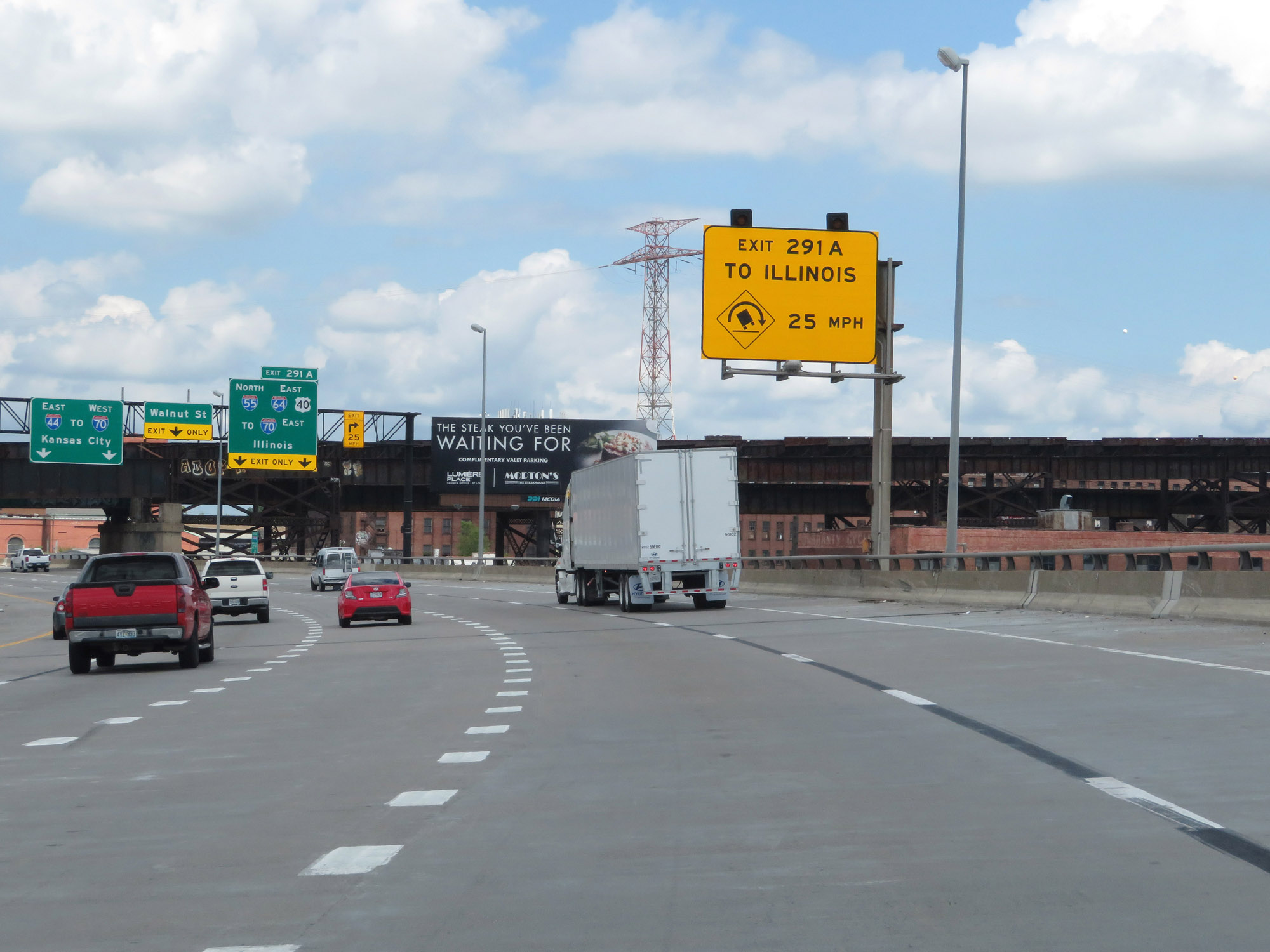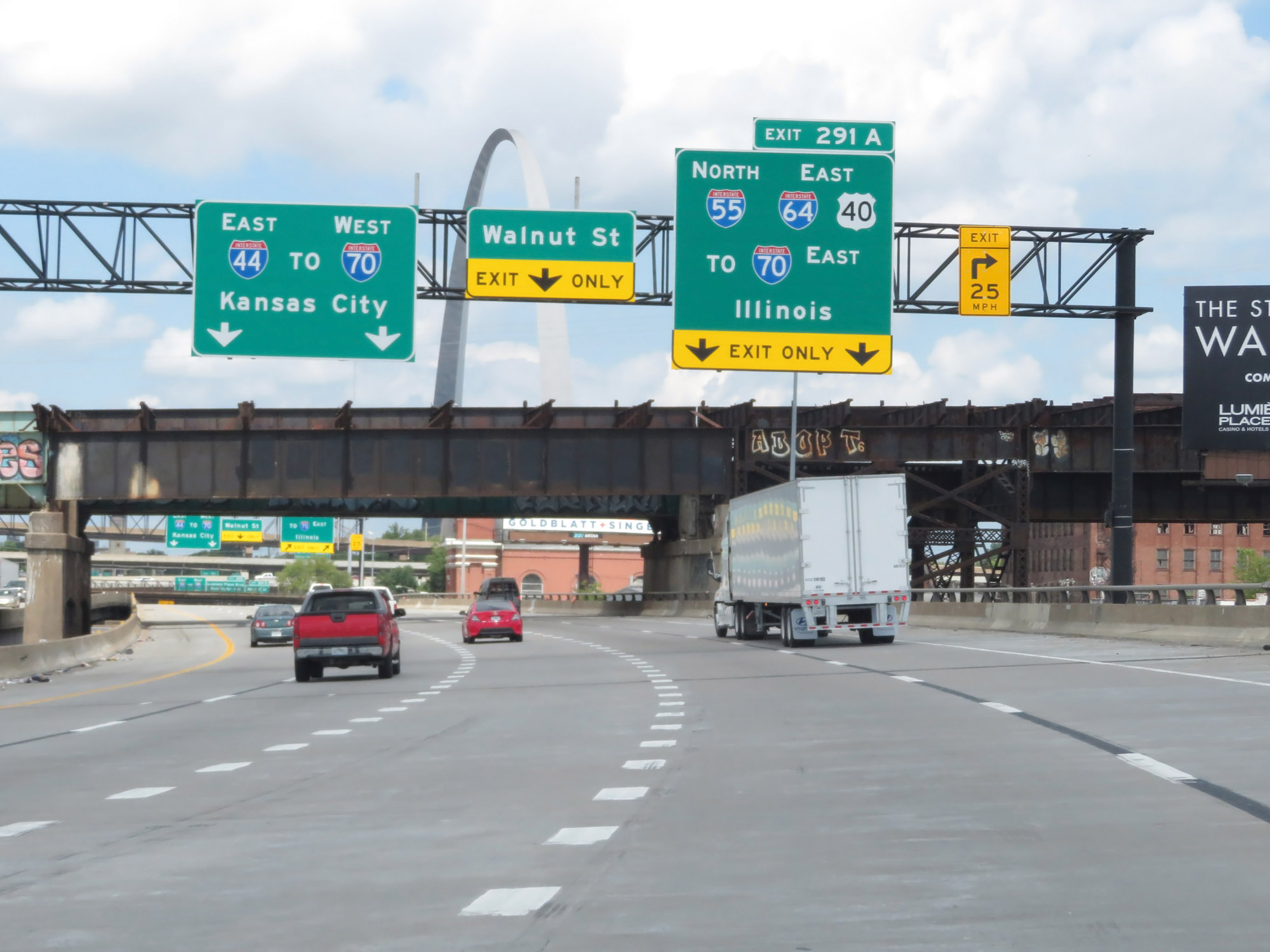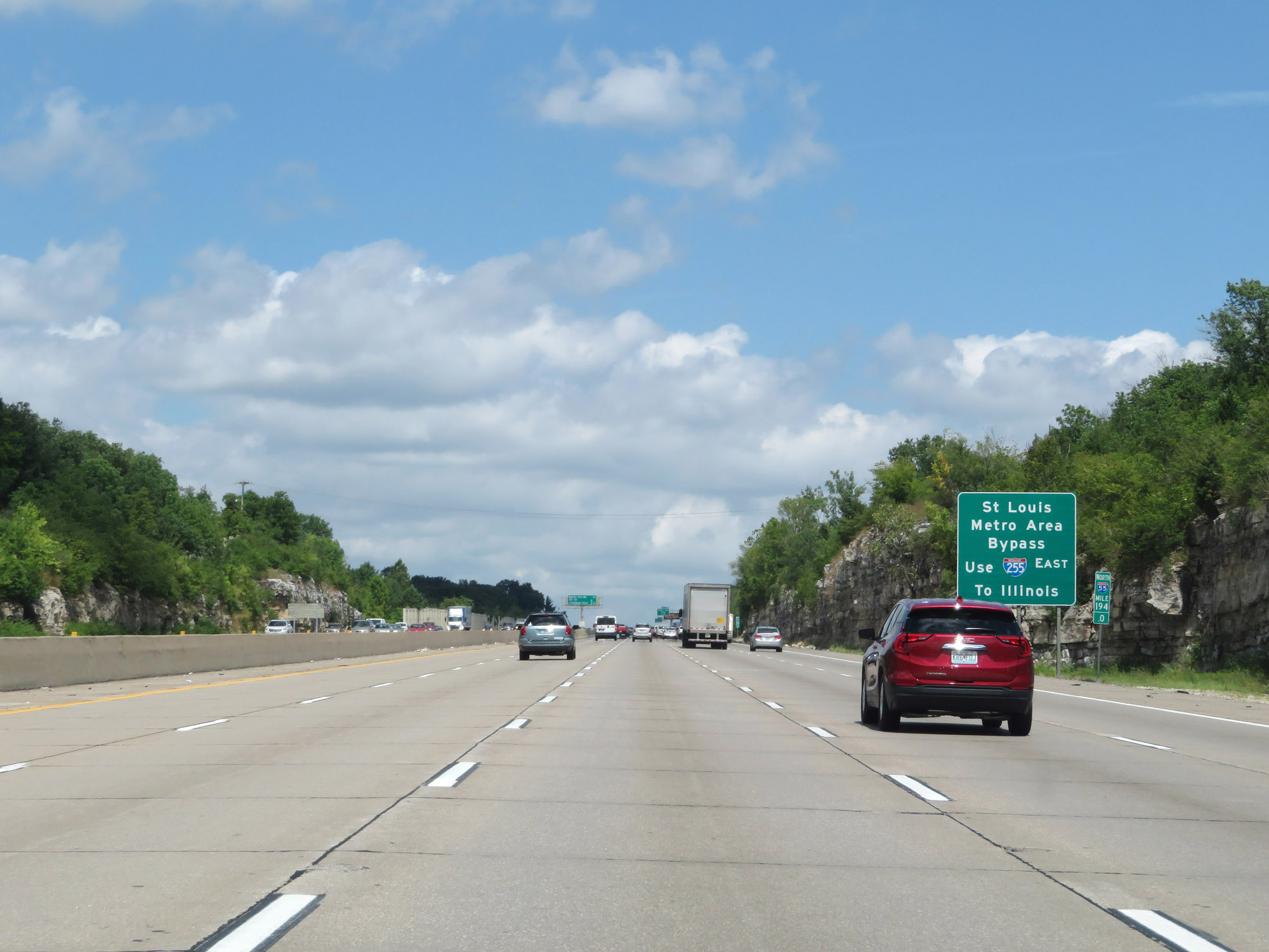 Interstate 55 North / Interstate 44 East approaching Exit 291A. Interstate 44 East thru traffic should move to the left at this time. Any traffic headed to Illinois and the East St. Louis area should keep right and follow Interstate 55 North. I-55 North will connect with both Interstate 64 and Interstate 70 East. (Photo taken 8/13/19). |