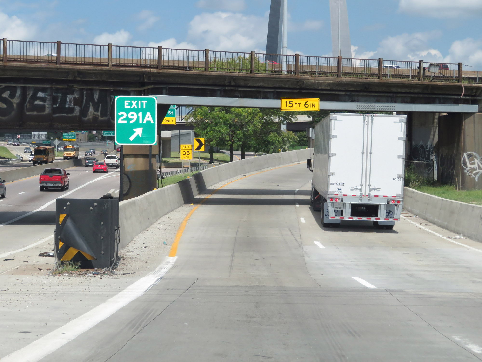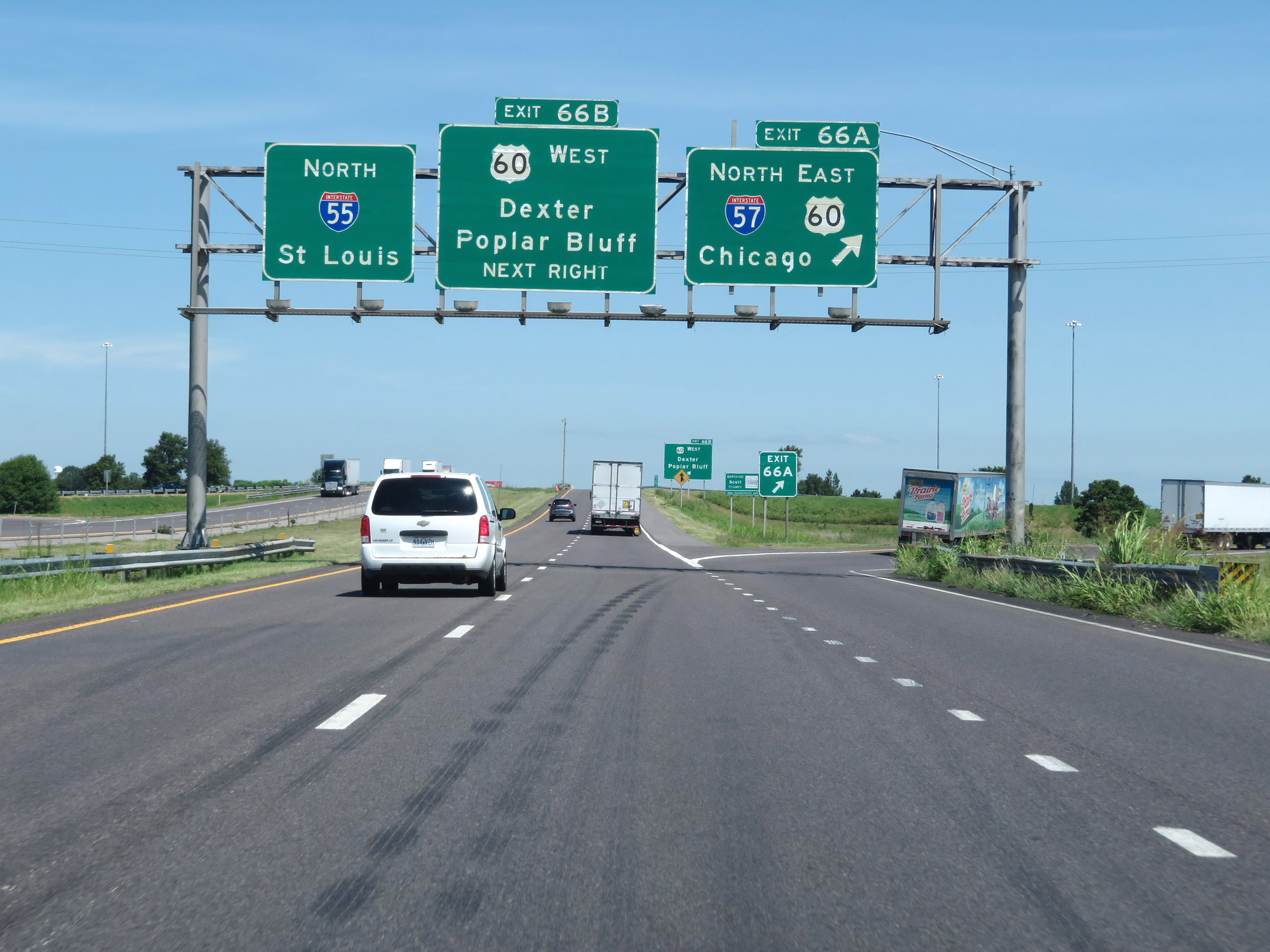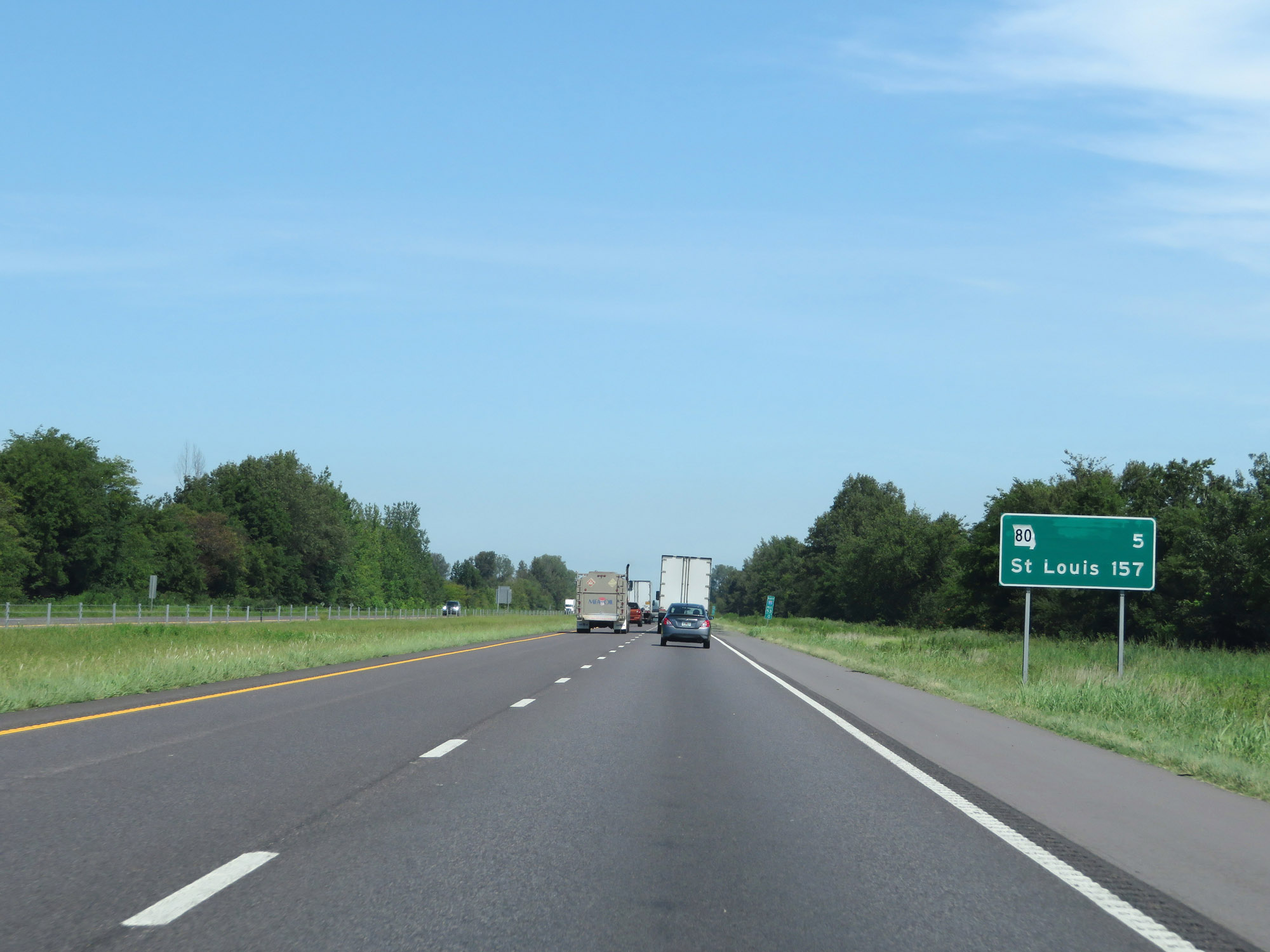 Interstate 55 North / Interstate 44 East approaching Exit 291A. Interstate 44 East thru traffic should move to the left at this time. Any traffic headed to Illinois and the East St. Louis area should keep right and follow Interstate 55 North. I-55 North will connect with both Interstate 64 and Interstate 70 East. (Photo taken 8/13/19). |