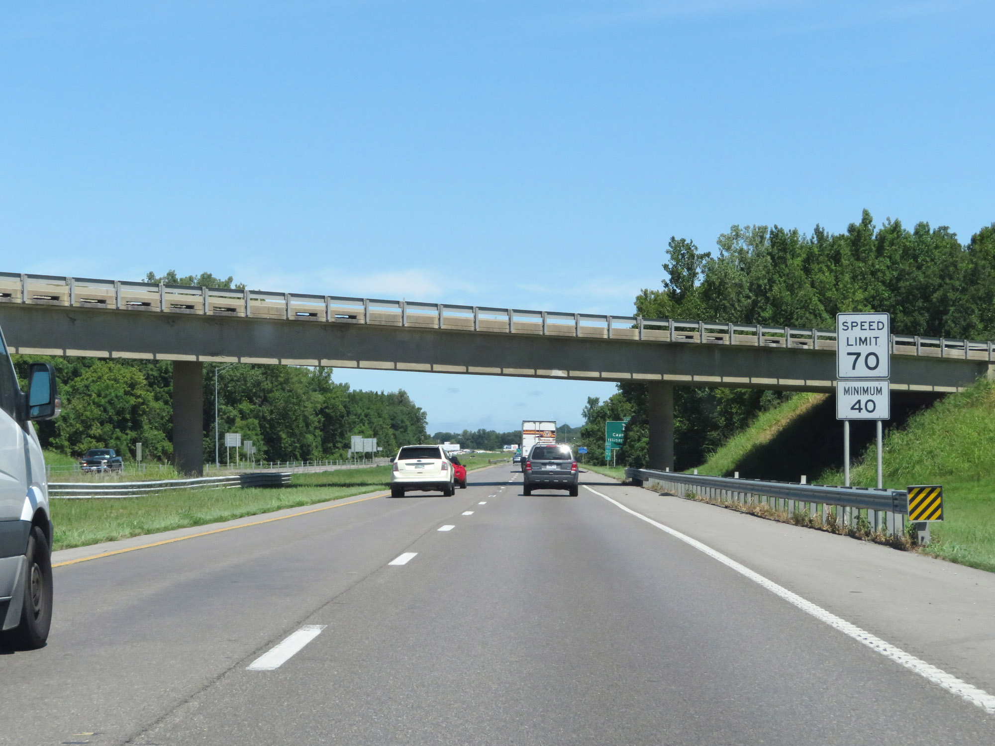 North of Exit 190, the maximum speed limit decreases to 65 mph. The minimum speed limit remains 40 mph. (Photo taken 8/13/19). |