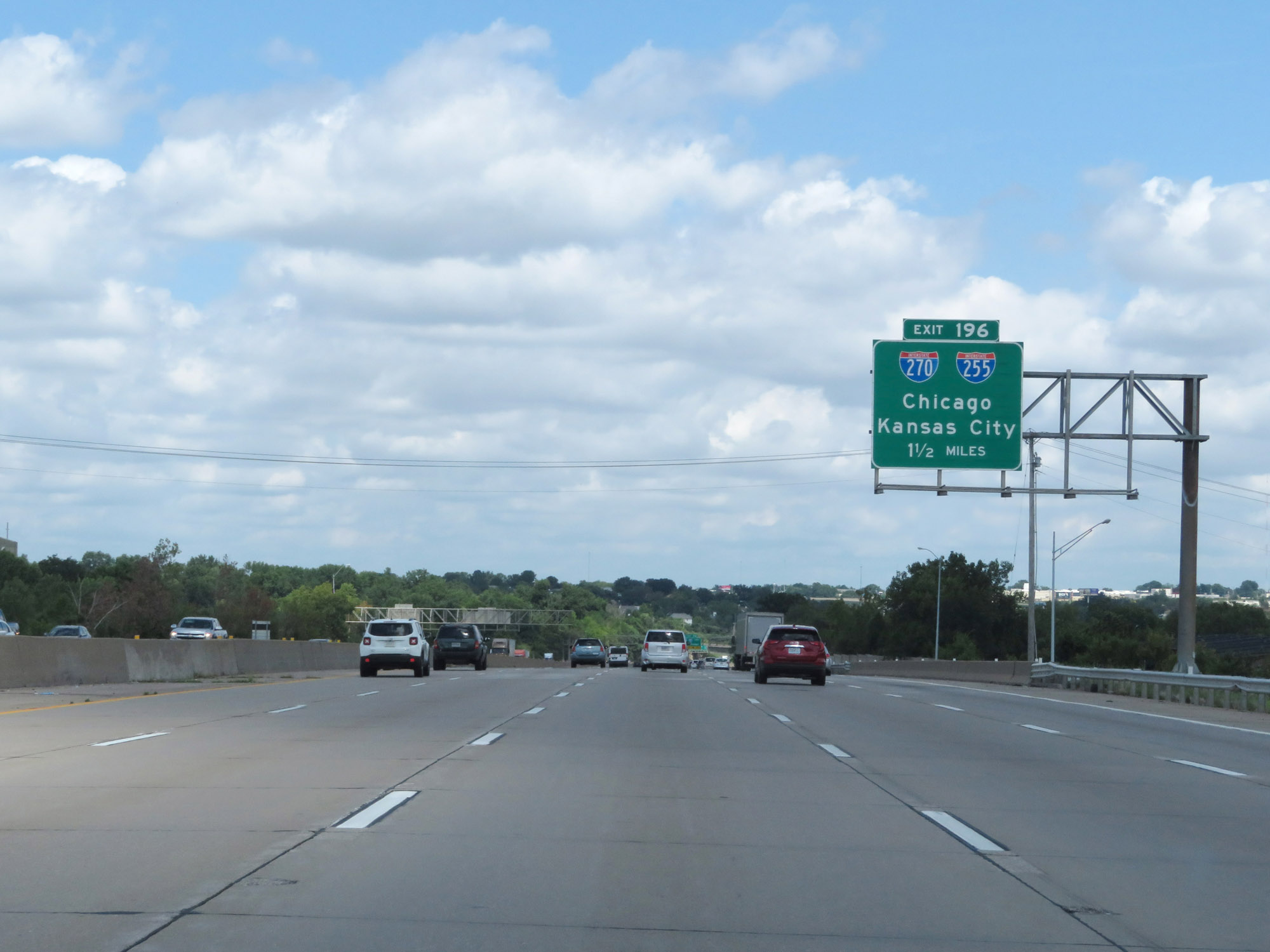 Interstate 55 North at Exit 196: Interstate 270 West - Kansas City; Interstate 255 East - Chicago (Photo taken 8/13/19). |