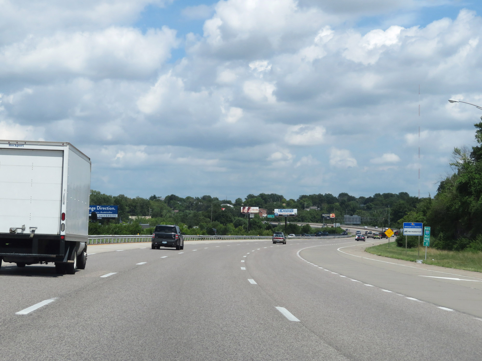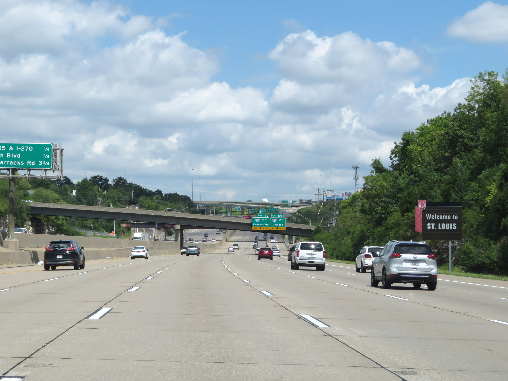 Interstate 55 North as traffic from Interstate 64 East joins it on the left. Together, they will cross the Mississippi River ahead. (Photo taken 8/13/19). |