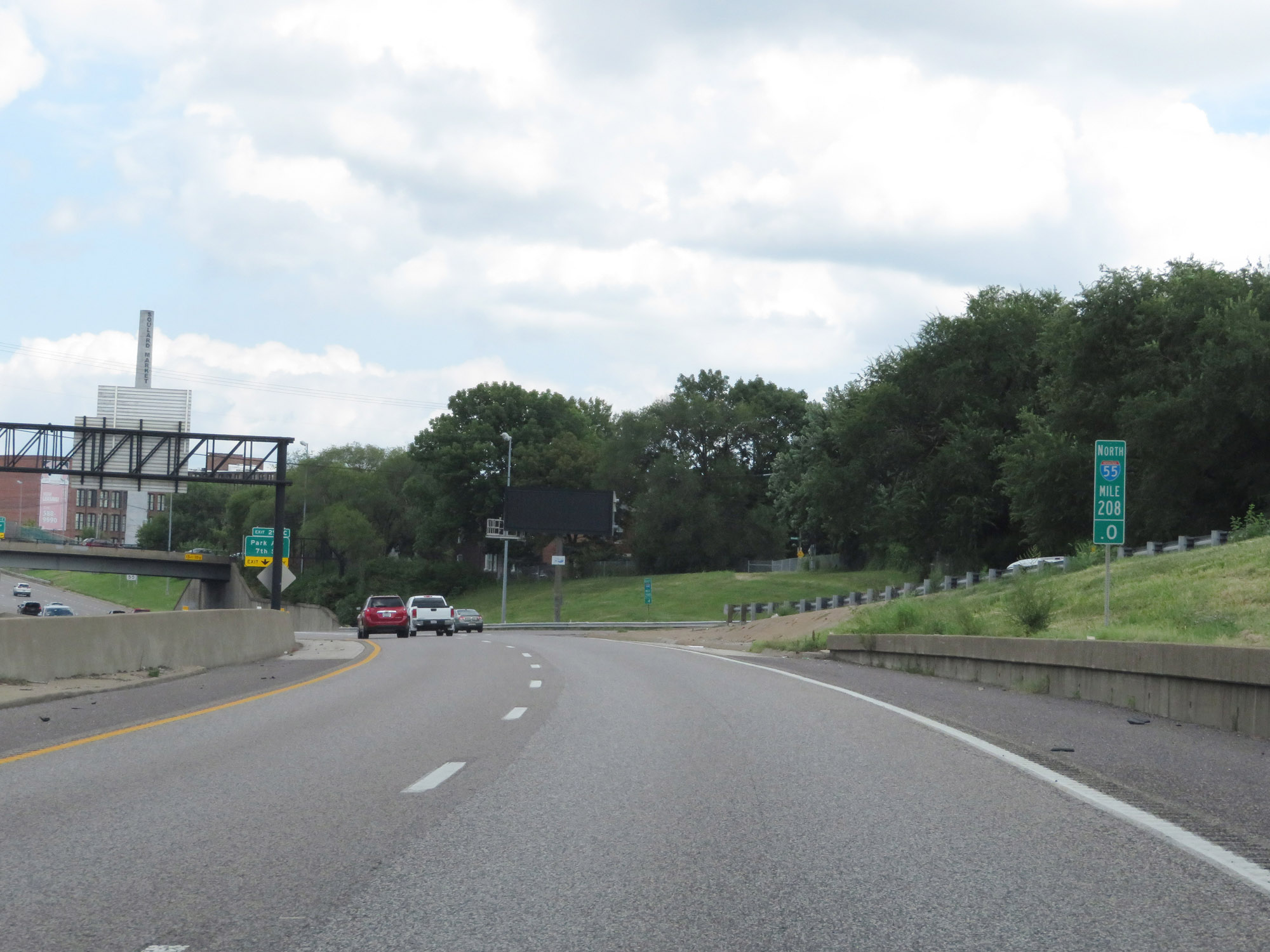 View on Interstate 55 North at mile marker 208. Ahead, the northbound lanes of Interstate 55 will merge with the eastbound lanes of Interstate 44. During this concurrency, the exit numbers and mileage are based on that of Interstate 44. (Photo taken 8/13/19). |