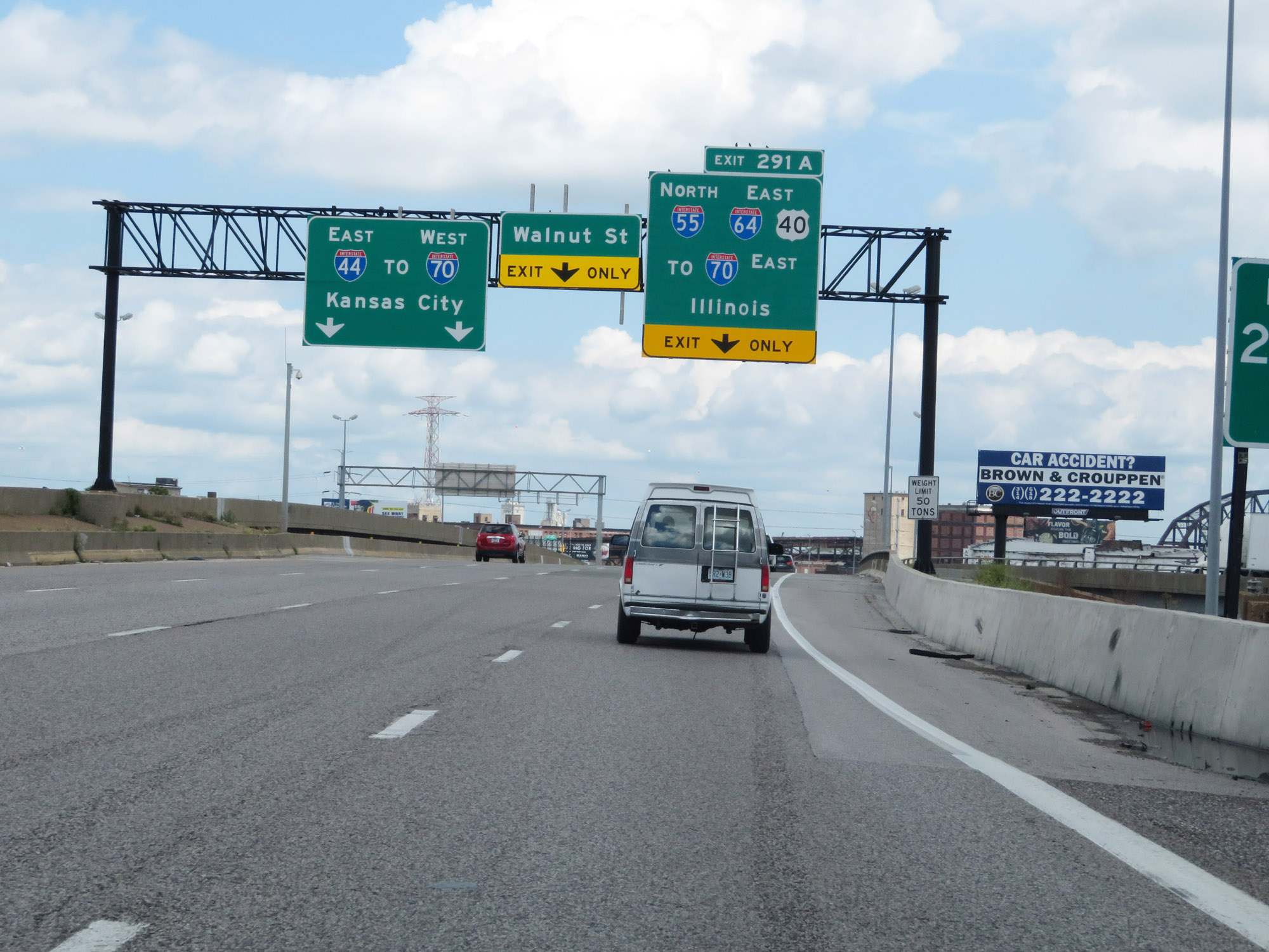 Interstate 55 North / Interstate 44 East at Exit 291A: Interstate 55 North / Interstate 64 East / US 40 East / To Interstate 70 East - Illinois (Photo taken 8/13/19). |