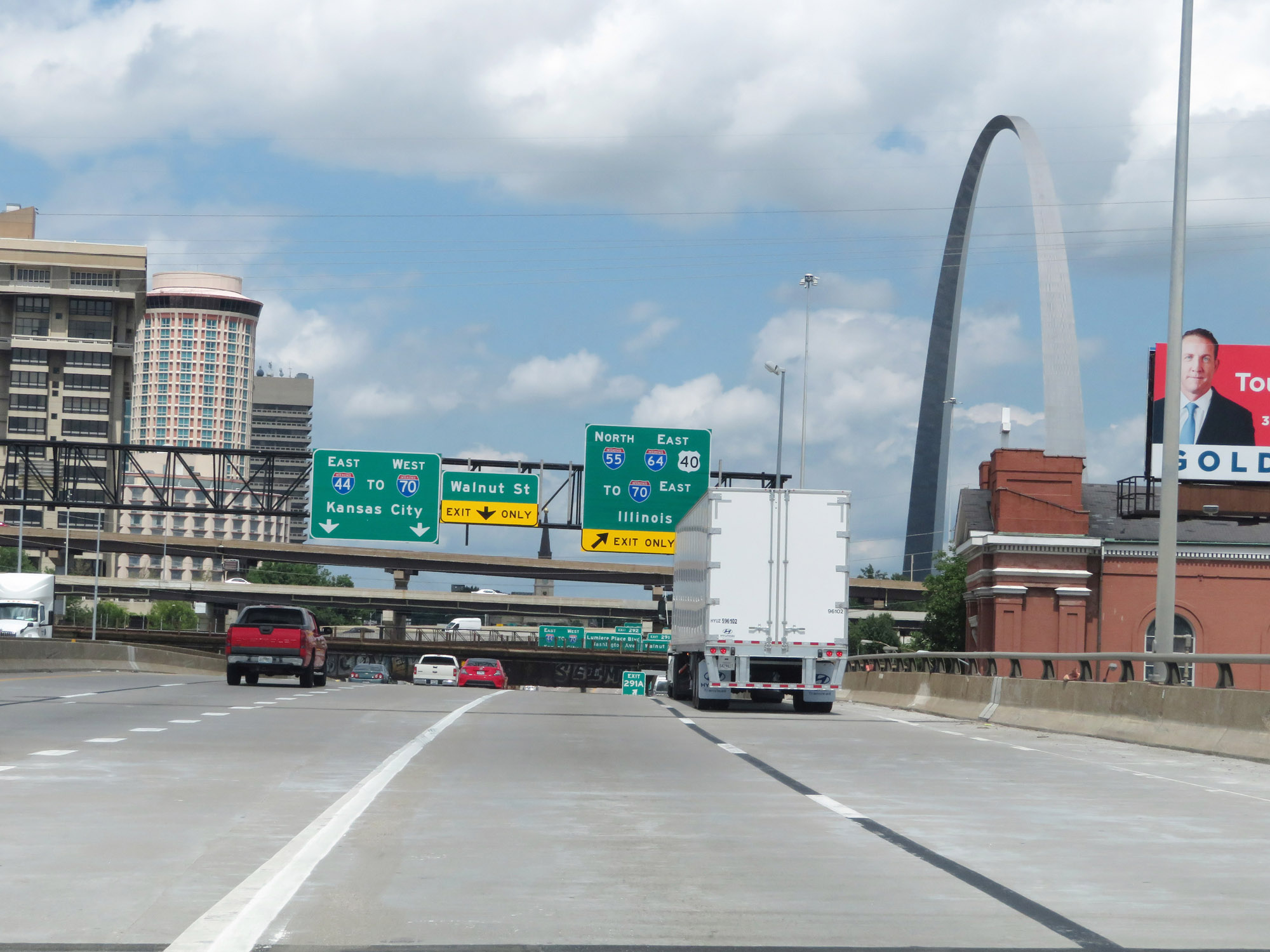 View of the Gateway Arch just before Interstate 55 North departs from Interstate 44 in downtown St. Louis. (Photo taken 8/13/19). |