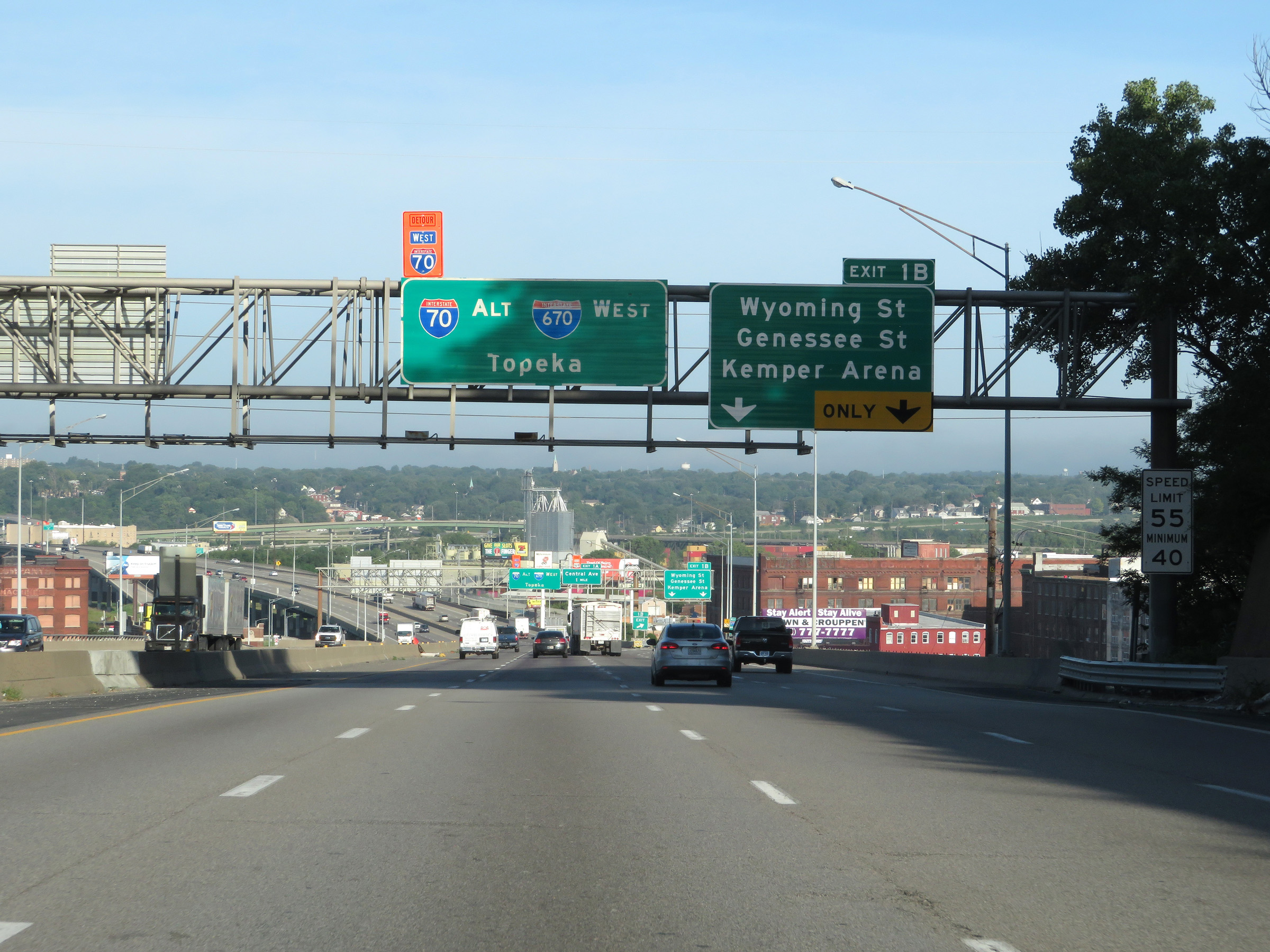 Interstate 670 West at Exit 1B: Wyoming St / Genessee St / Kemper Arena (Photo taken 8/12/20). |