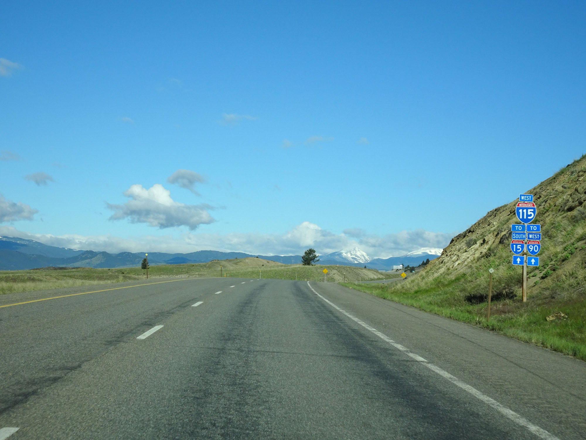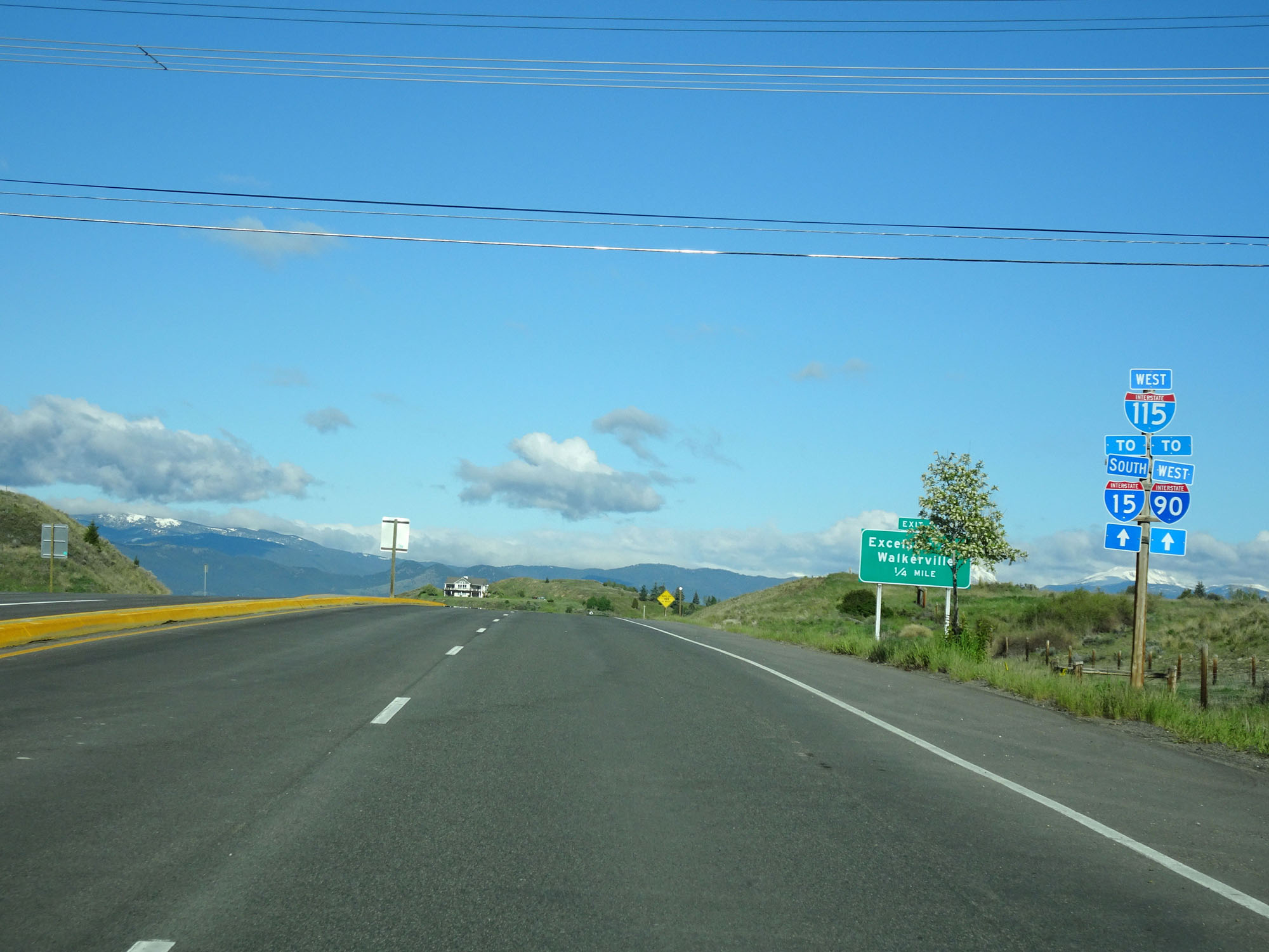 Interstate 115 West at its western terminus as it merges into Interstate 15 South / Interstate 90 West. (Photo taken 5/25/16). |