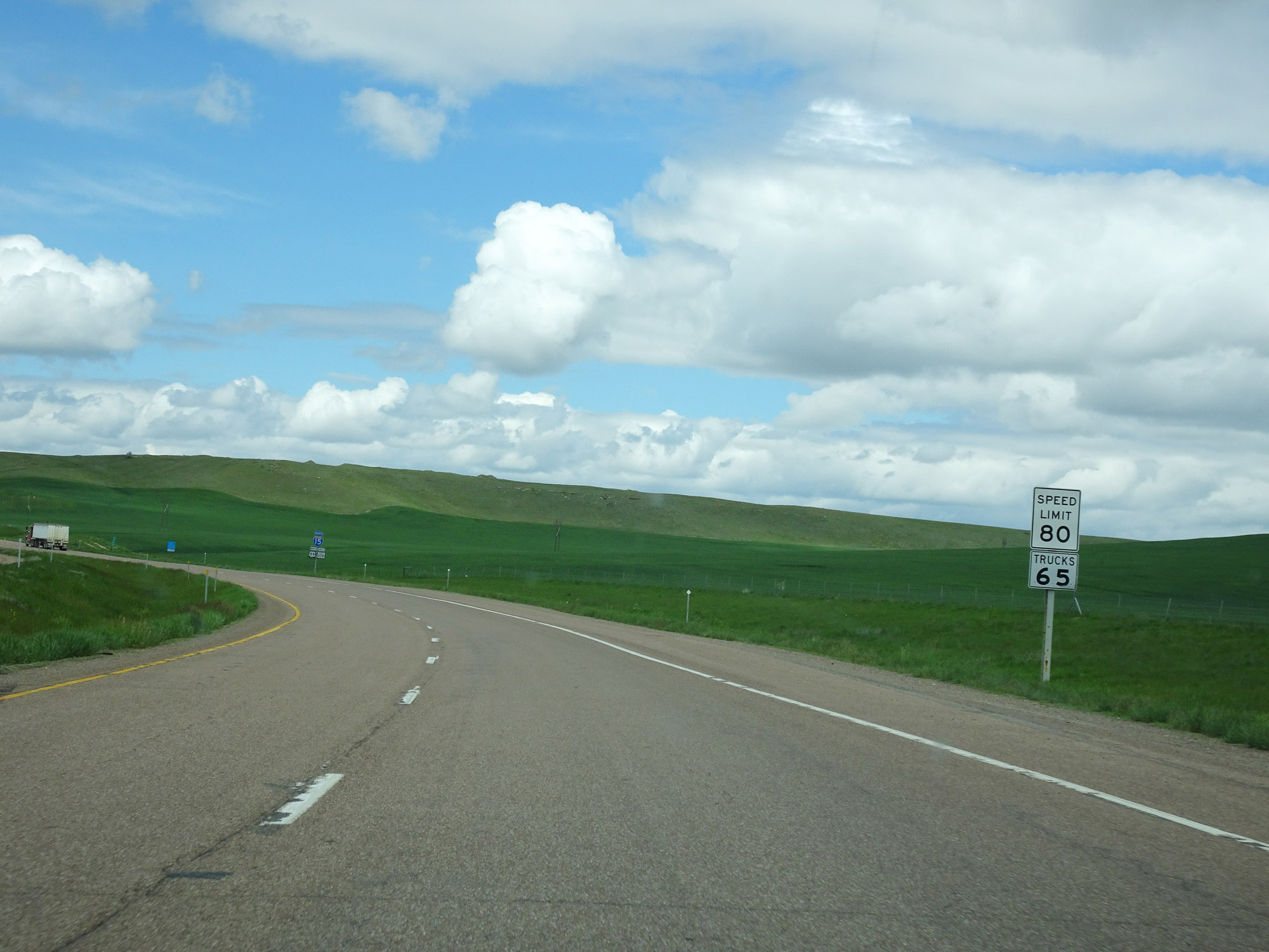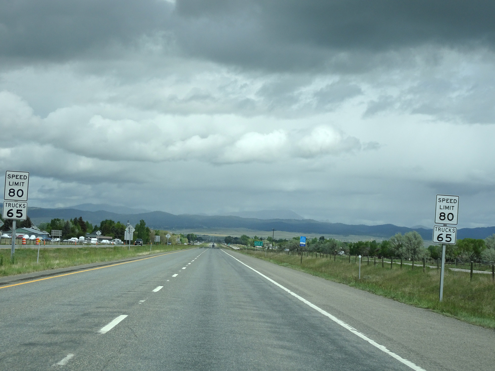 Now that Interstate 15 North has departed from Interstate 90 to head north toward Helena and Great Falls, the standard rural speed limits of 80 mph for cars and 65 mph for trucks resume. (Photo taken 5/24/16). |