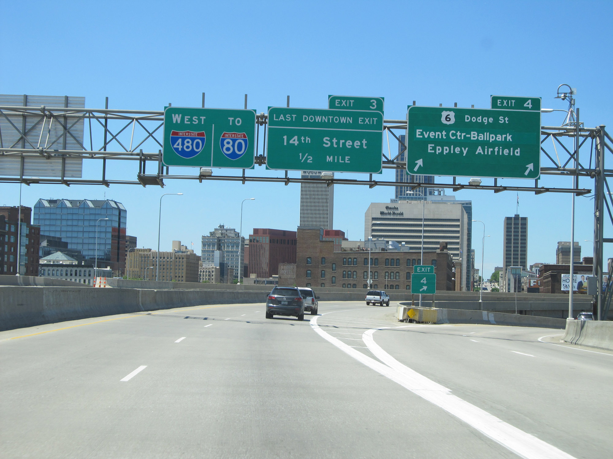 Interstate 480 West at Exit 4: US 6 - Dodge St / Event Center-Ballpark / Eppley Airfield (Photo taken 5/29/16). |