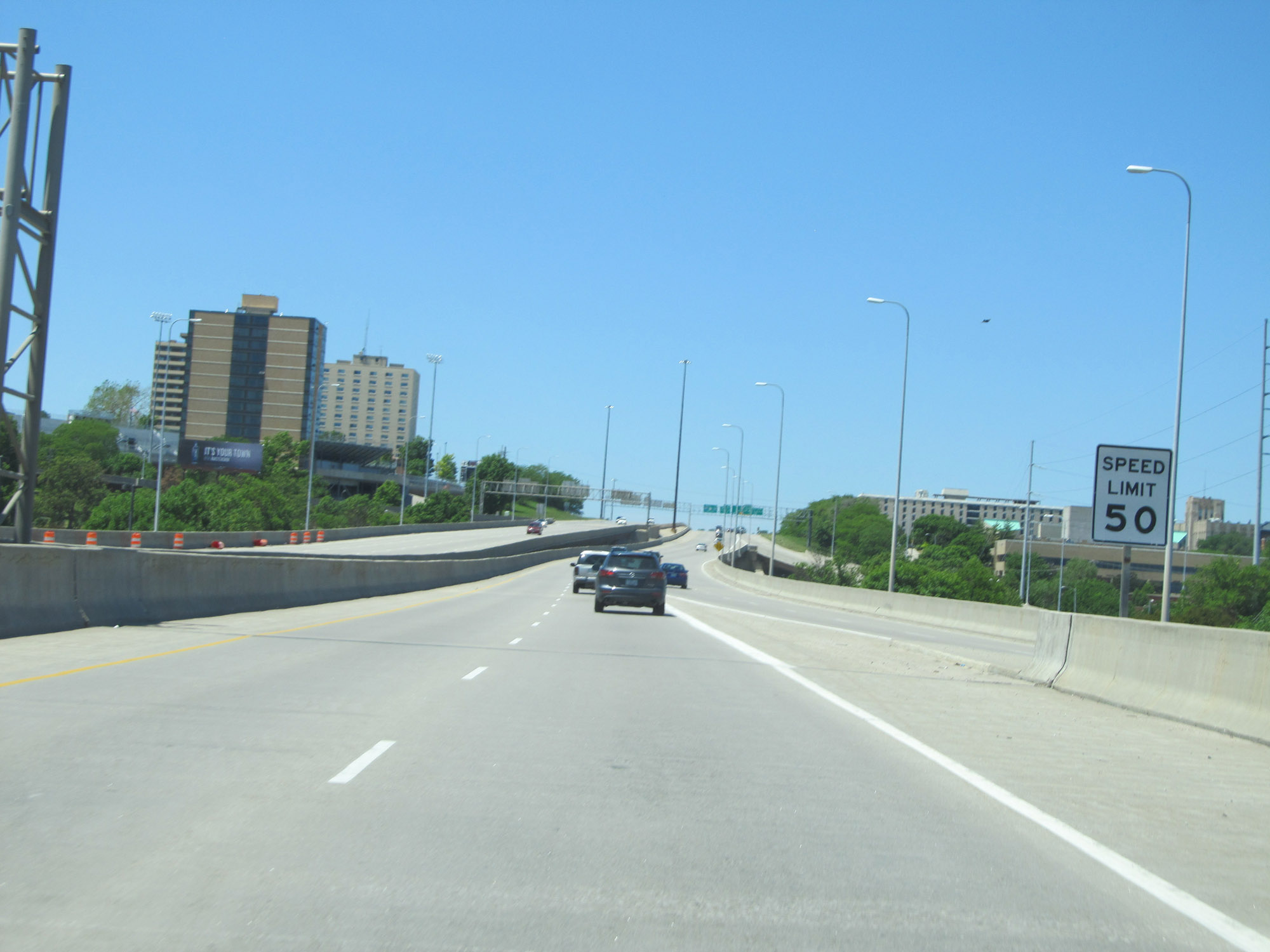 The speed limit on Interstate 480 West starts out at 50 mph in downtown Omaha. (Photo taken 5/29/16). |