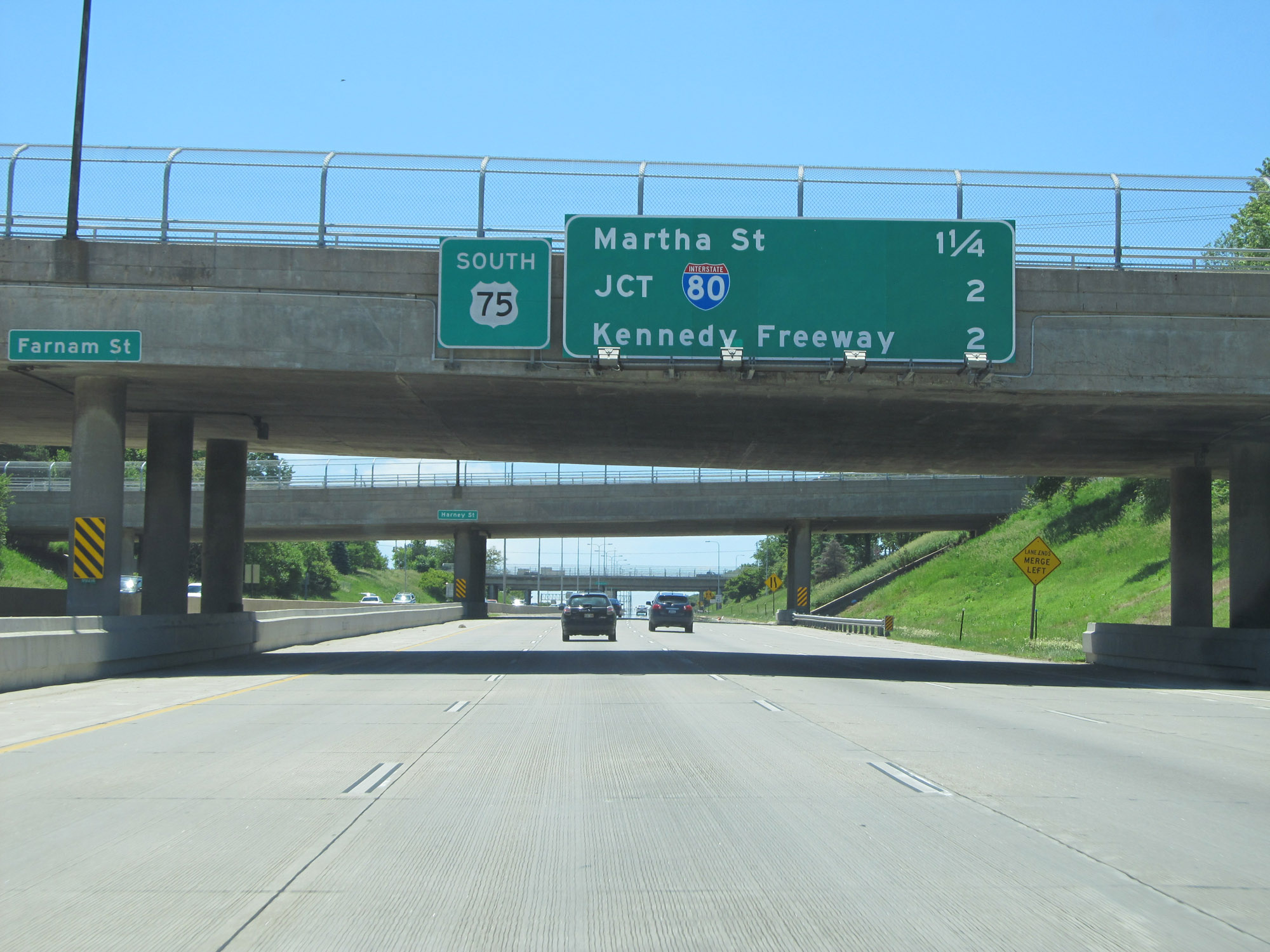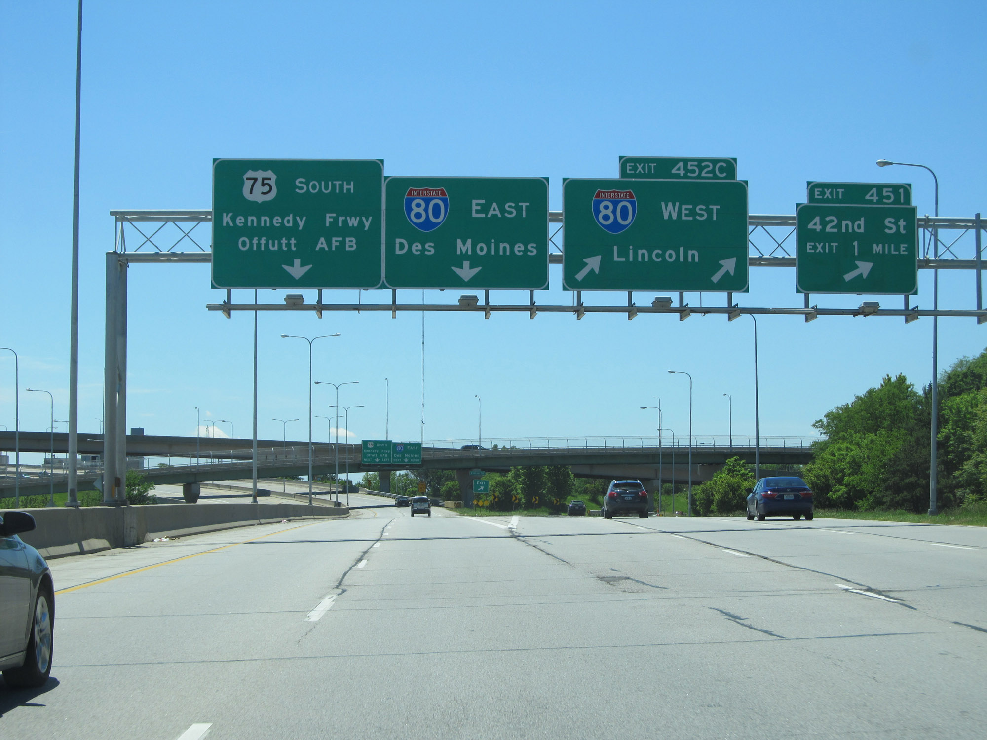 At the western/southern terminus of Interstate 480, US 75 continues southbound and departs from Interstate 80. Use the left lane here to continue southbound on US 75. Use the right lane to go onto Interstate 80 East. (Photo taken 5/29/16). |