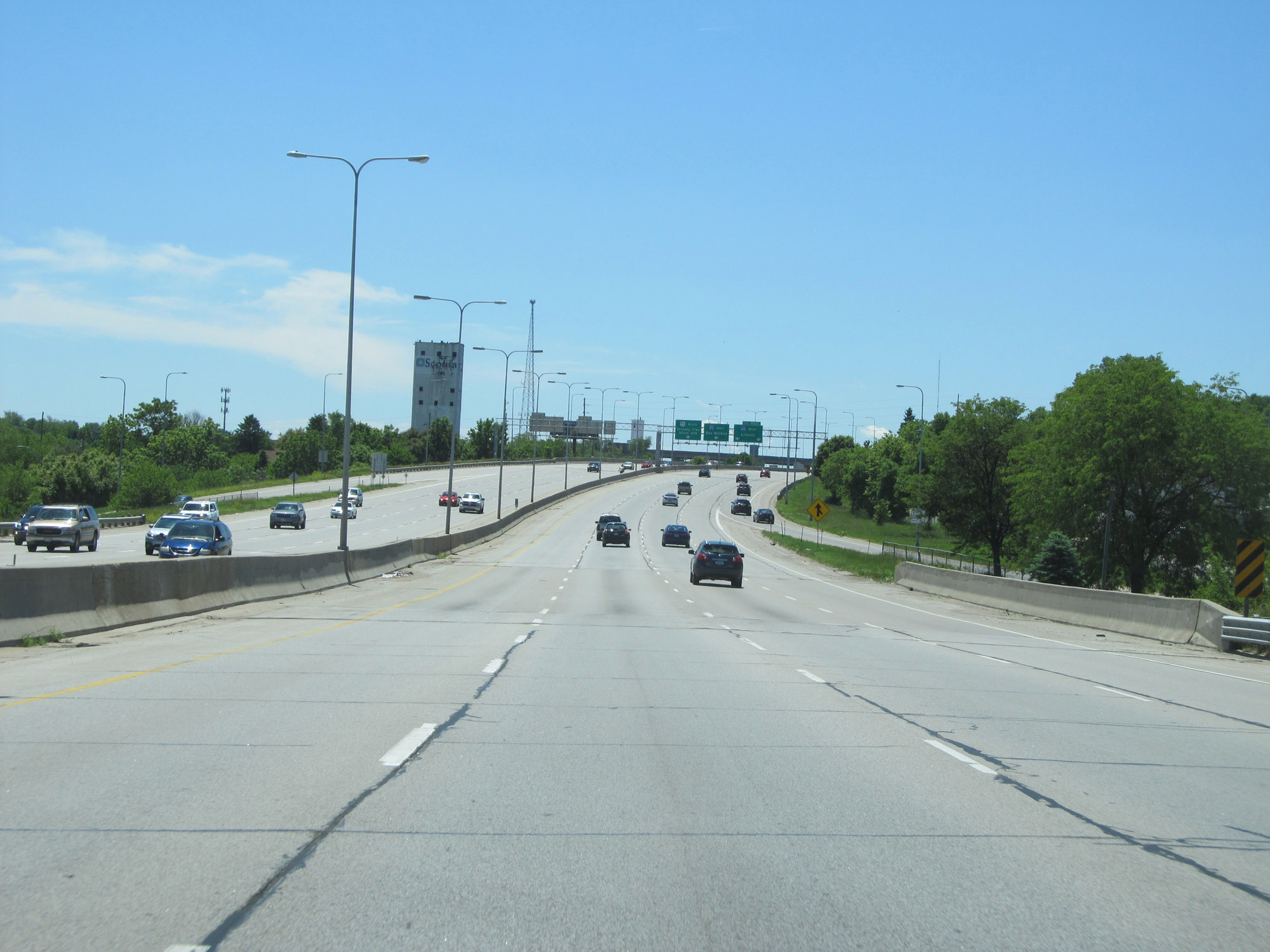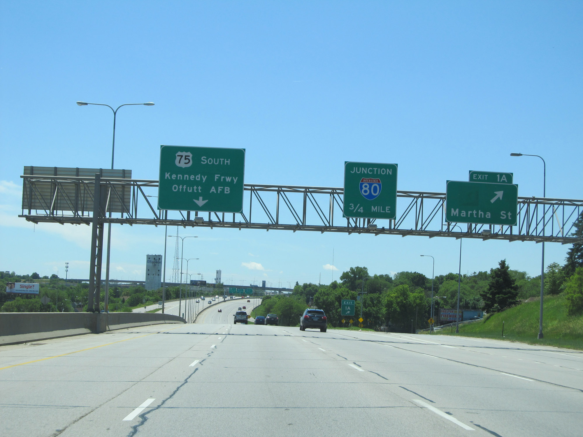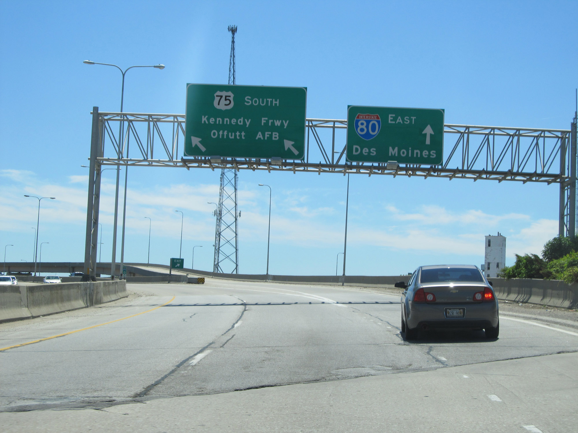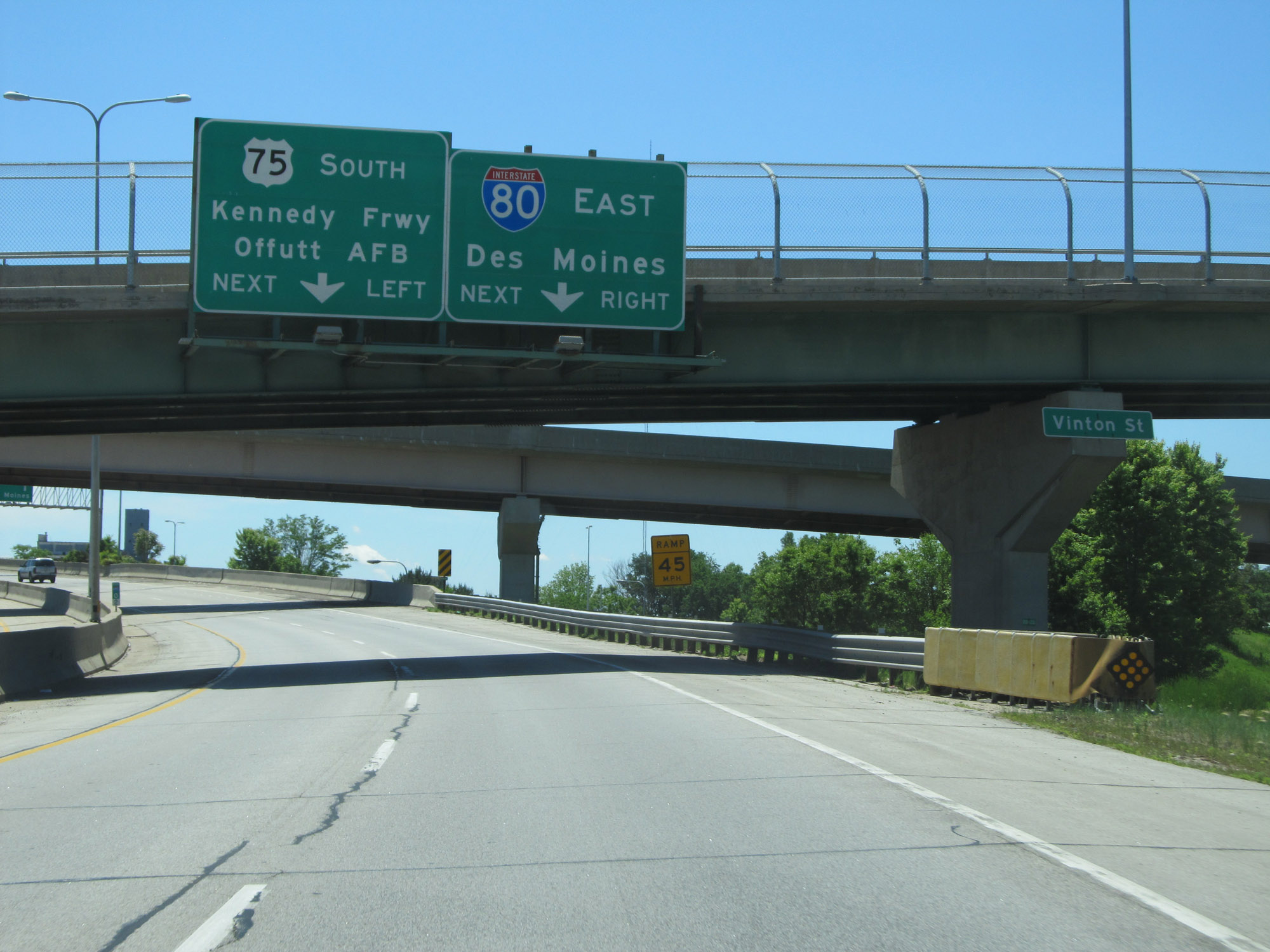 At this point, US 75 continues southbound via the two left lanes. Traffic to Interstate 80 East must exit off to the right here. (Photo taken 5/29/16). |
