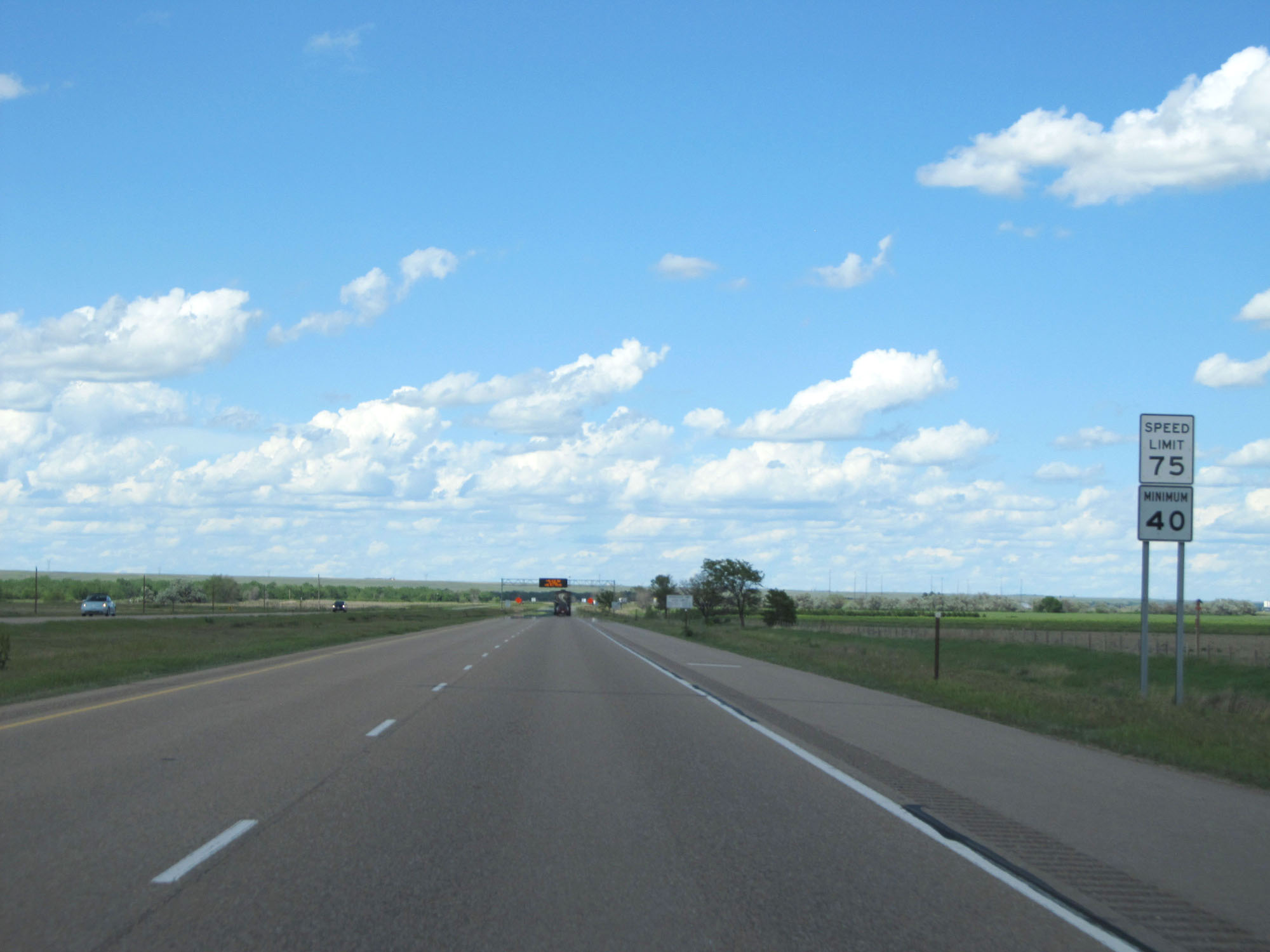 Speed limit signs upon entering Nebraska on Interstate 76 East. The speed limit on most rural stretches of Interstate in Nebraska is 75 mph with a minimum speed limit of 40 mph. (Photo taken 5/28/16). |