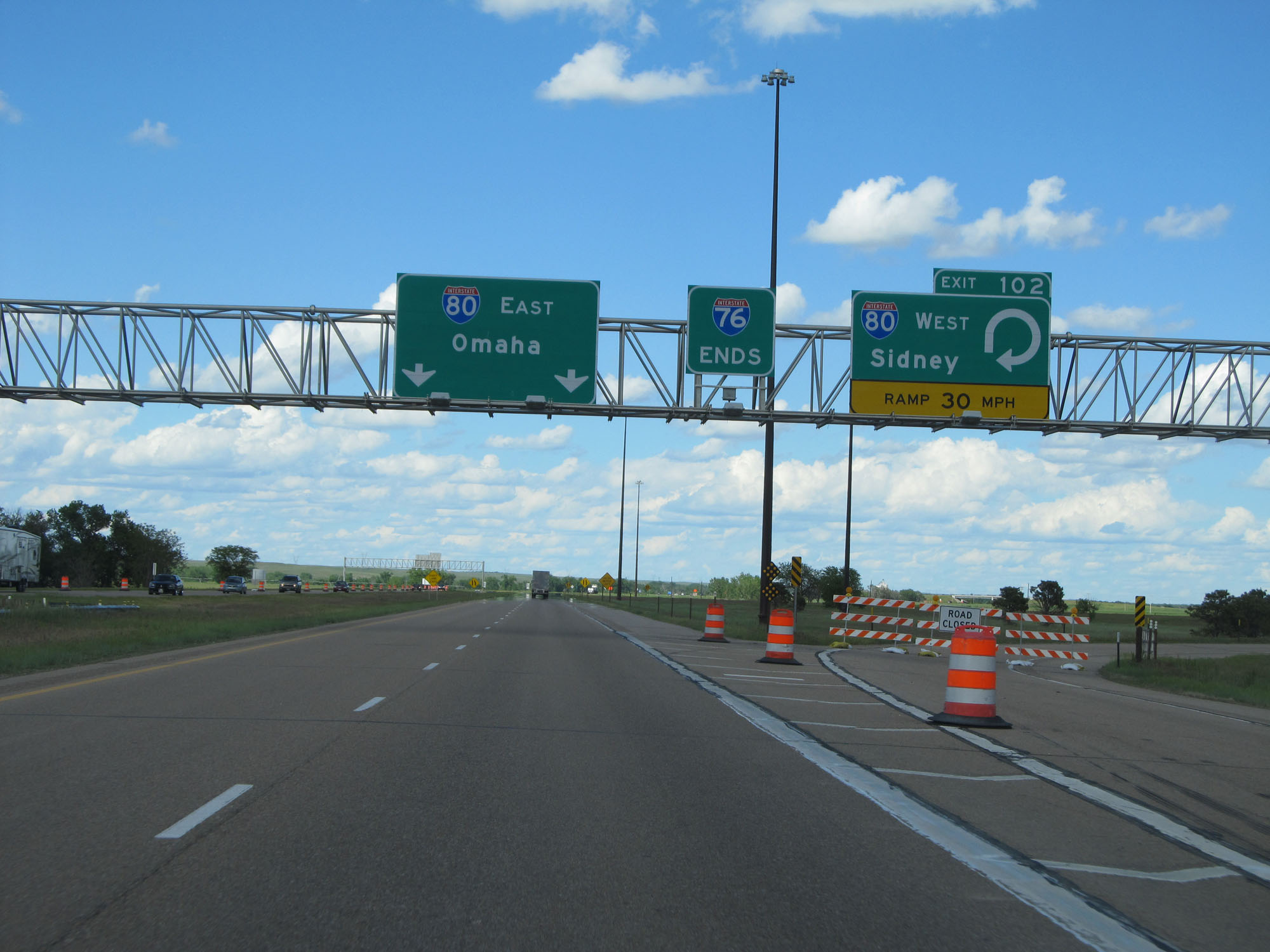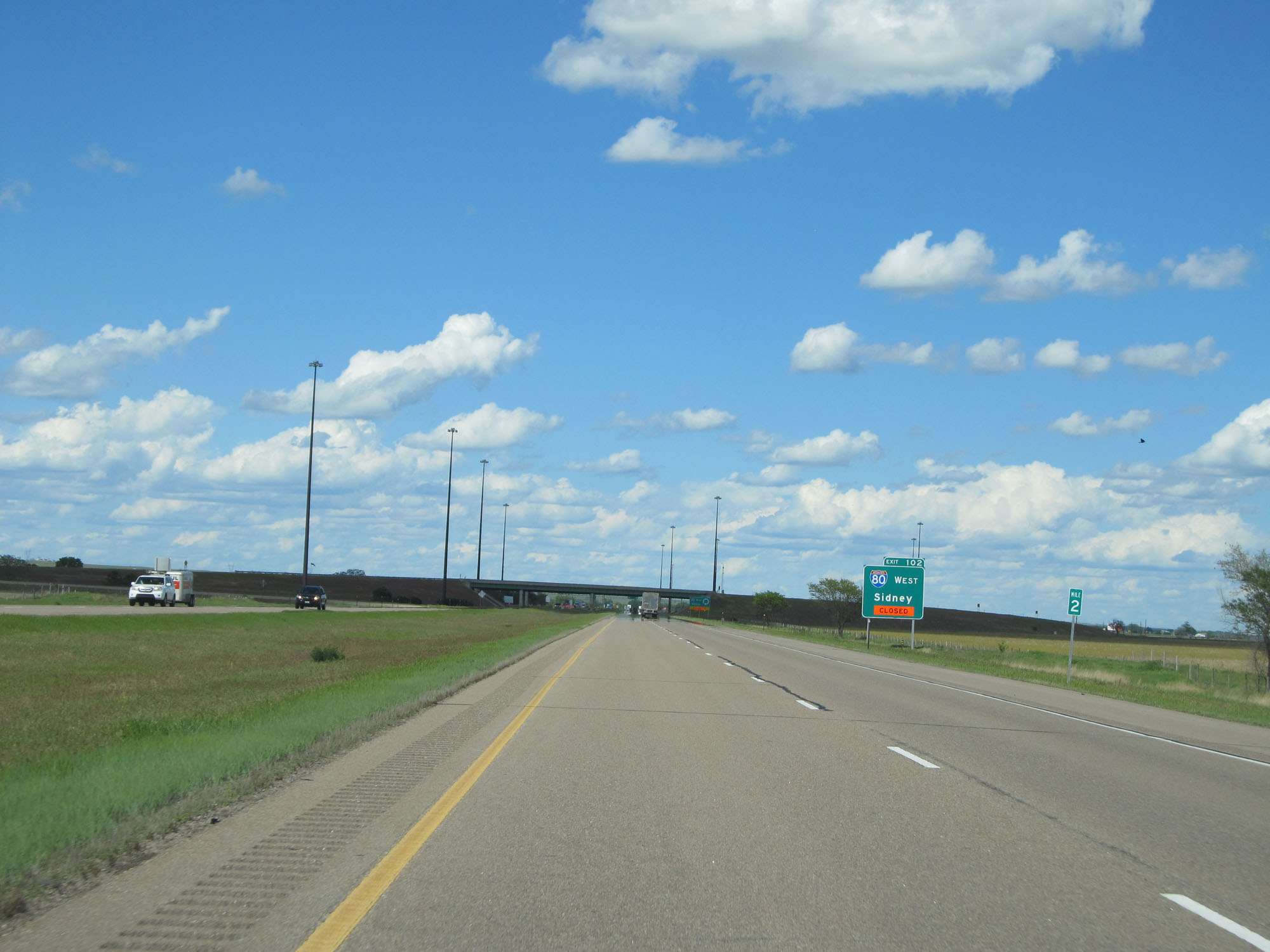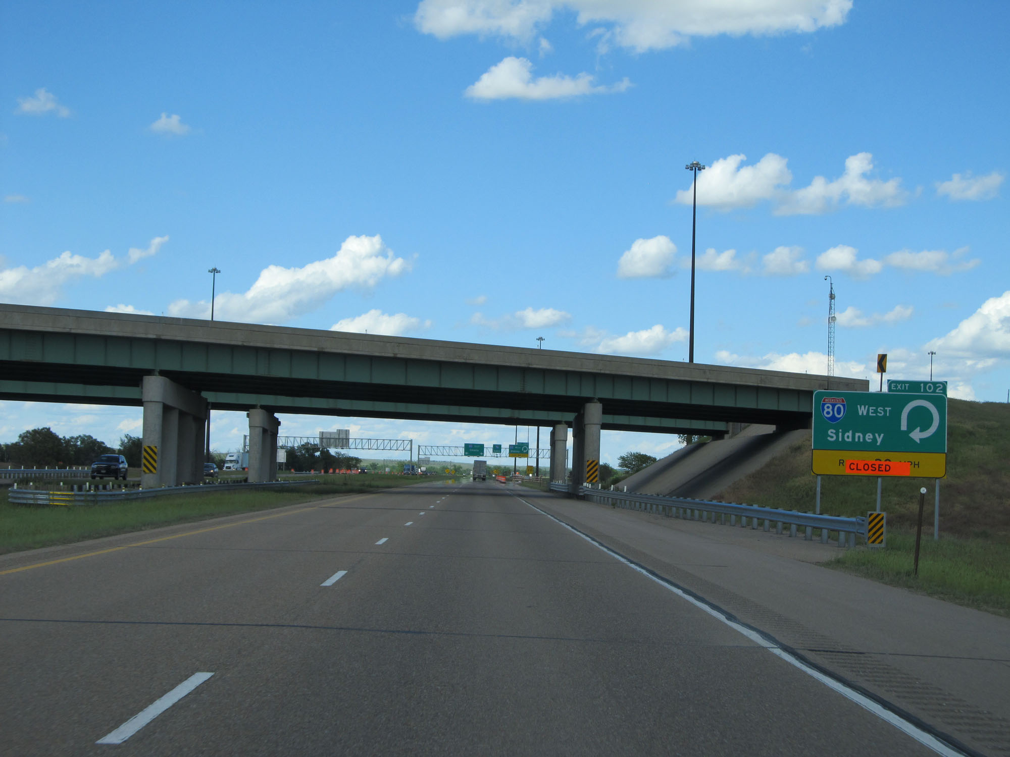 Interstate 76 East at Exit 102: Interstate 80 West - Sidney. Since this exit was closed at the time, traffic headed to I-80 West would have to proceed on I-80 East to Big Springs and get turned around. I-76 ends just ahead, as it prepares to merge into I-80 Eastbound's single lane at the time. (Photo taken 5/28/16). |