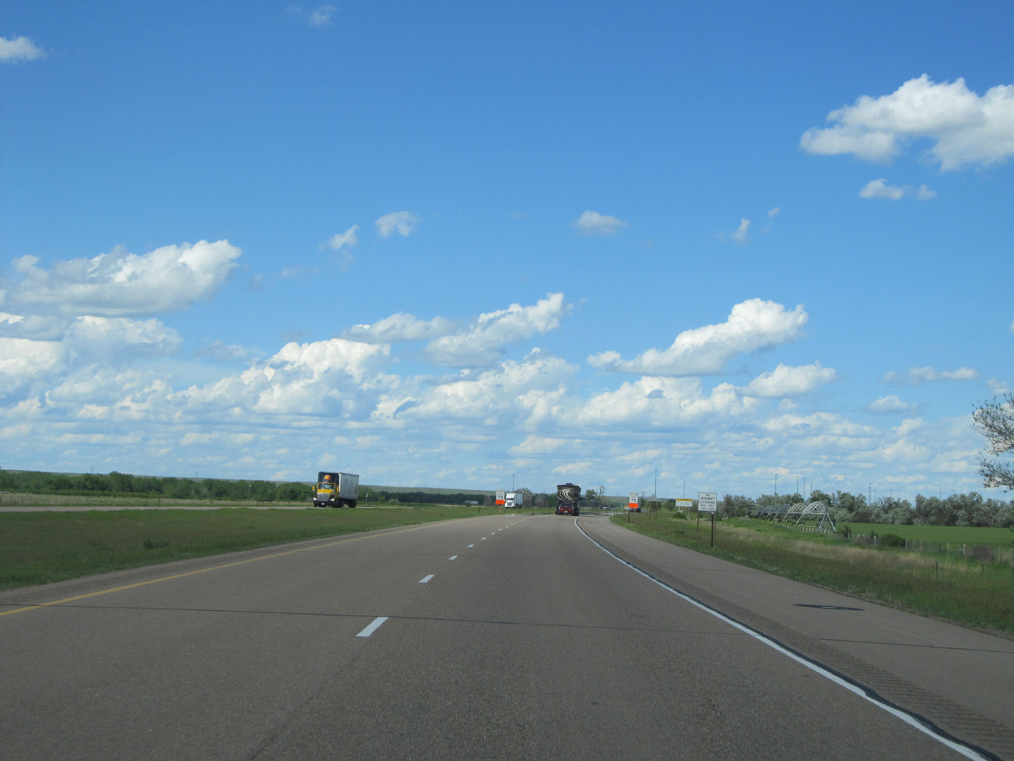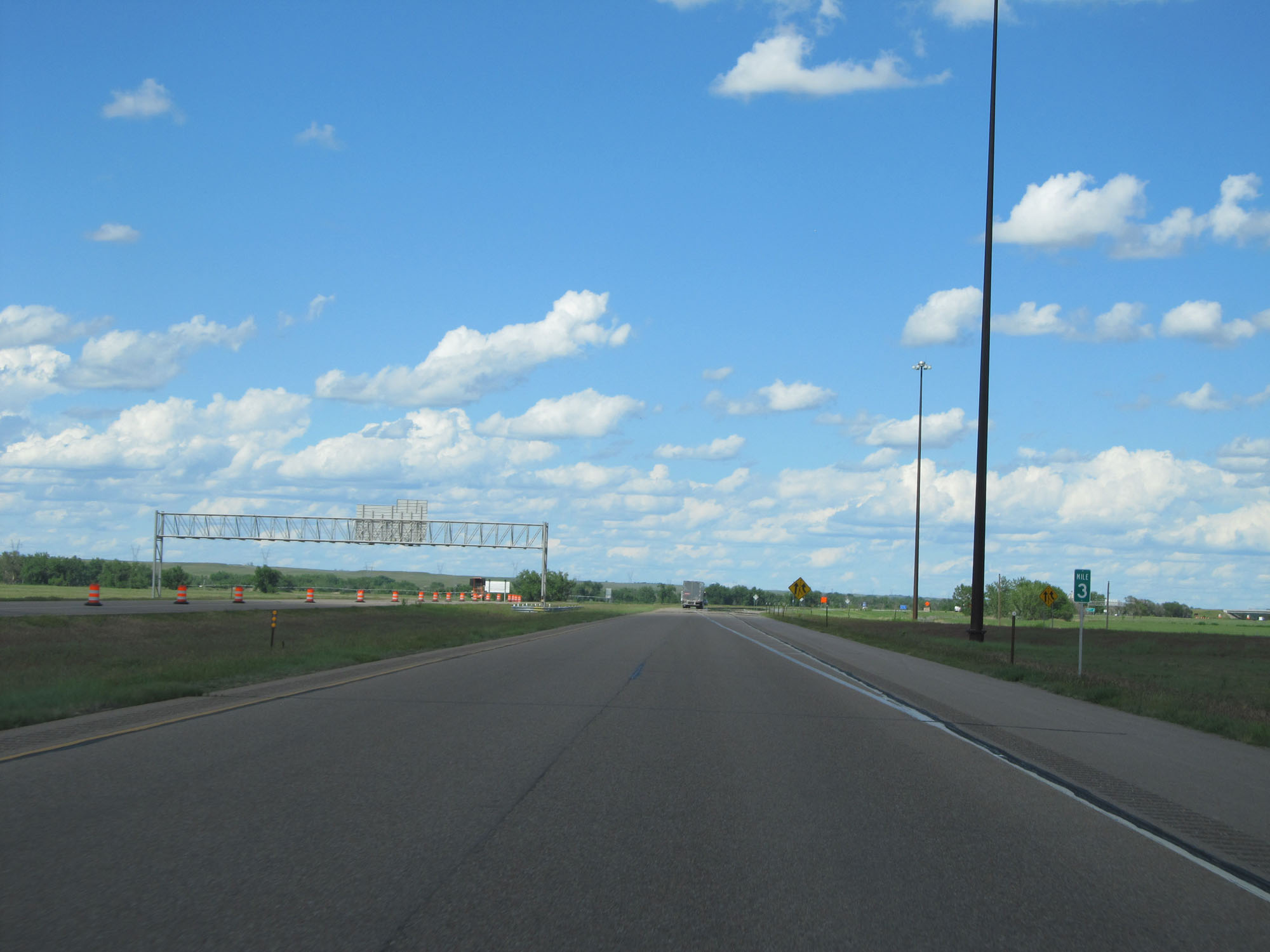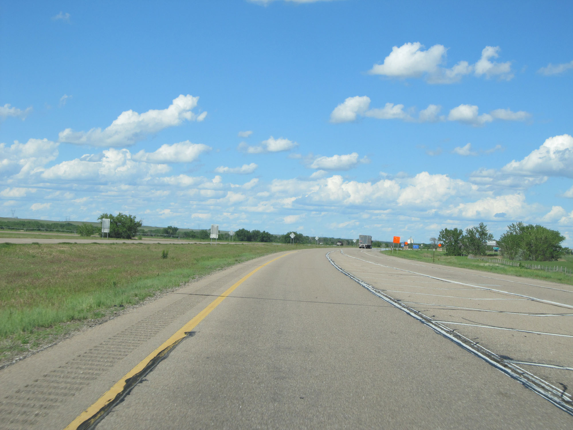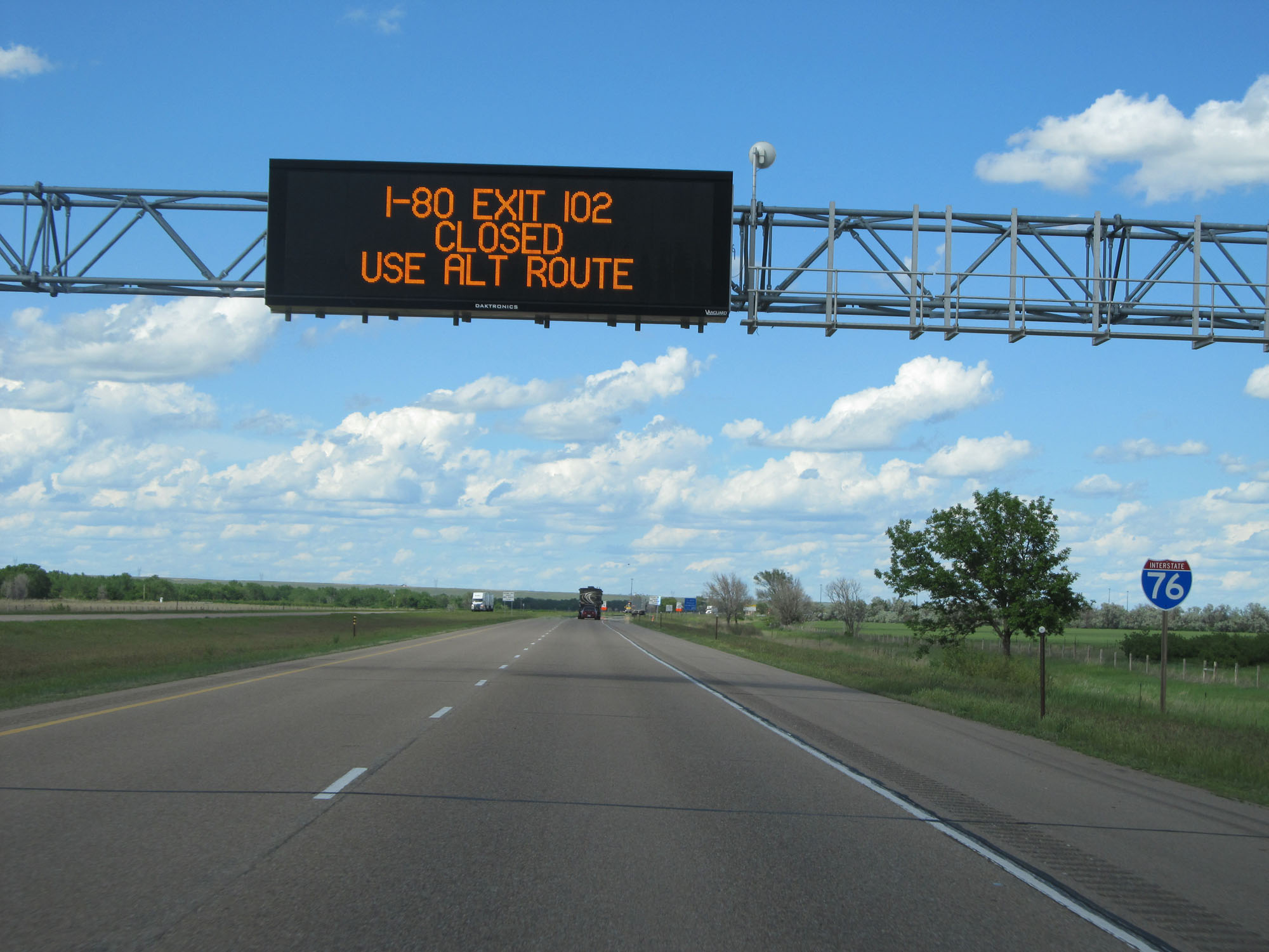 Interstate 76 East at Exit 102: Interstate 80 West - Sidney. Since this exit was closed at the time, traffic headed to I-80 West would have to proceed on I-80 East to Big Springs and get turned around. I-76 ends just ahead, as it prepares to merge into I-80 Eastbound's single lane at the time. (Photo taken 5/28/16). |