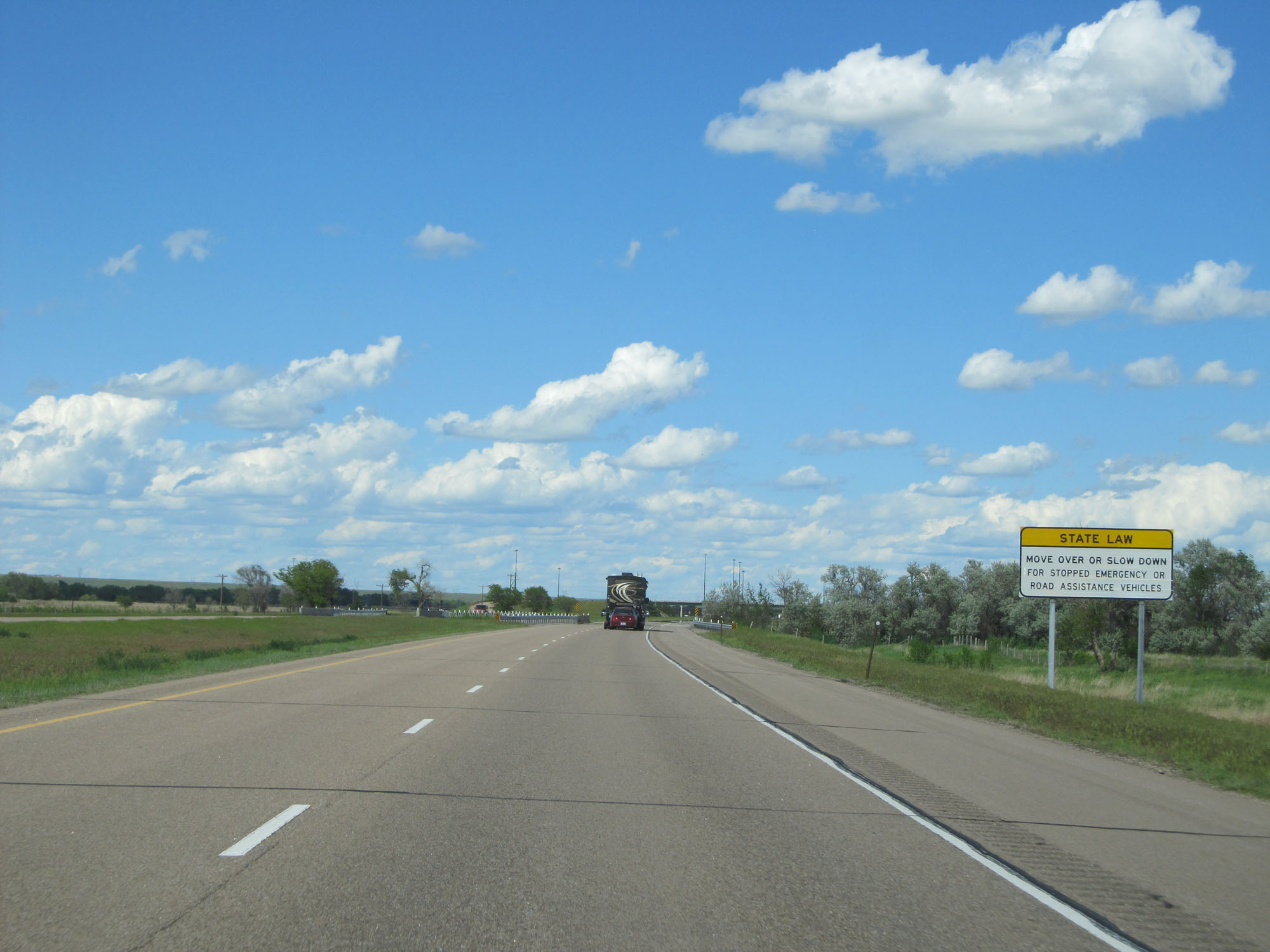This sign states that Nebraska state law requires vehicles to move over or slow down for stopped emergency or road assistance vehicles. (Photo taken 5/28/16). |