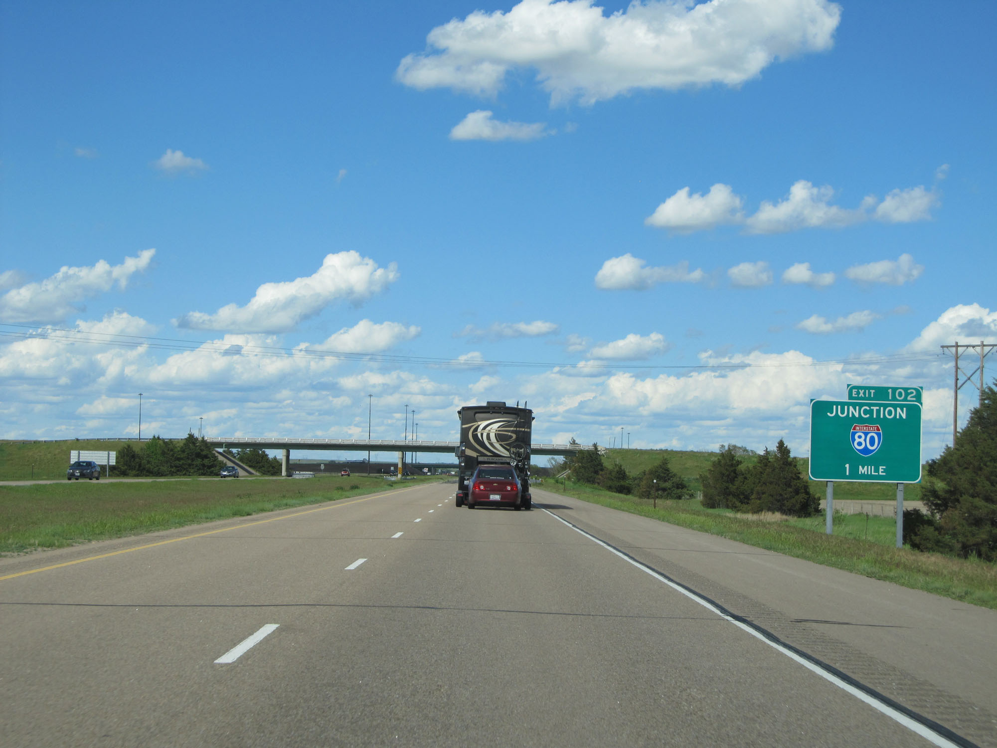 Interstate 76 East as it nears the ramp for Exit 102 (Interstate 80 West toward Sidney) and prepares to pass under Interstate 80's eastbound lane. I-80 actually is reduced down to one lane in each direction briefly during this interchange, which is rather odd. (Photo taken 5/28/16). |